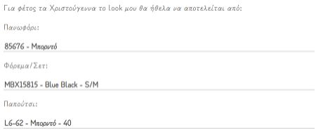 6) Τα προϊόντα που θα επιλέξουν οι συμμετέχοντες πρέπει να επιλέξουν ένα φόρεμα ή ένα σετ, ένα πανωφόρι και παπούτσια. Σε κάθε προϊόν πρέπει να αναφράφεται ο κωδικός, το χρώμα και το μέγεθος σε περίπτωση που το προϊόν δεν είναι One size. Ο κωδικός του προϊόντος βρίσκεται κάτω από την φωτογραφία του. Παράδειγμα: