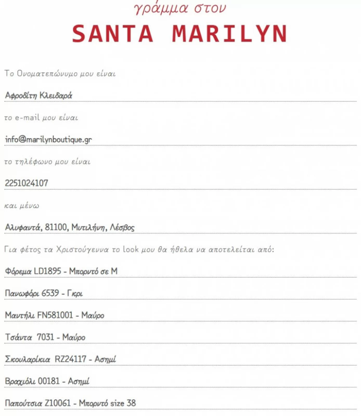 15) Η συμμετοχή και τα δώρα είναι απολύτως προσωποπαγή, ανεπίδεκτα μεταβιβάσεως και δεν ανταλλάσσονται με χρήματα. Μοναδική υποχρέωση της MARILYN BOUTIQUE (ΚΛΕΙΔΑΡΑ ΑΦΡΟΔΙΤΗ ΙΚΕ) είναι η εξασφάλιση για τα δώρα των νικητών που κέρδισαν.