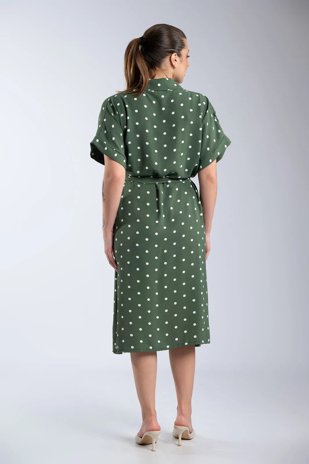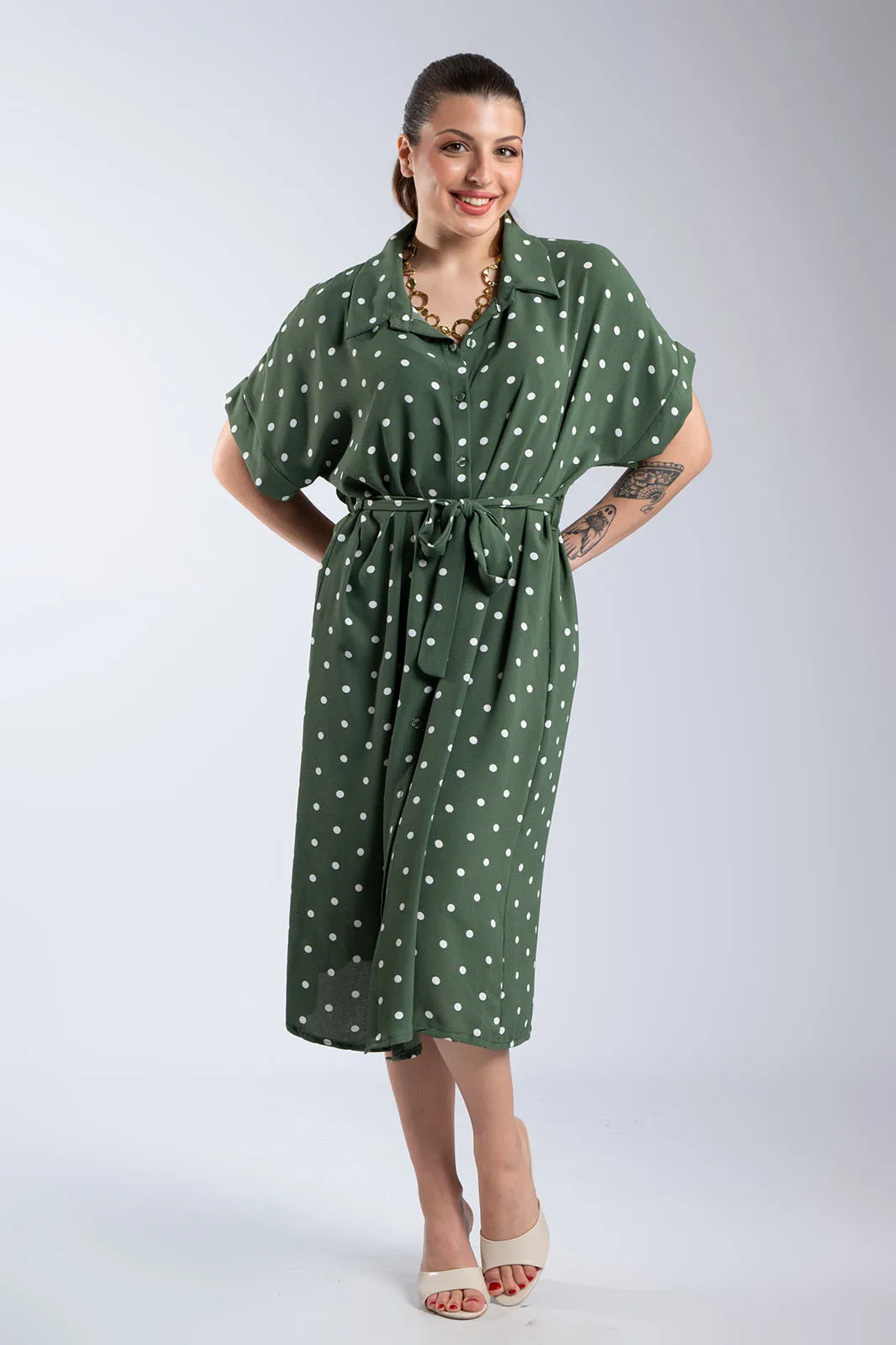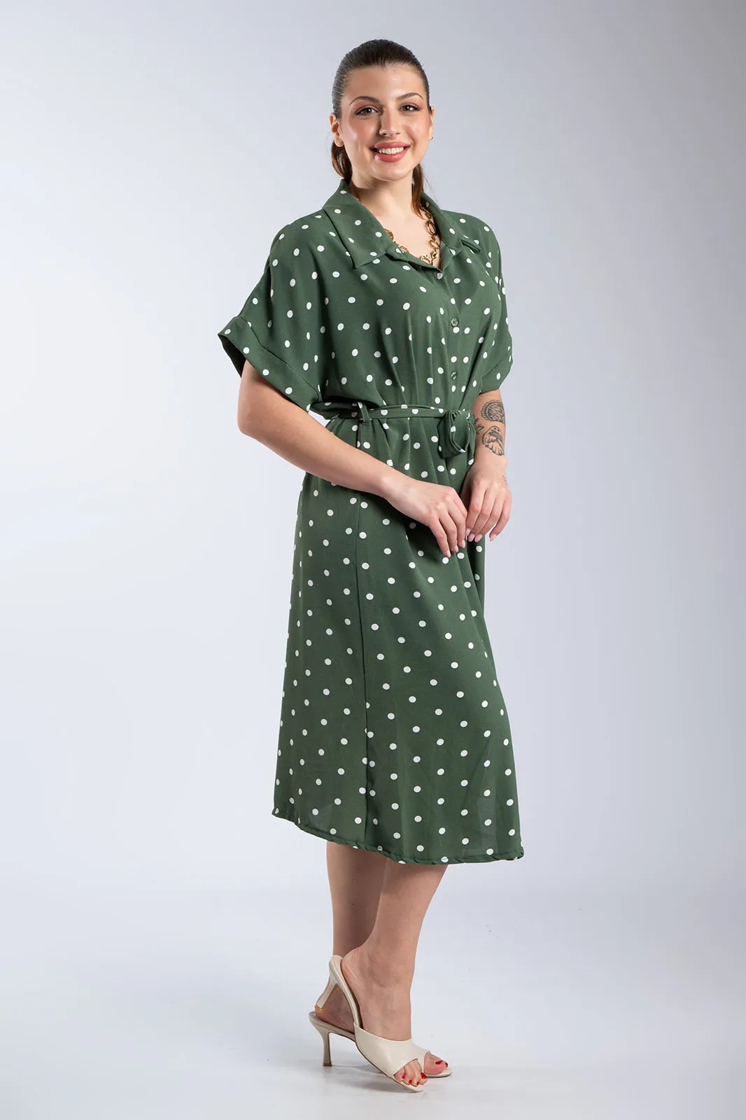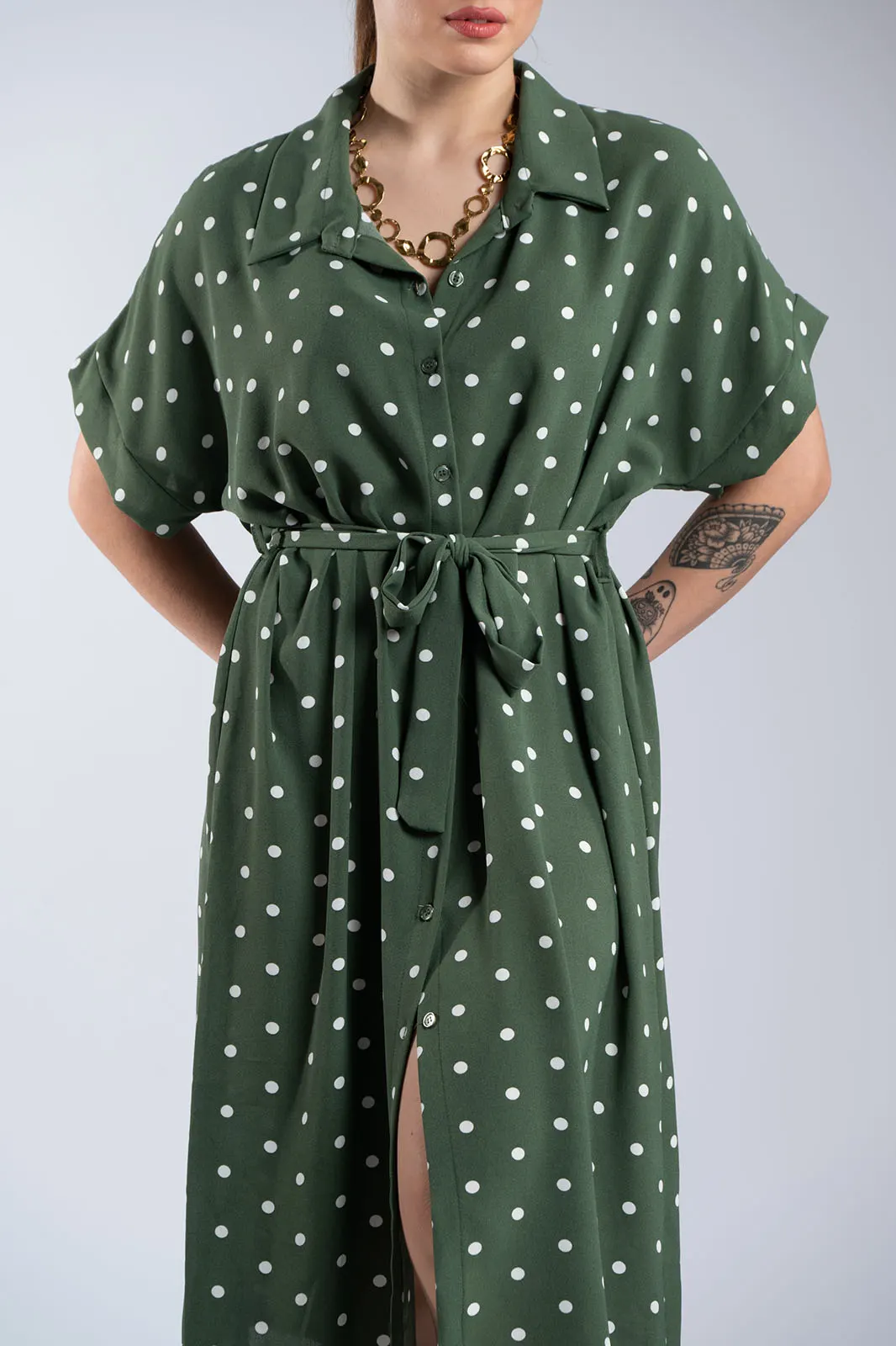 Αέρινο φόρεμα σεμιζιέ με διαχρονικό πουά σχέδιο, ιδανικό για κομψές και effortless εμφανίσεις. Διαθέτει γιακά και κουμπιά σε όλο το μήκος, προσφέροντας πρακτικότητα και στυλ. Η αποσπώμενη ζώνη στη μέση τονίζει τη σιλουέτα και σου δίνει τη δυνατότητα να προσαρμόσεις την εφαρμογή όπως επιθυμείς. Τα κοντά μανίκια και η άνετη γραμμή το καθιστούν ιδανική επιλογή για καθημερινές αλλά και πιο προσεγμένες εμφανίσεις.