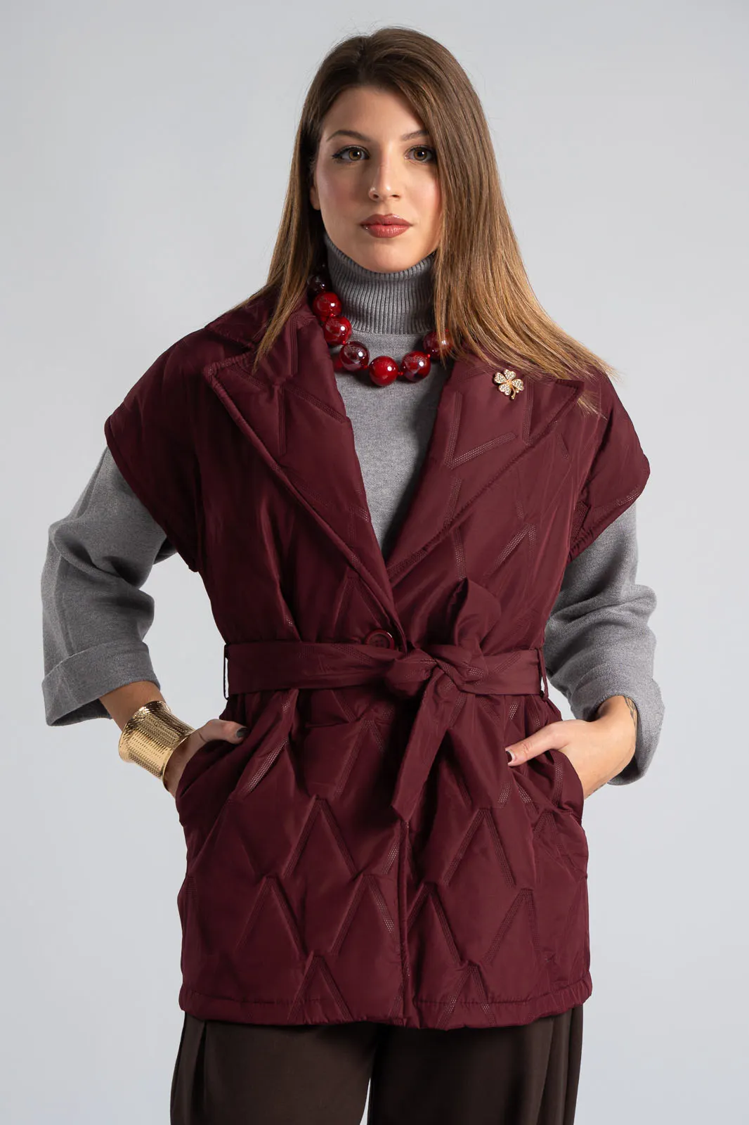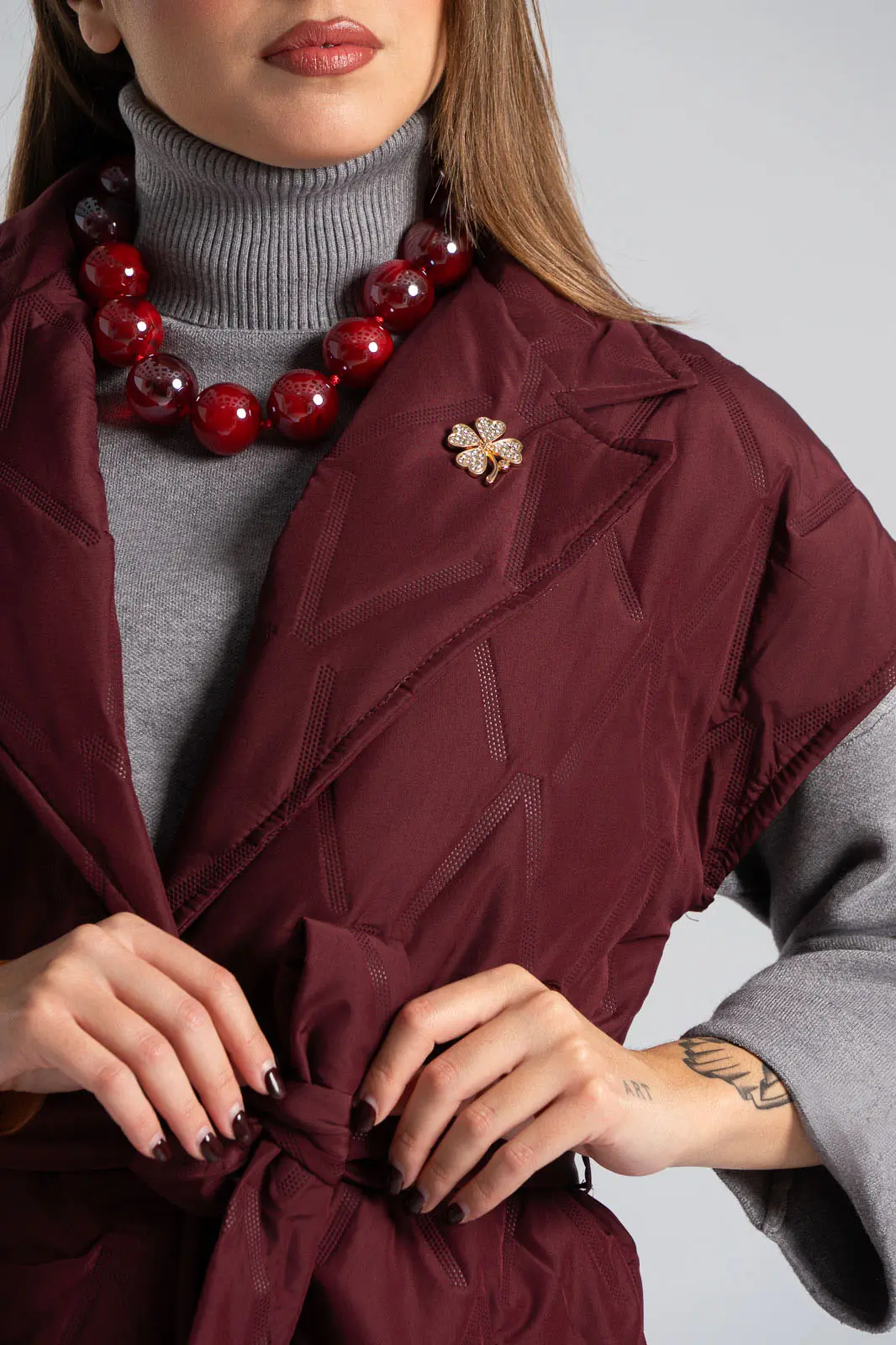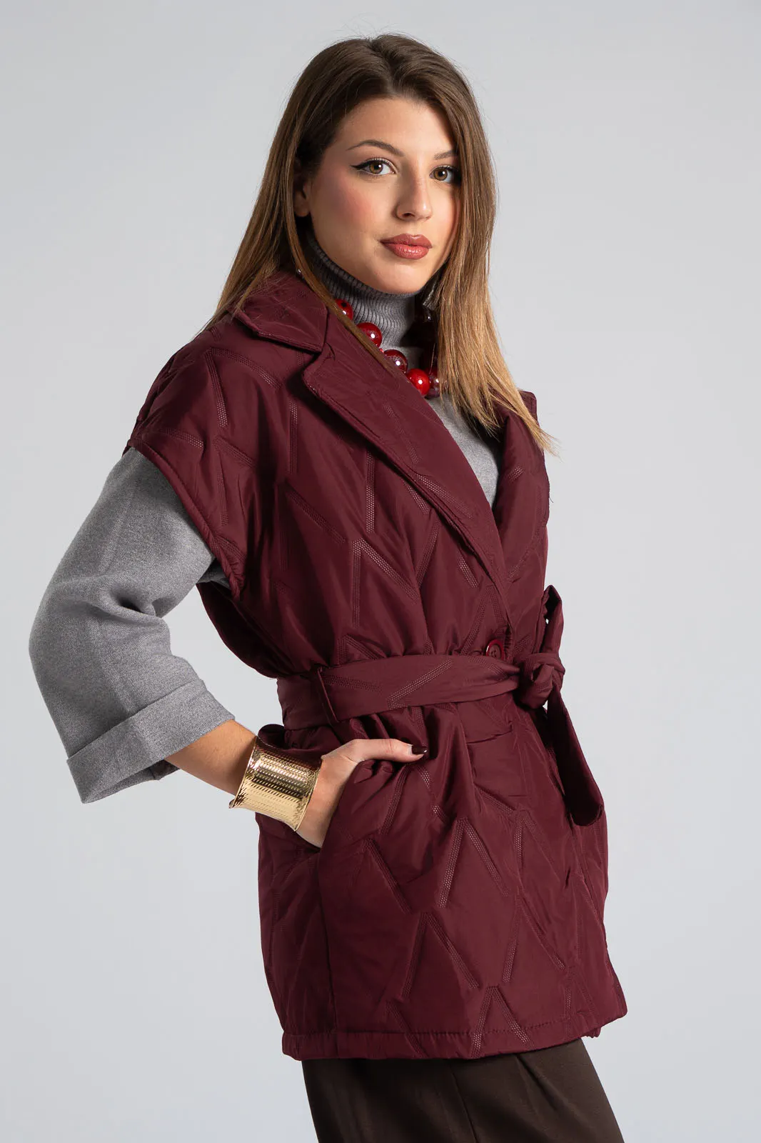 Μπουφάν καπιτονέ. Έχει γιακά και κλείνει με ένα κουμπί. Είναι αμάνικο. Έχει δική του ζώνη στην ίδια απόχρωση και υφή. Είναι φοδραρισμένο. Στα πλαινά διαθέτει τσέπες. Στο πέτο έχει διακοσμητική αποσπώμενη καρφίτσα. Η μέτρηση έχει γίνει με κλειστό κουμπί. Οι μετρήσεις του πίνακα είναι αντιπροσωπευτικές για κάθε προϊόν. 100% polyester.