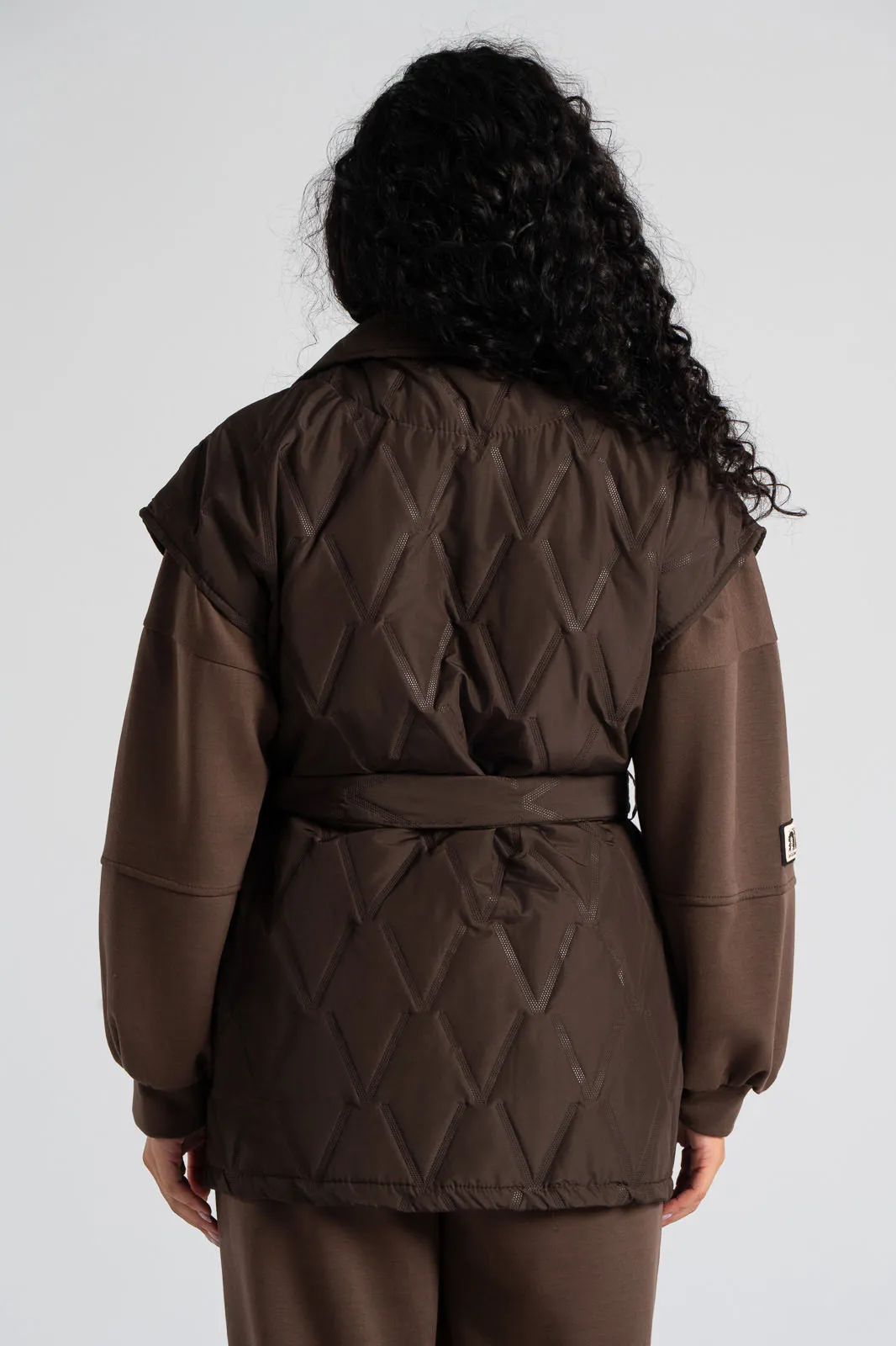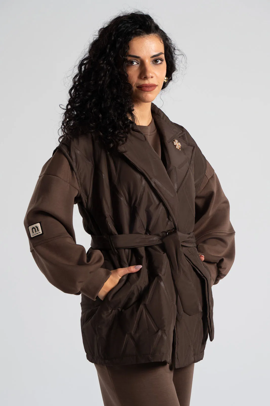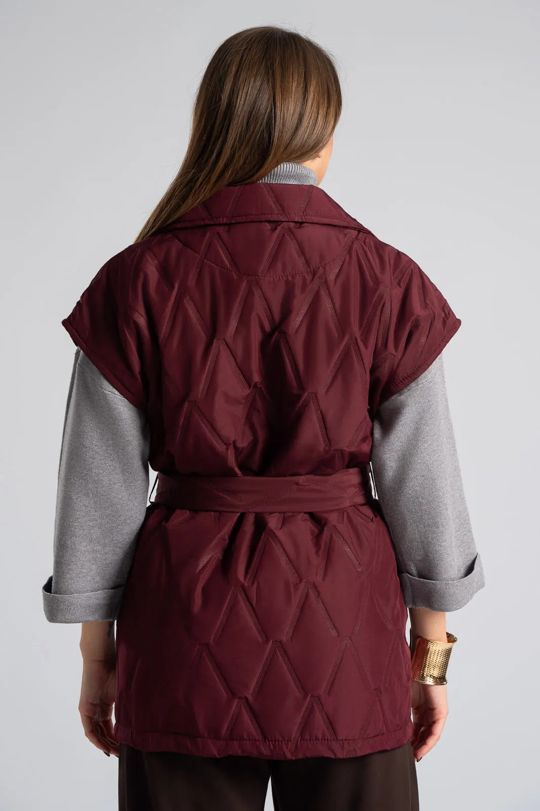 Μπουφάν καπιτονέ. Έχει γιακά και κλείνει με ένα κουμπί. Είναι αμάνικο. Έχει δική του ζώνη στην ίδια απόχρωση και υφή. Είναι φοδραρισμένο. Στα πλαινά διαθέτει τσέπες. Στο πέτο έχει διακοσμητική αποσπώμενη καρφίτσα. Η μέτρηση έχει γίνει με κλειστό κουμπί. Οι μετρήσεις του πίνακα είναι αντιπροσωπευτικές για κάθε προϊόν. 100% polyester.
