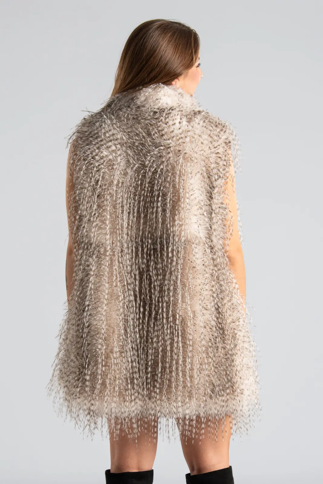 Αμάνικο πανωφόρι με οικολογική συνθετική γούνα που προσφέρει κομψότητα και πολυτέλεια. Έχει γιακά και πλαϊνά έχει τσέπες. Σε όλη την επιφάνεια έχει λεπτά νήματα φτερών. Εσωτερικά διαθέτει σατέν επένδυση. Κλείνει με κόπιτσες. Οι μετρήσεις του πίνακα είναι αντιπροσωπευτικές για κάθε προϊόν. 100% polyester.