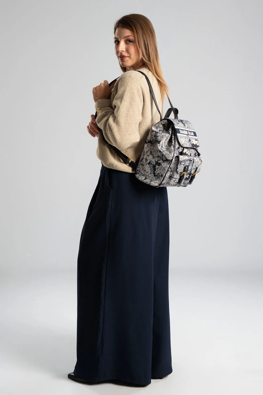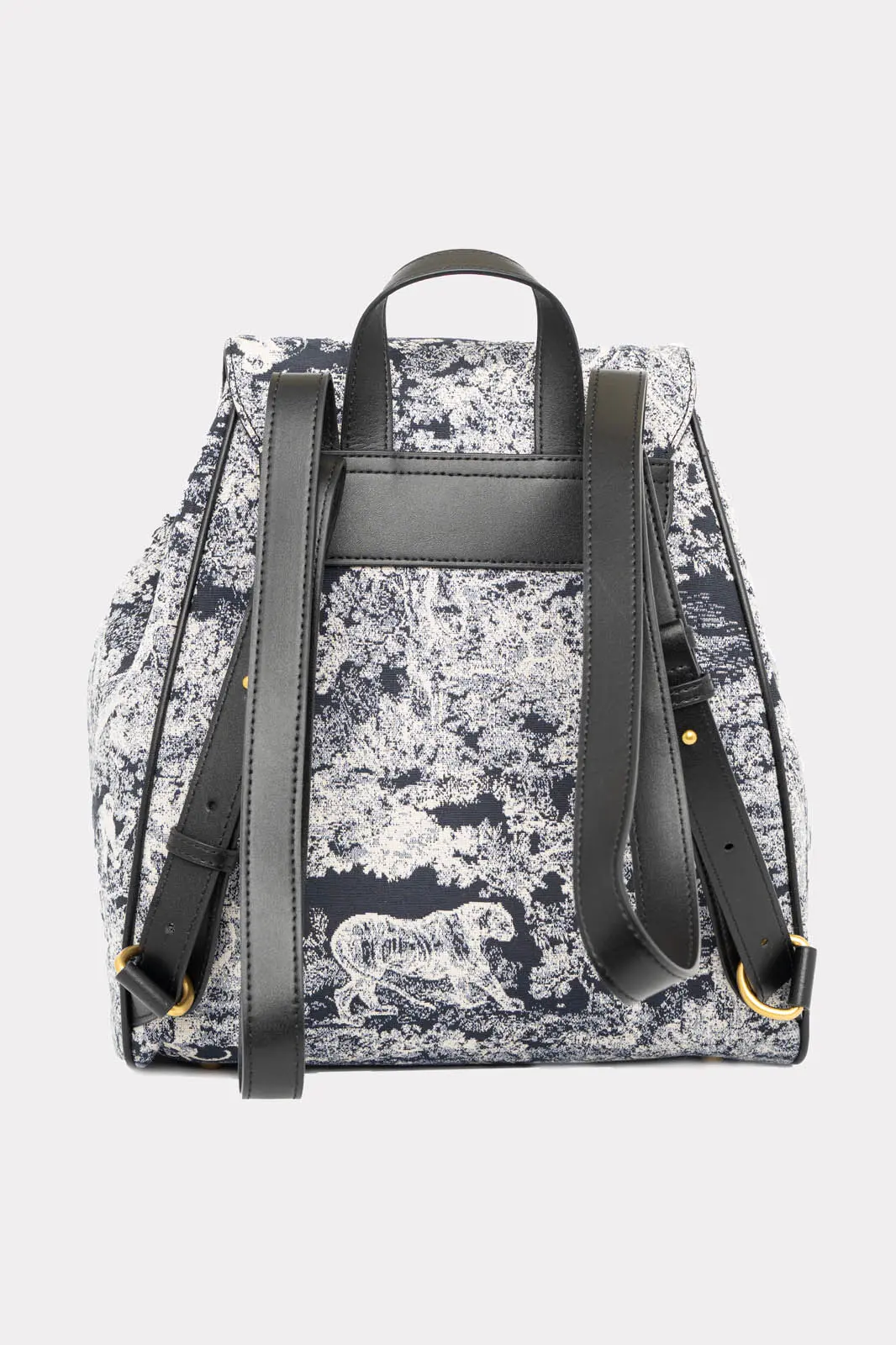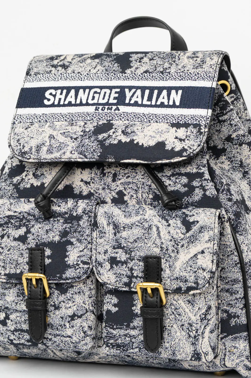 Σακίδιο πλάτης με ύφασμα τύπου καραβόπανο. Είναι πουγκί και η κύρια θήκη διαθέτει καπάκι και κλείνει με μαγνητάκι. Στο μπροστινό μέρος διαθέτει δύο μικρές θήκες που κλείνουν με μαγνήτη. Εσωτερικά είναι φοδραρισμένη και διαθέτει θήκες. Έχει σταθερό χερούλι με μήκος 20cm. Τα χερούλια είναι τύπου και ρυθμίζονται με ελάχιστο μήκος 76cm και μέγιστο 86cm. Μέγεθος τσάντας 32cm x 28cm x 14cm.