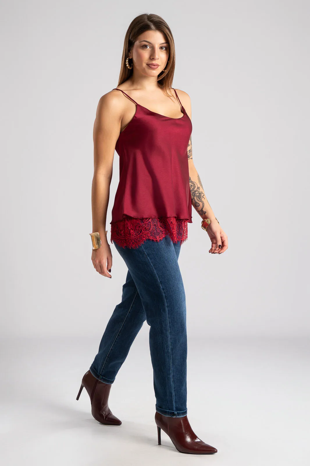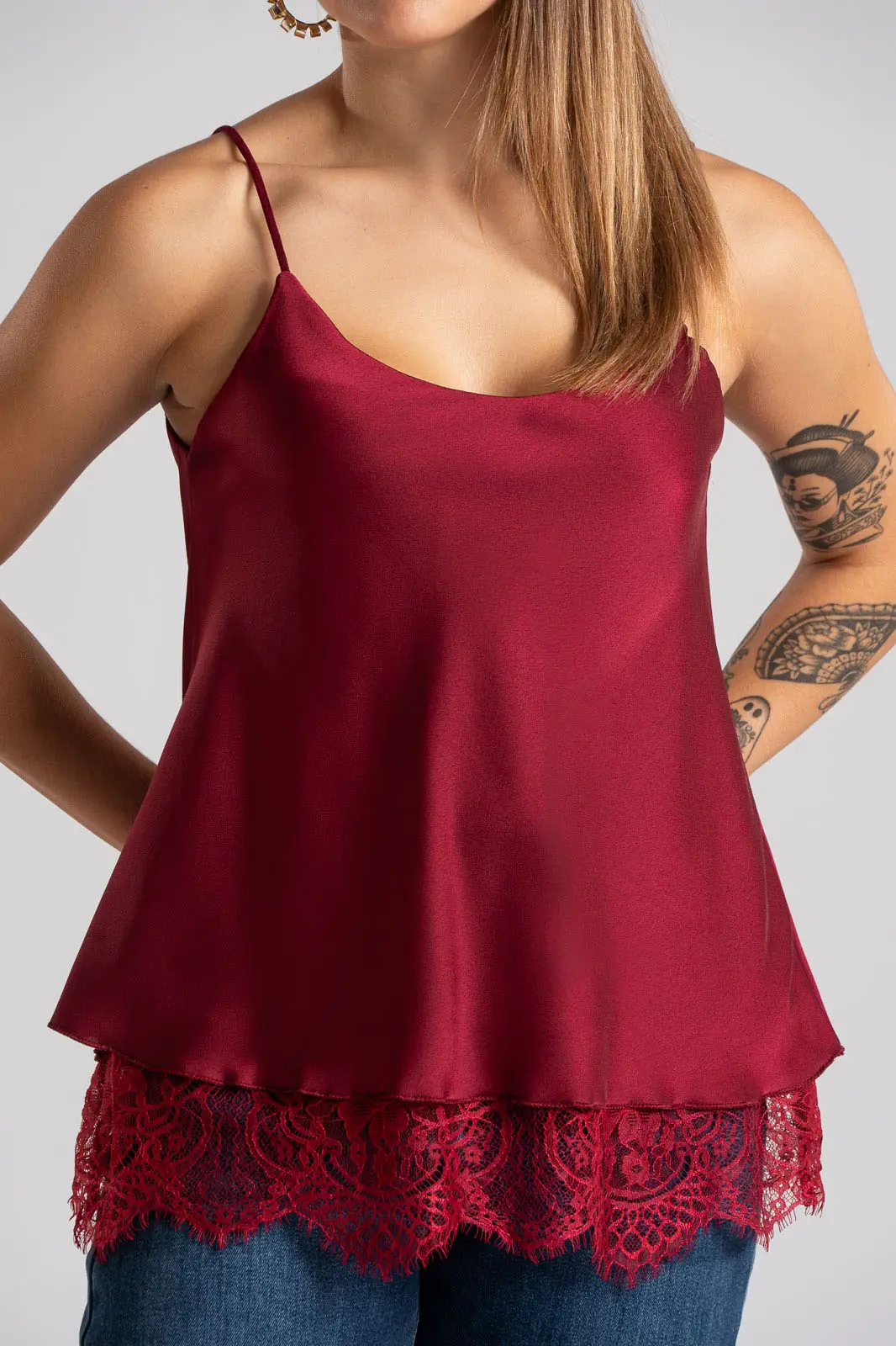Lingerie with a round neckline. It has a satin texture and lace detailing at the hem. It is lined with the same fabric and has a straight cut. The measurements in the table are representative of each product. 100% polyester.