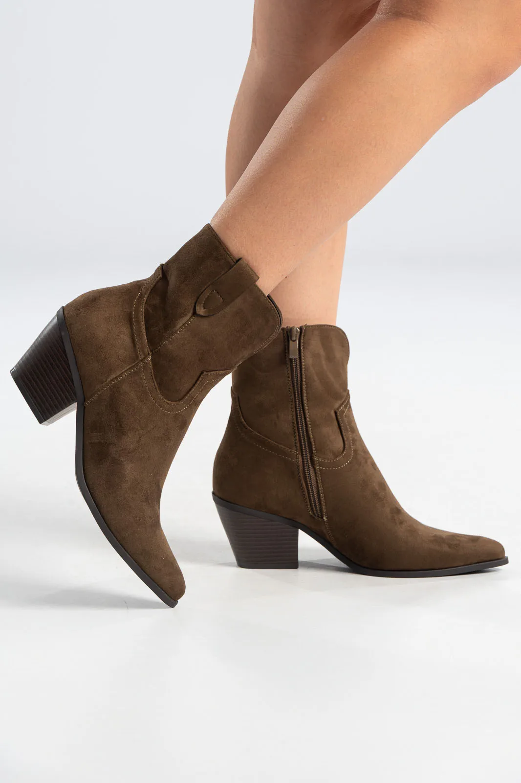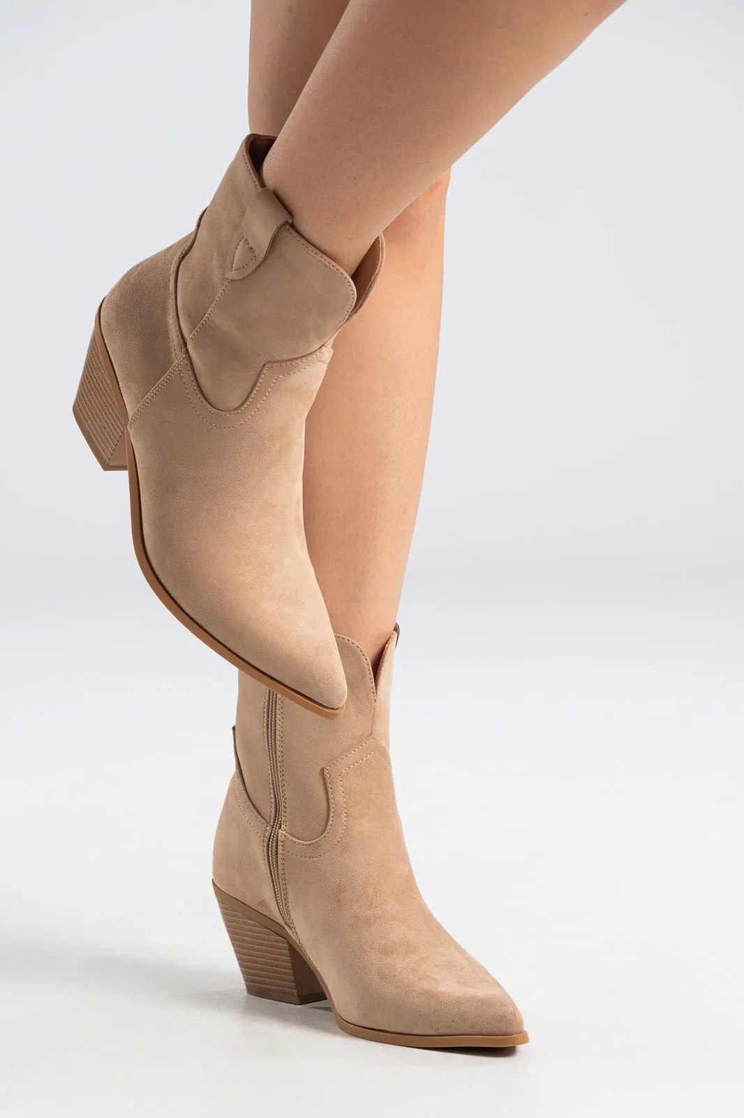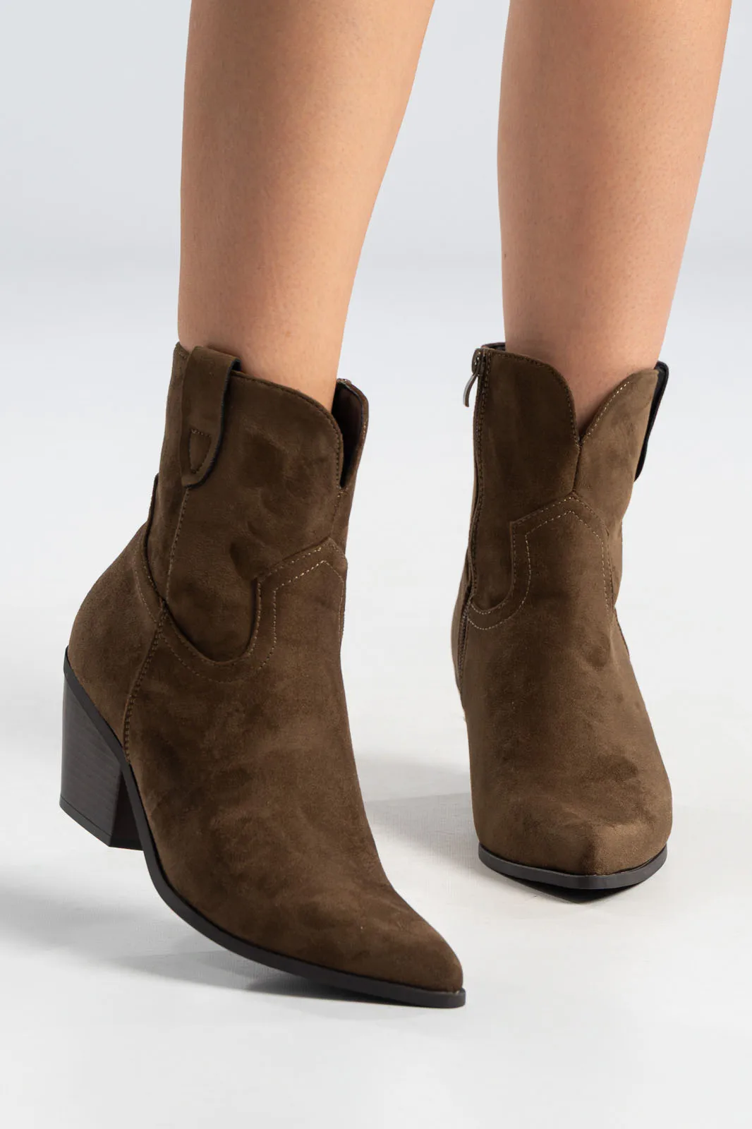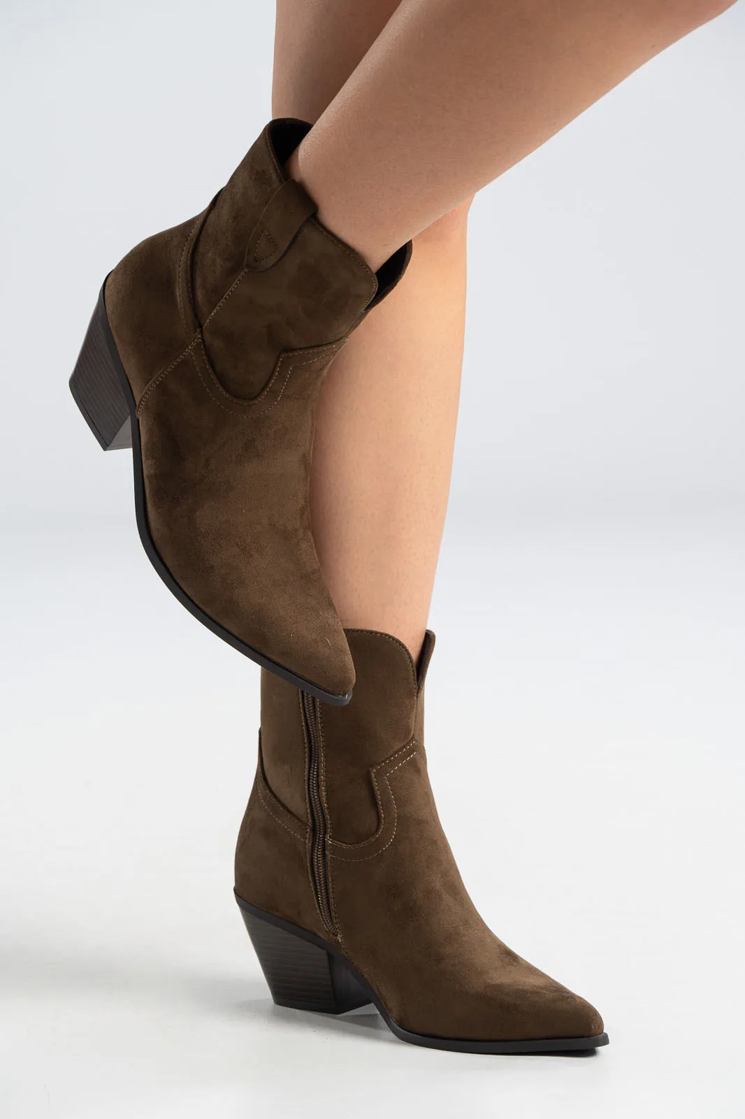 Μποτάκια σε ύφος cowboy. Έχουν suede υφή και είναι μυτερές στο μπροστινό μέρος. Κλείνει με φερμουάρ στο πλάι. Το ύψος του τακουνιού είναι 6cm.