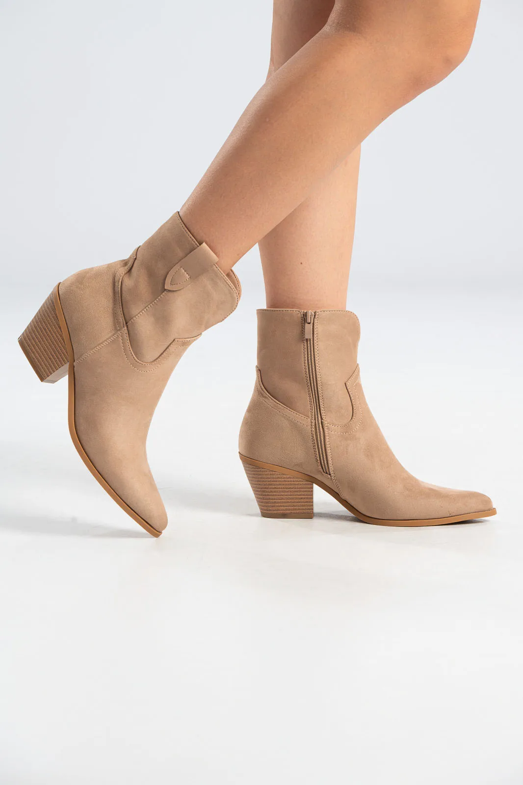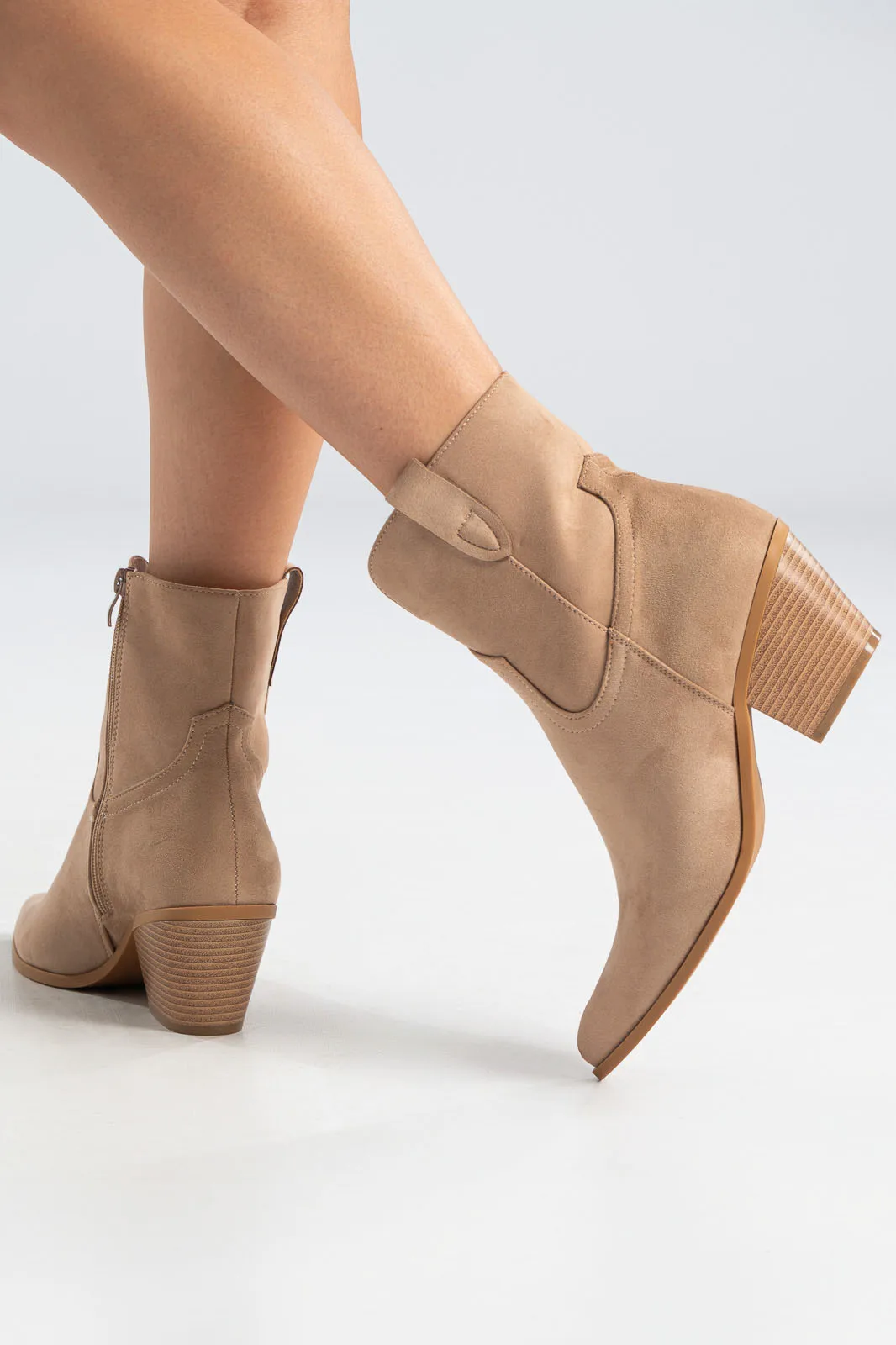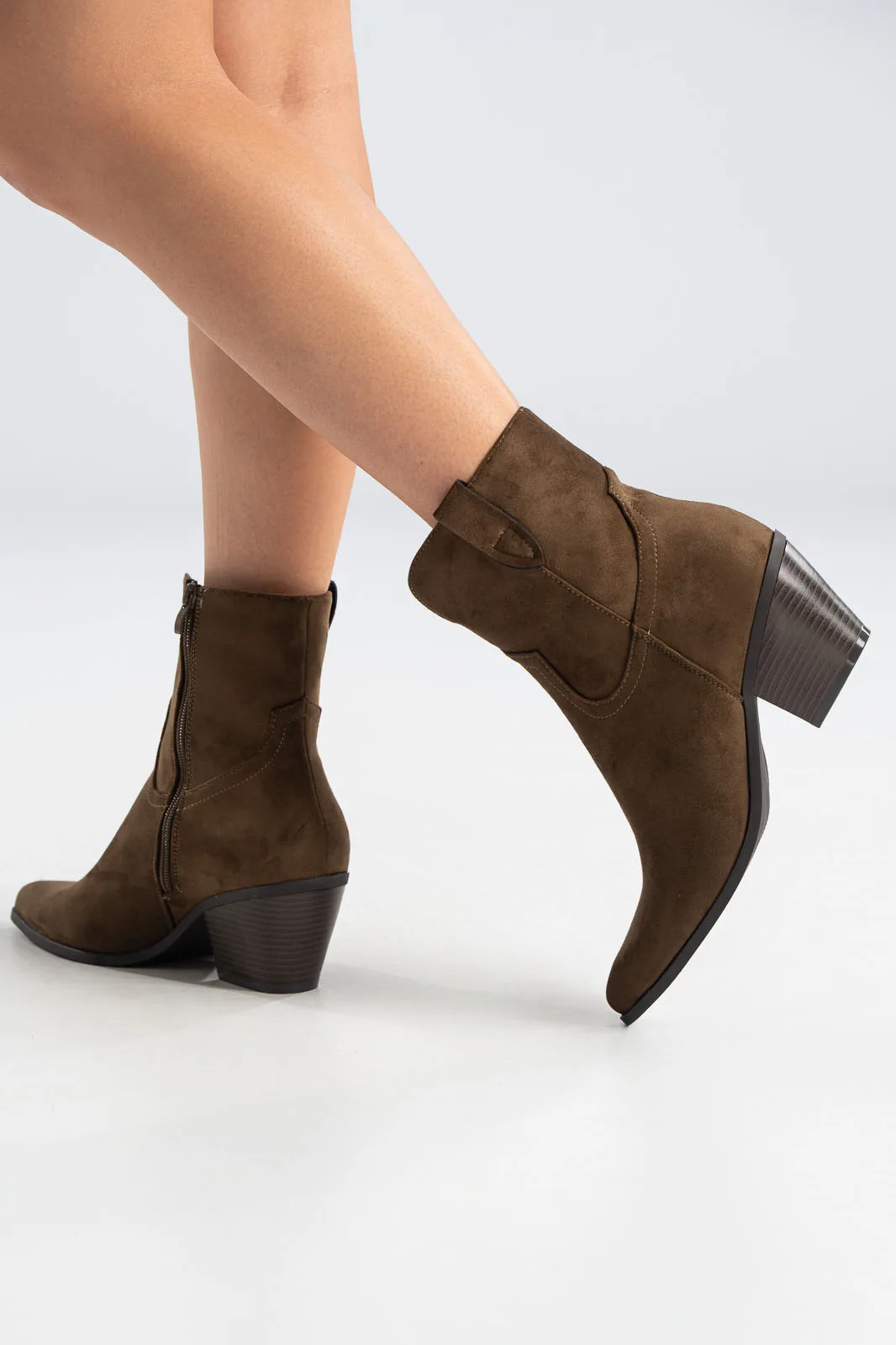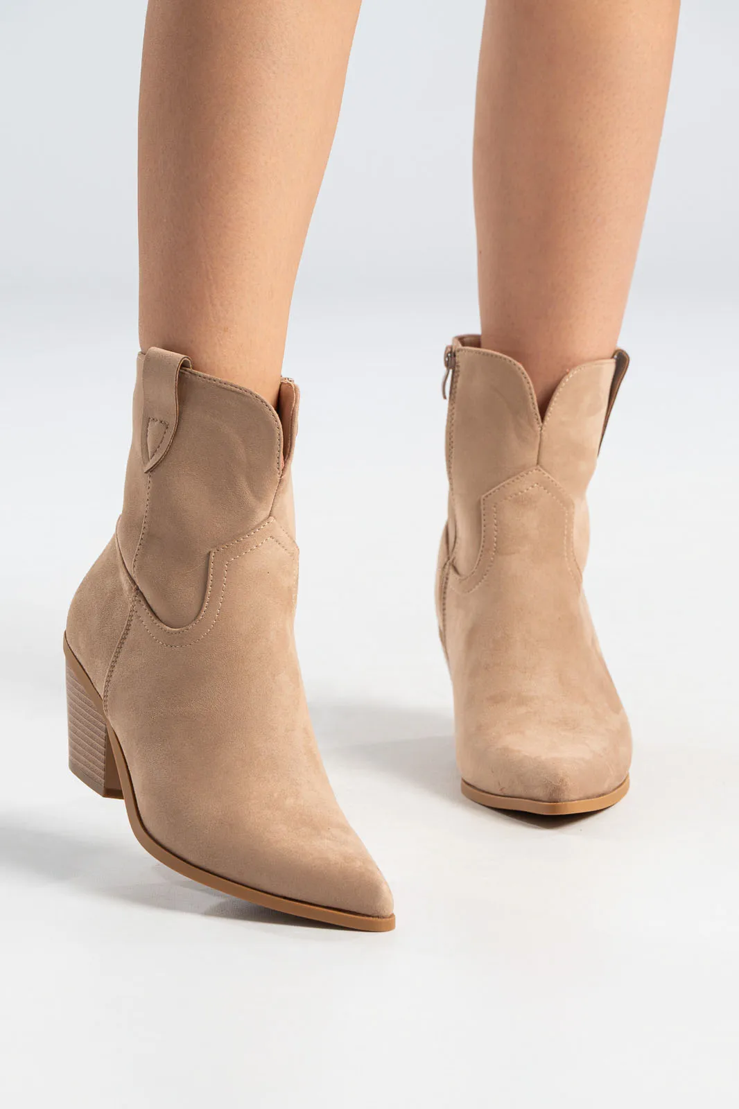 Μποτάκια σε ύφος cowboy. Έχουν suede υφή και είναι μυτερές στο μπροστινό μέρος. Κλείνει με φερμουάρ στο πλάι. Το ύψος του τακουνιού είναι 6cm.