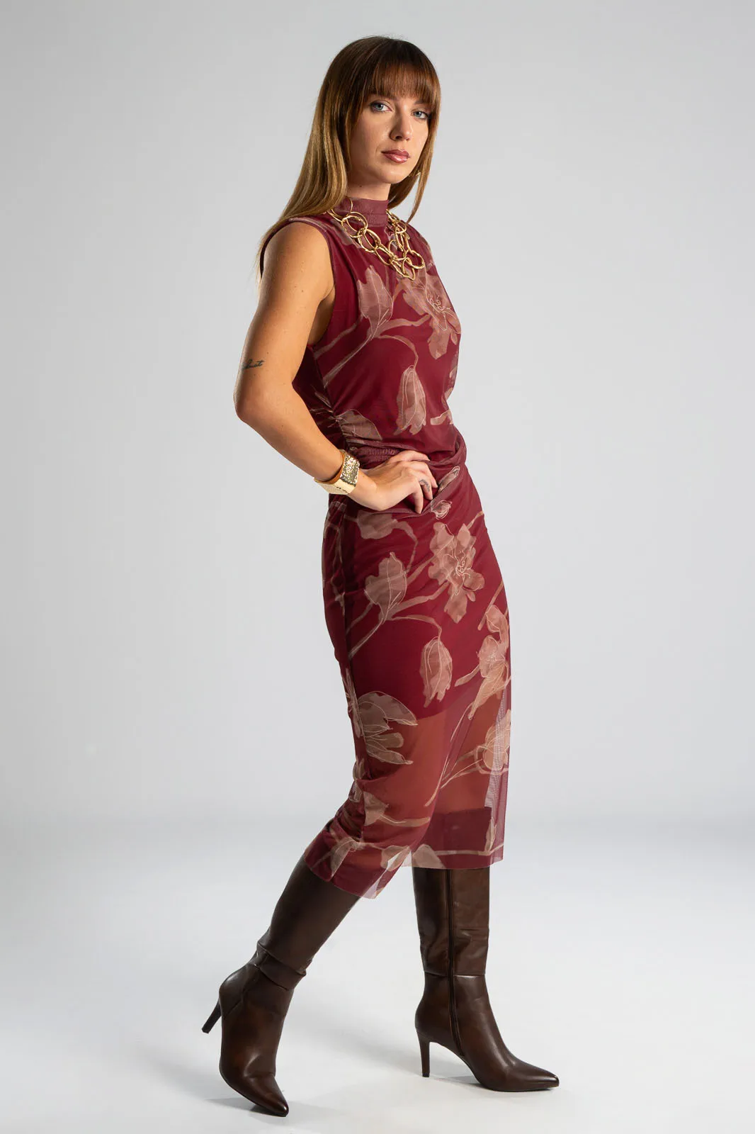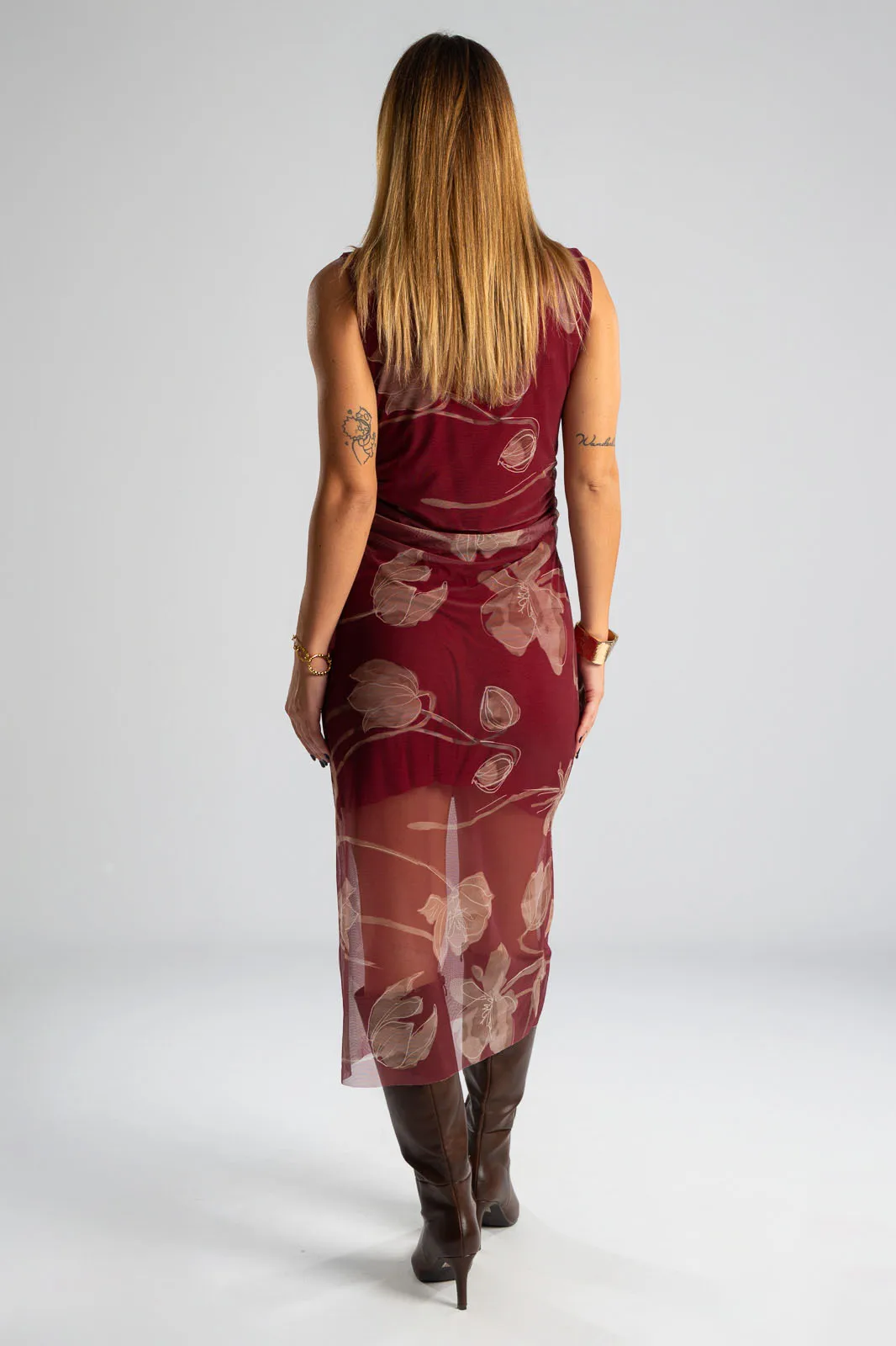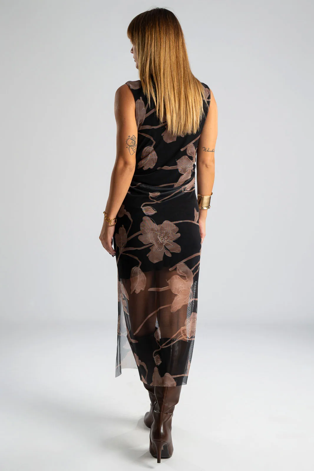 Φόρεμα αμάνικο με Lupeto λαιμόκοψη. Έχει τούλινη υφή και όψη σε όλη την επιφάνεια του και εσωτερικά είναι φοδραρισμένο. Ακολουθεί τη γραμμή του σώματος αναδεικνύοντας τις καμπύλες. Στο τελείωμα διαθέτει πλαινό άνοιγμα και είναι midi. Οι μετρήσεις του πίνακα είναι αντιπροσωπευτικές για κάθε κωδικό. 95% polyester, 5% elastan. 100% viscose (εσωτερική φόδρα).