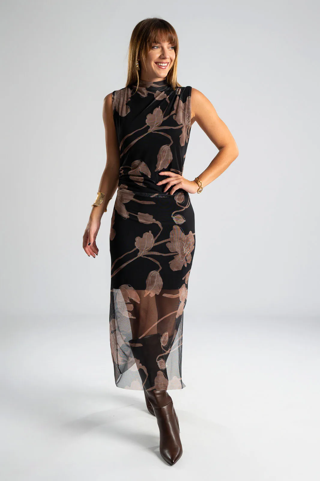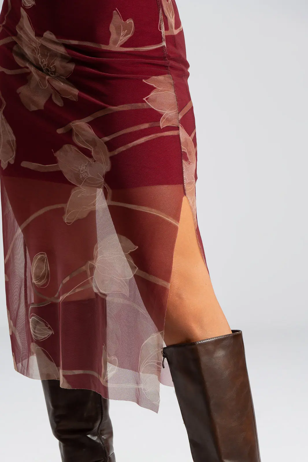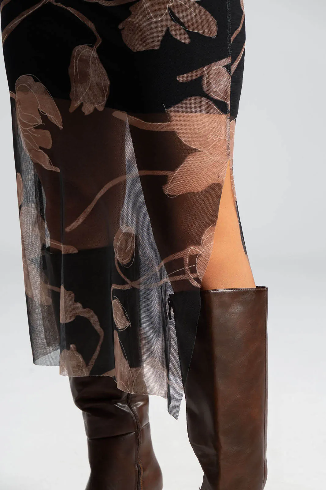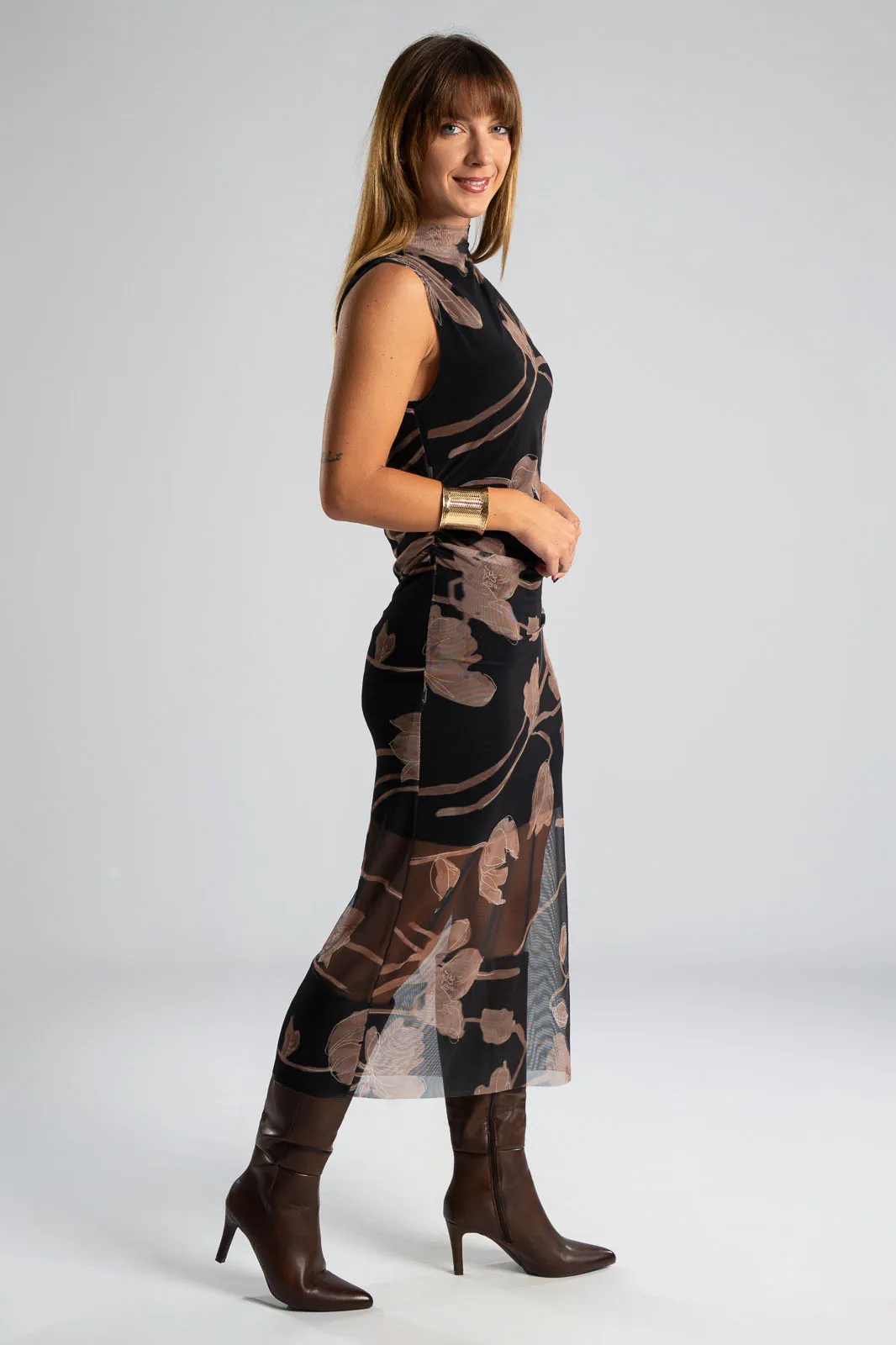 Φόρεμα αμάνικο με Lupeto λαιμόκοψη. Έχει τούλινη υφή και όψη σε όλη την επιφάνεια του και εσωτερικά είναι φοδραρισμένο. Ακολουθεί τη γραμμή του σώματος αναδεικνύοντας τις καμπύλες. Στο τελείωμα διαθέτει πλαινό άνοιγμα και είναι midi. Οι μετρήσεις του πίνακα είναι αντιπροσωπευτικές για κάθε κωδικό. 95% polyester, 5% elastan. 100% viscose (εσωτερική φόδρα).