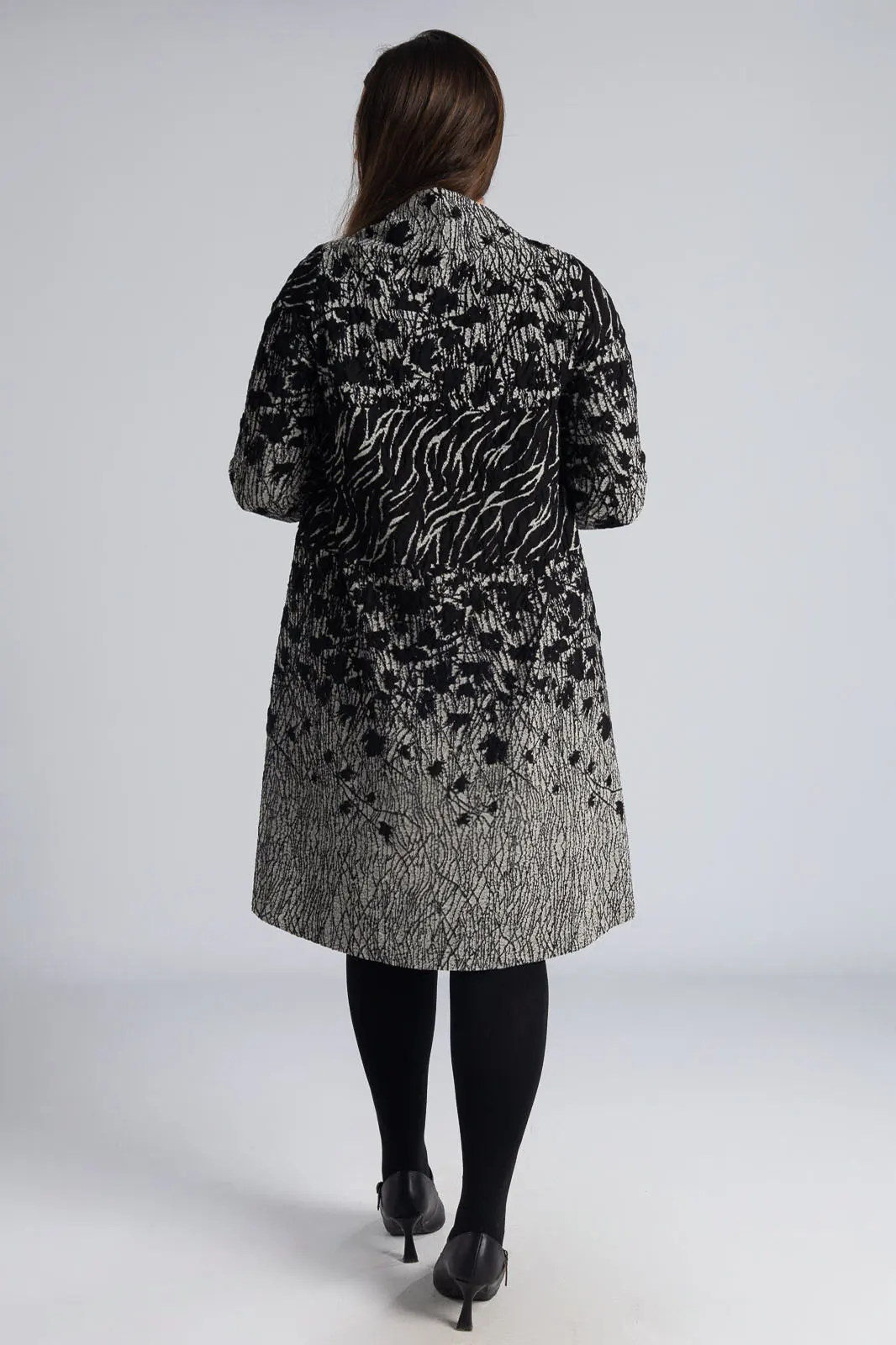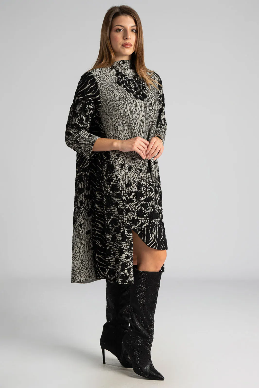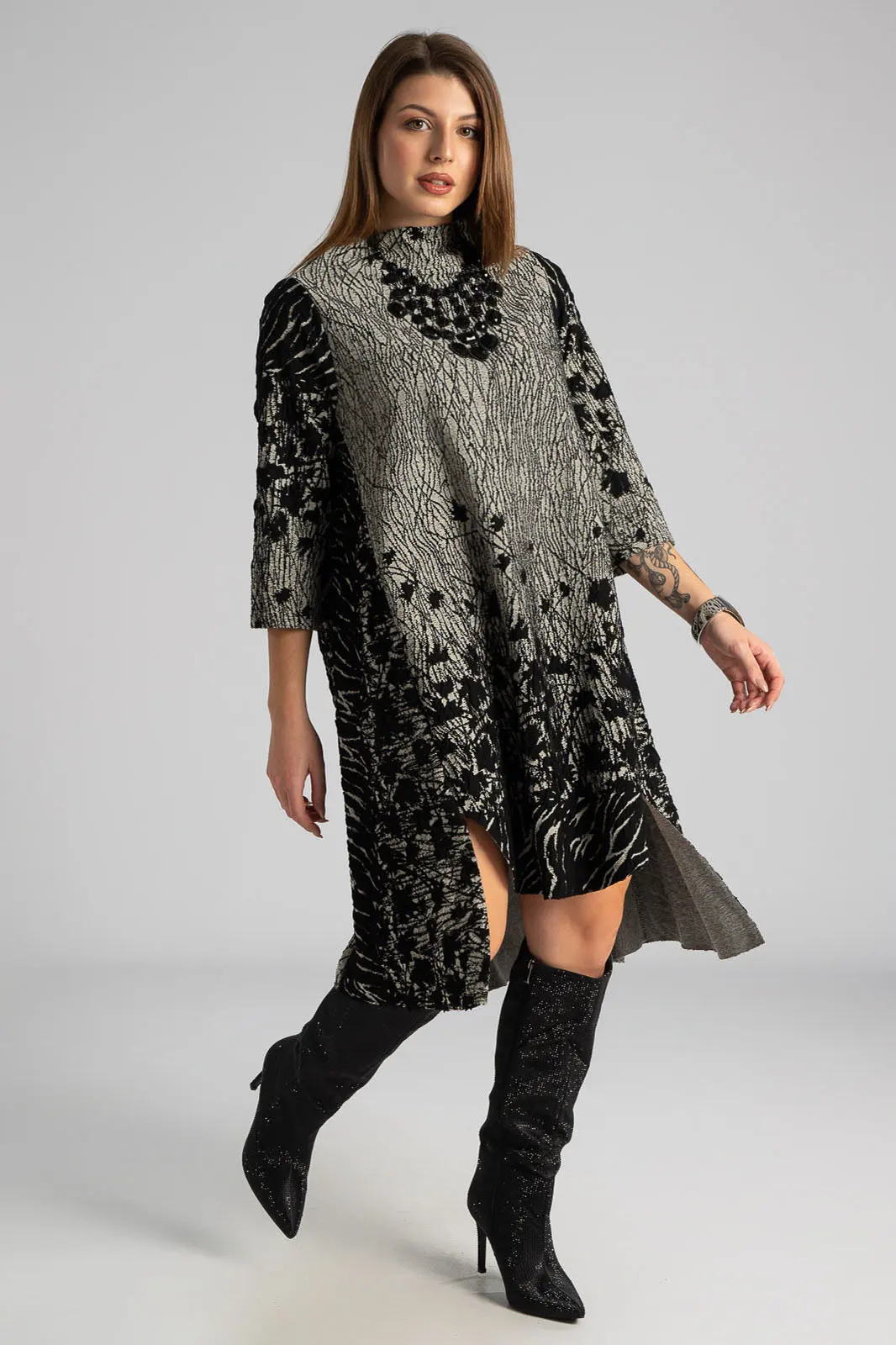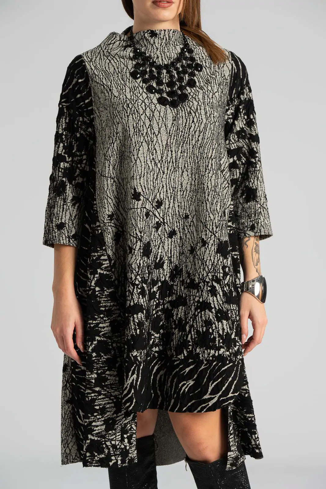 Φόρεμα με lupeto λαιμόκοψη. Διαθέτει μανίκια 3/4. Σε όλη την επιφάνεια έχει ανάφλυφη υφή και σχέτια απο λουλουδια και φύλλα σε 3d ύφος. To τελείωμα του είναι ασύμμετρο. Οι μετρήσεις του πίνακα είναι αντιπροσωπευτικές για κάθε προϊόν. 56% polyester, 42% cotton, 2% elastan.