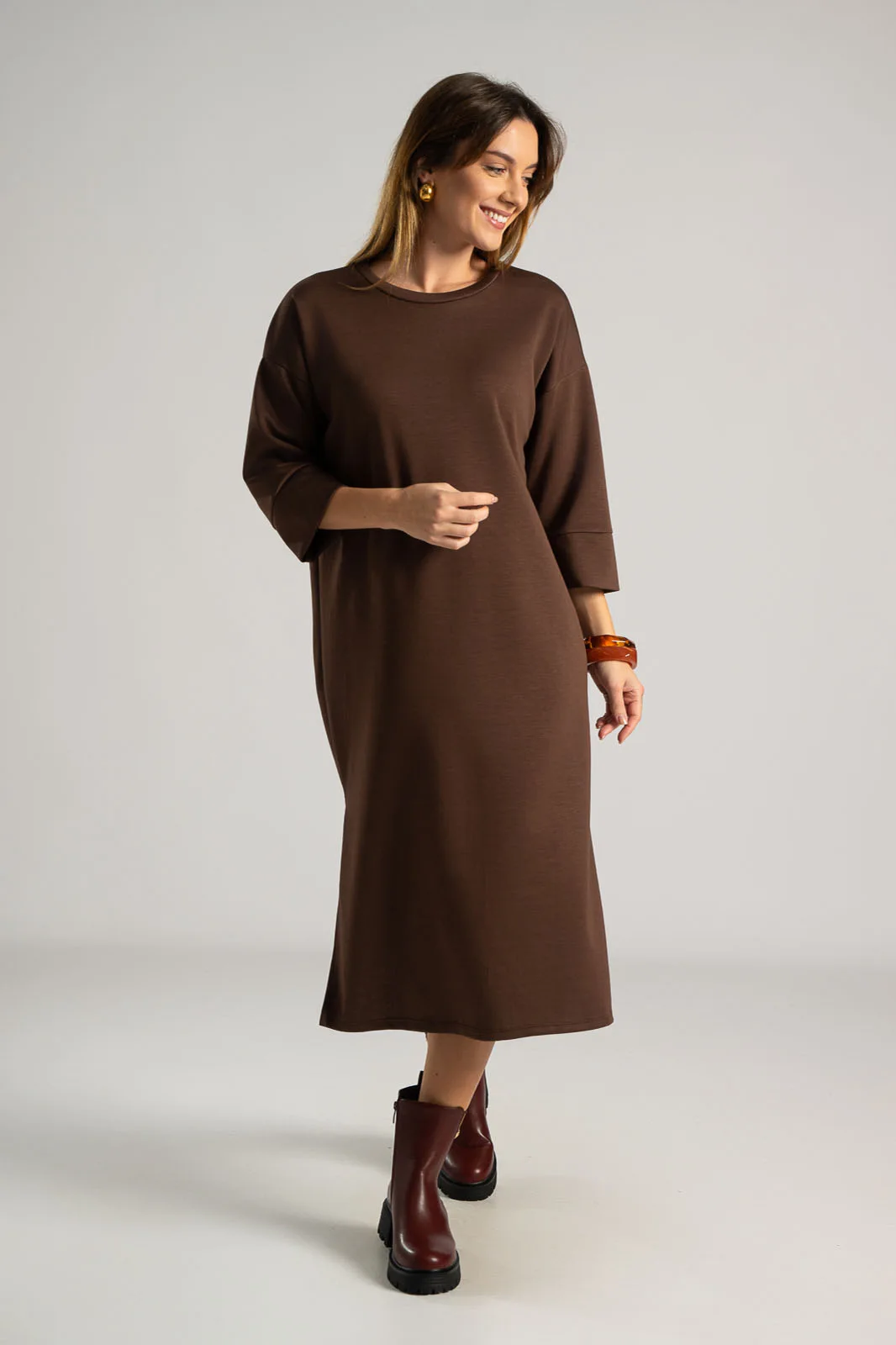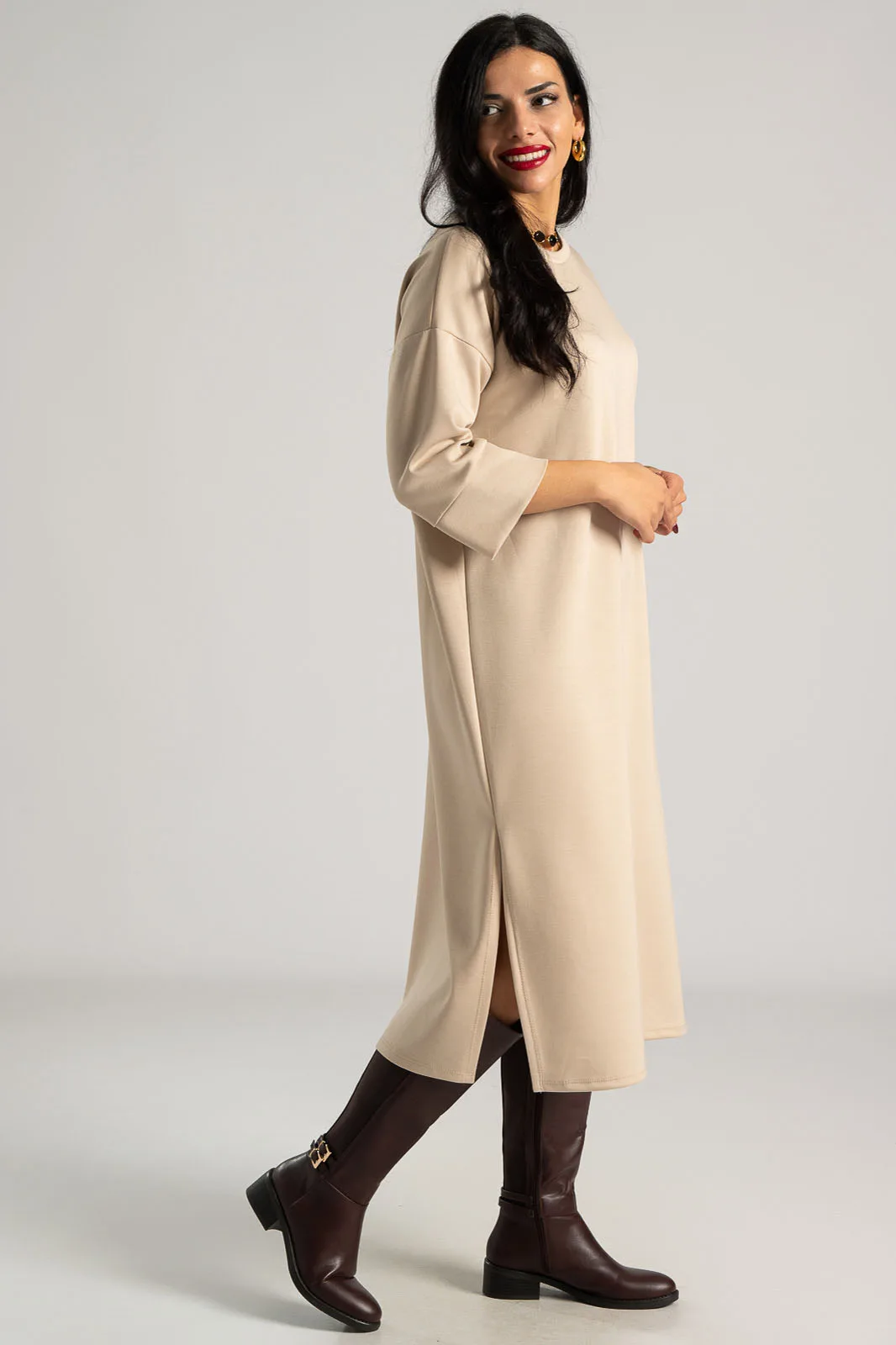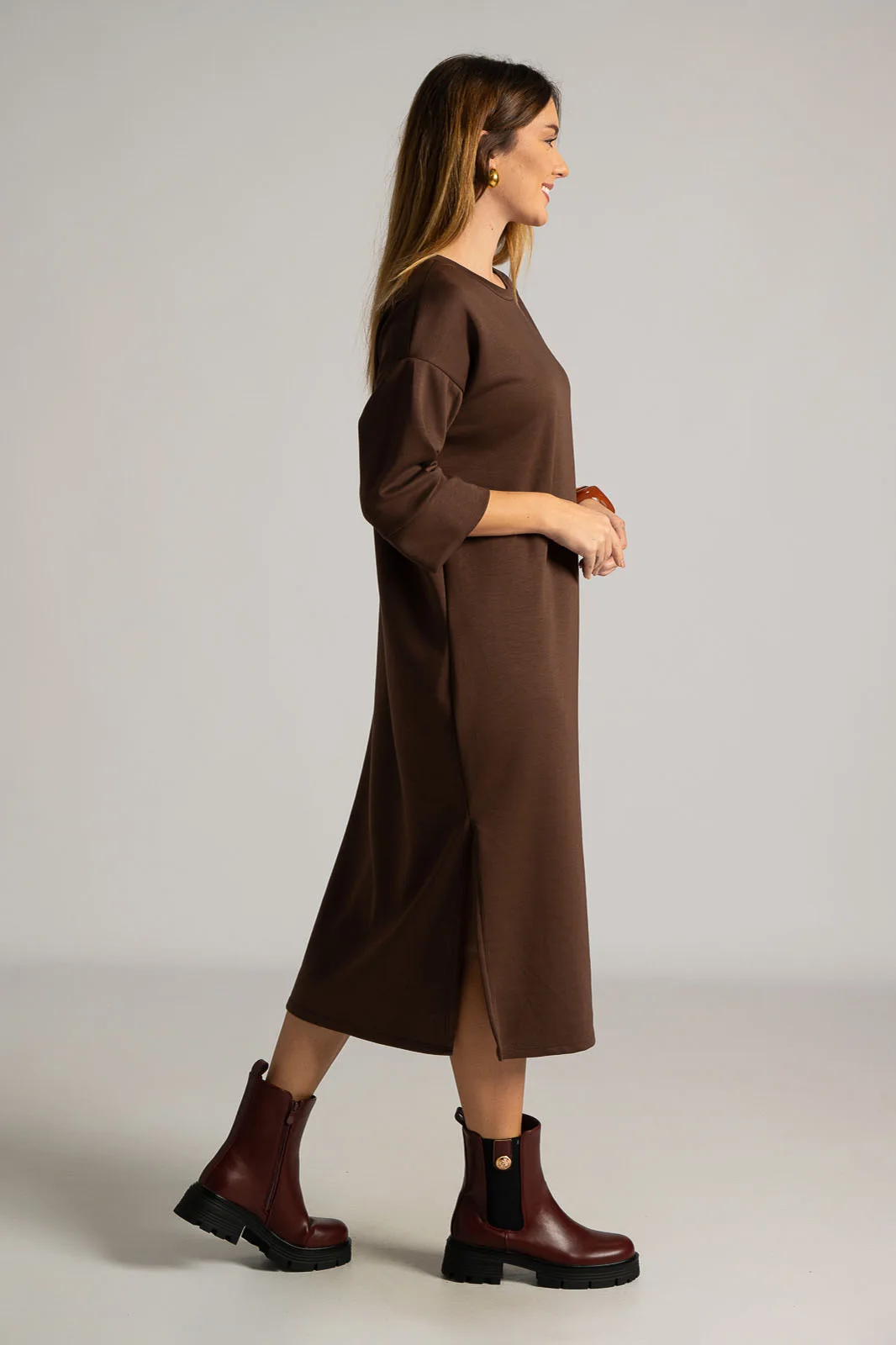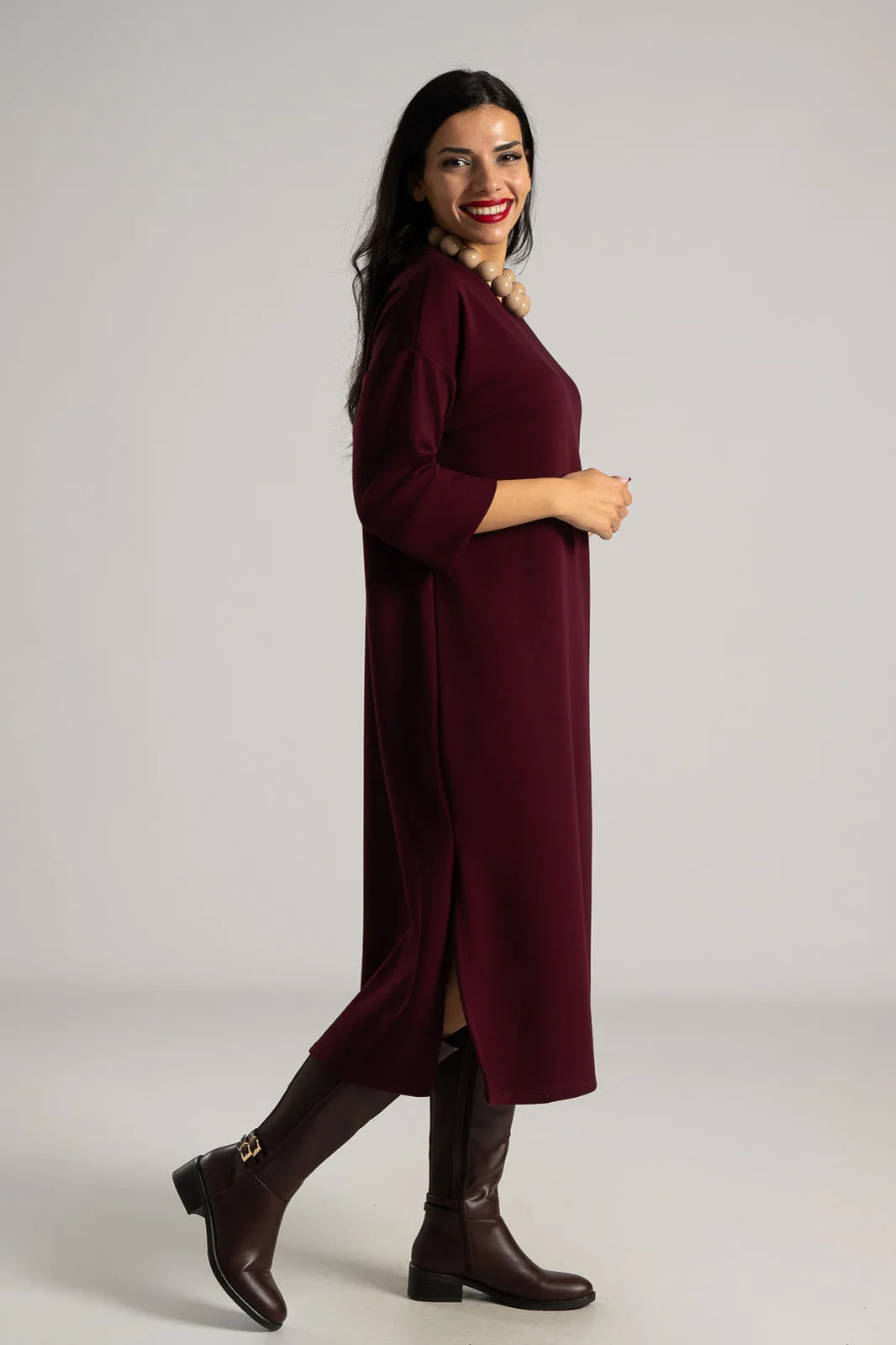 Φόρεμα midi. Διαθέτει στρογγυλή λαιμόκοψη και μανίκια 3/4. Έχει πολύ μαλακό ύφασμα και είναι άνετο. Είναι σε ίσια γραμμή και έχει πλαινά ανοίγματα στο τελείωμα. Οι μετρήσεις του πίνακα είναι αντιπροσωπευτικές για κάθε κωδικό. 55% polyester, 39% viscose,6% elastan.