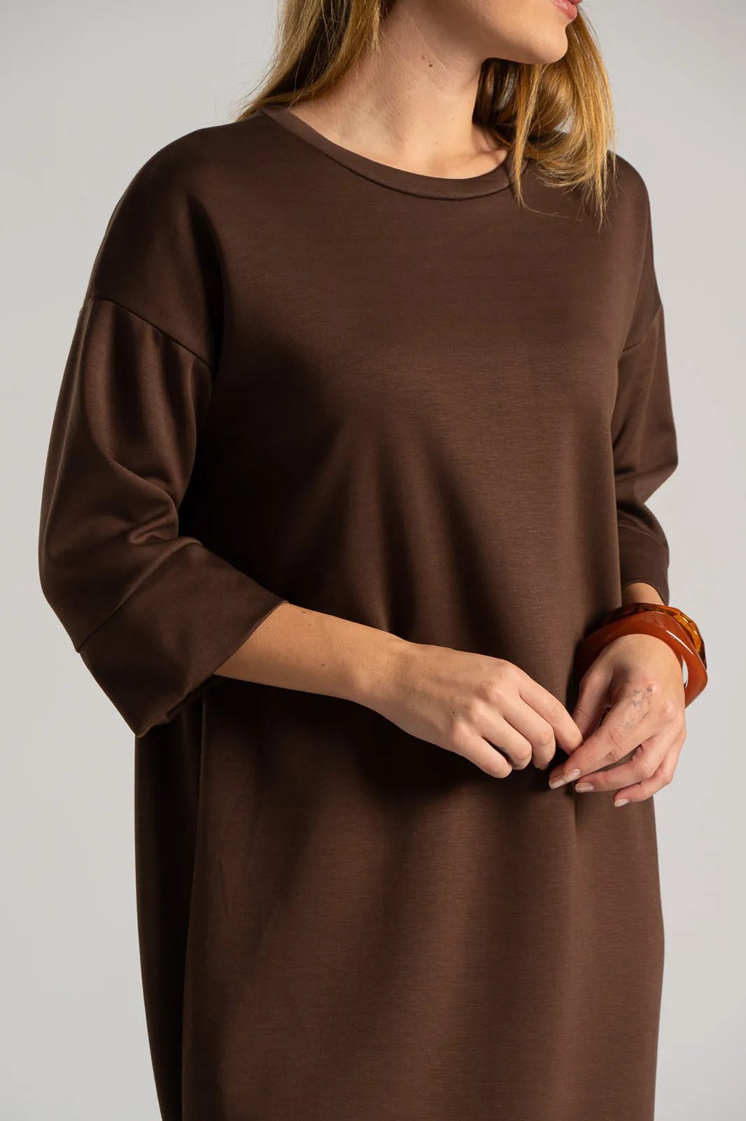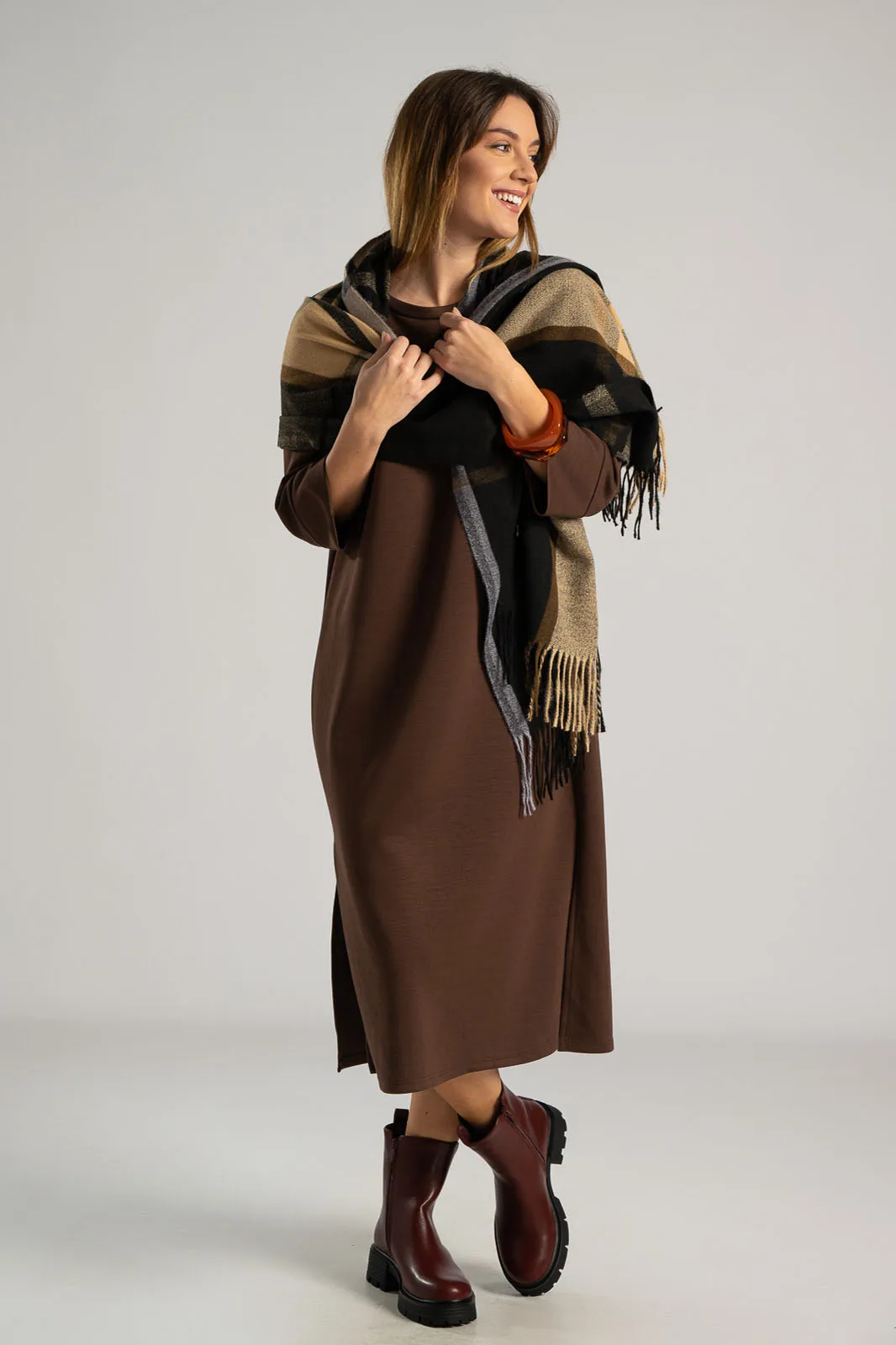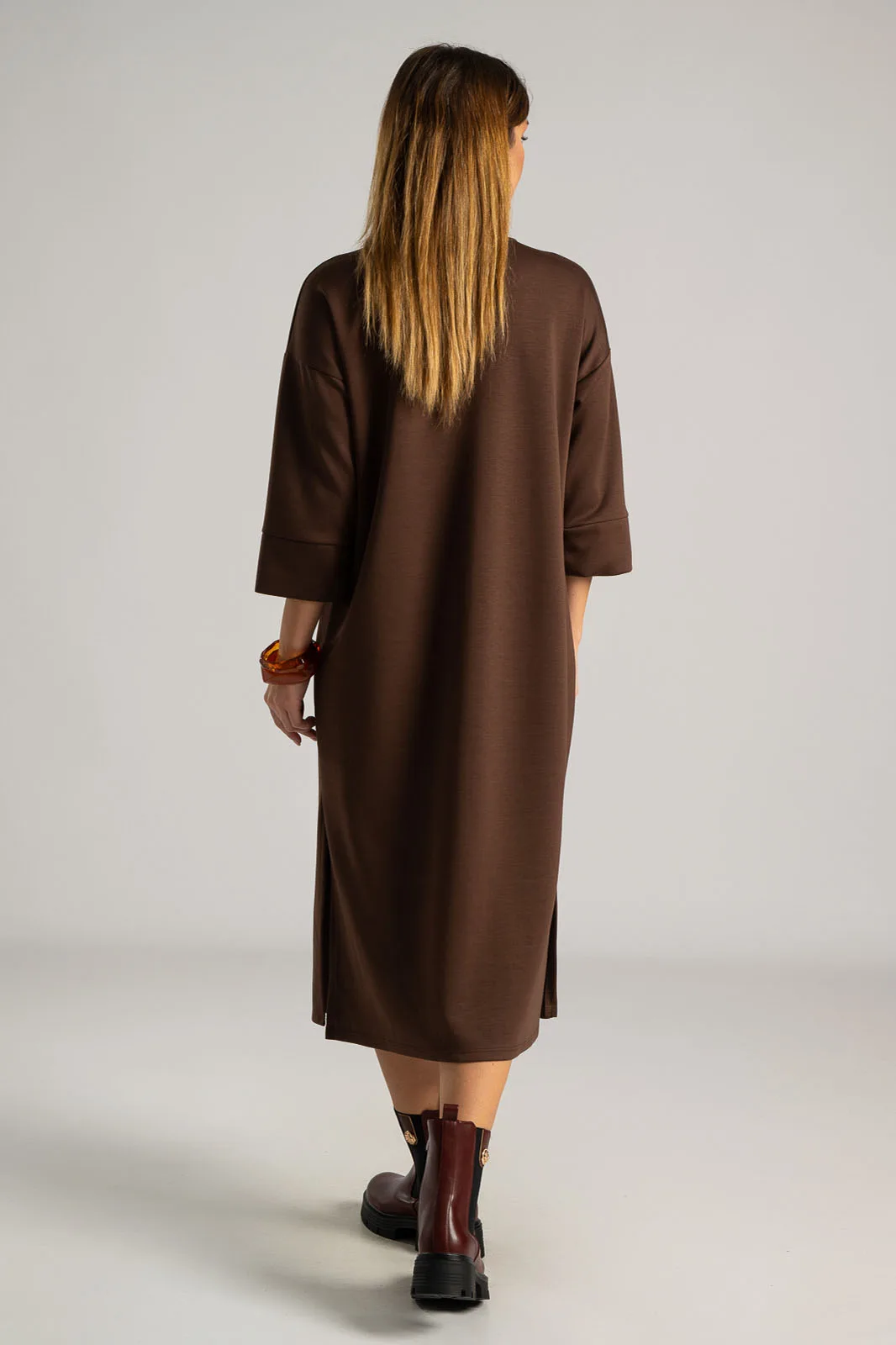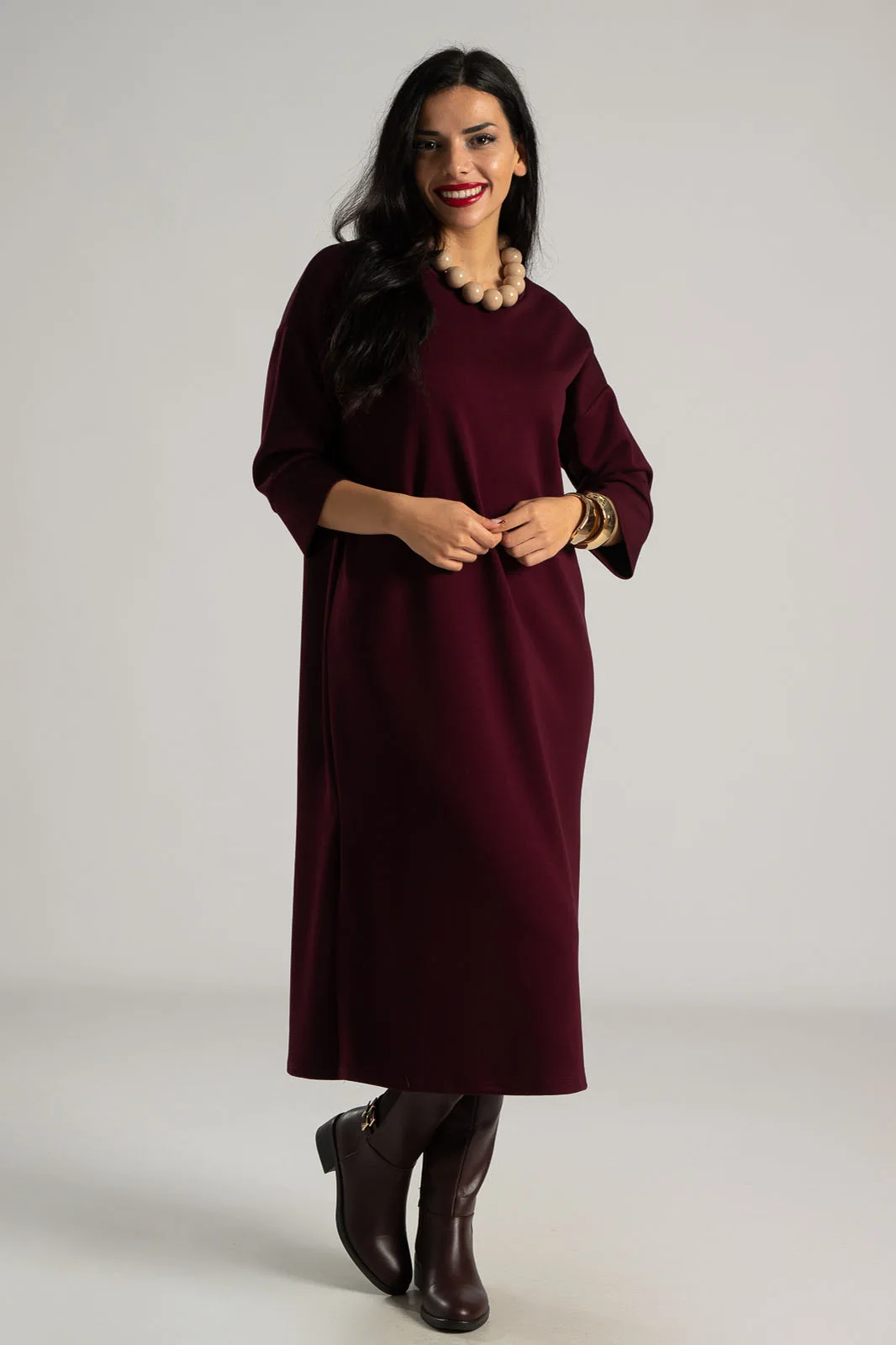 Φόρεμα midi. Διαθέτει στρογγυλή λαιμόκοψη και μανίκια 3/4. Έχει πολύ μαλακό ύφασμα και είναι άνετο. Είναι σε ίσια γραμμή και έχει πλαινά ανοίγματα στο τελείωμα. Οι μετρήσεις του πίνακα είναι αντιπροσωπευτικές για κάθε κωδικό. 55% polyester, 39% viscose,6% elastan.