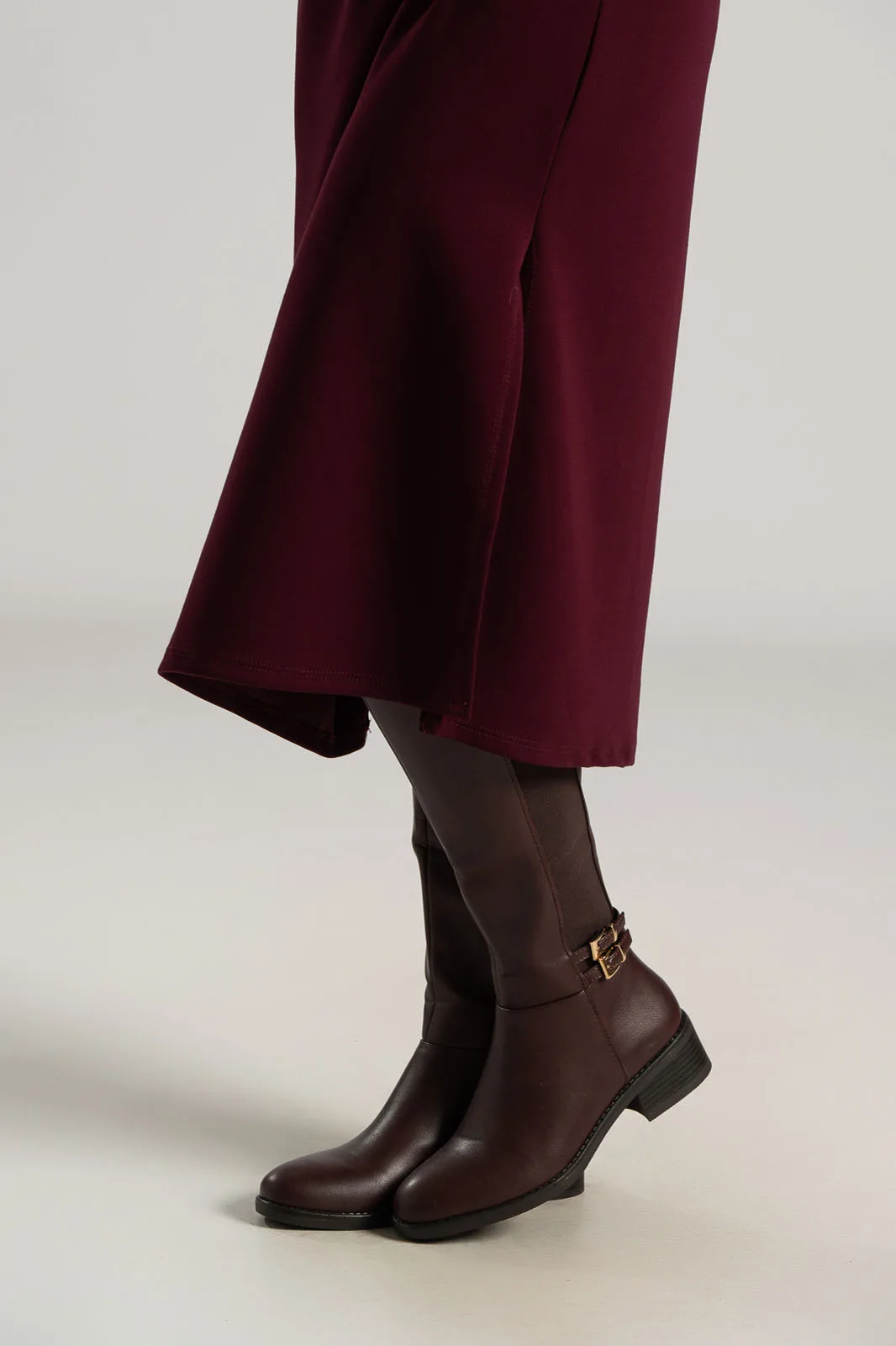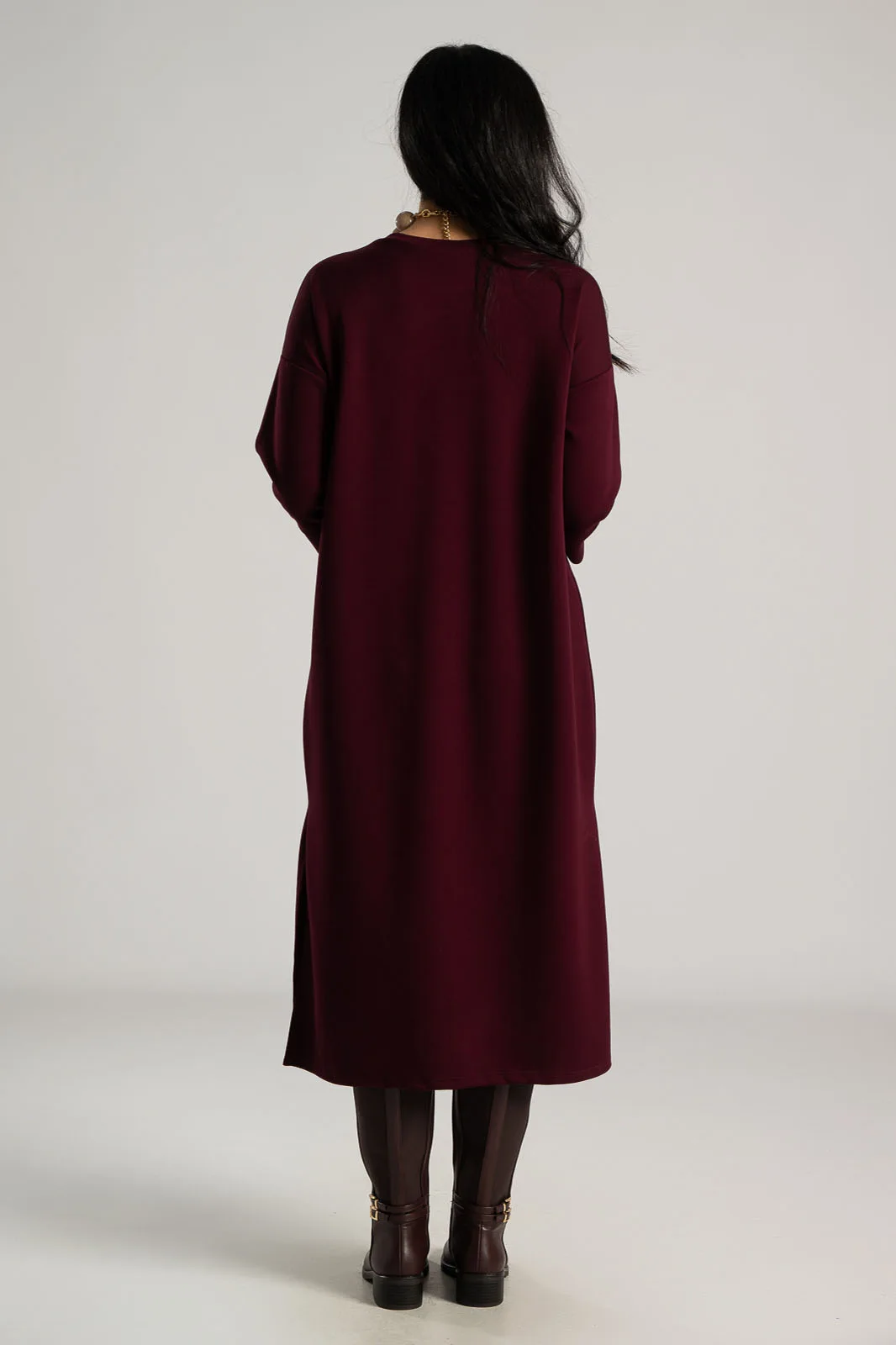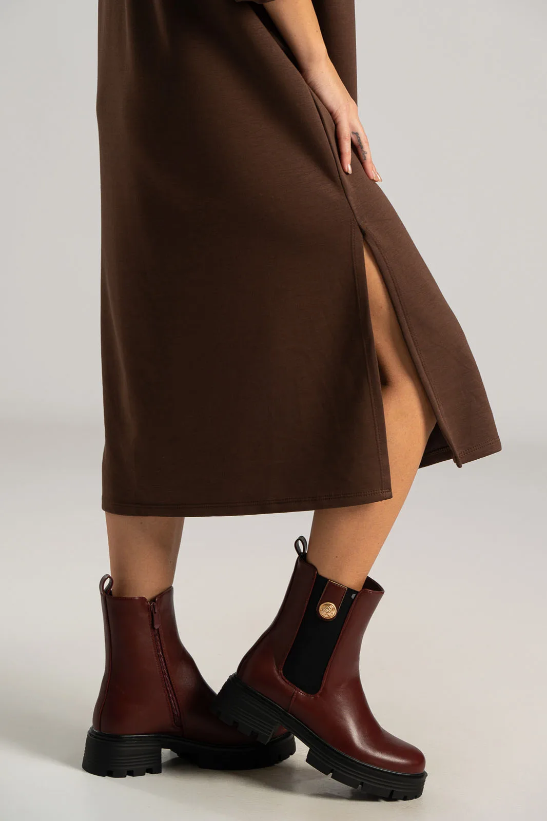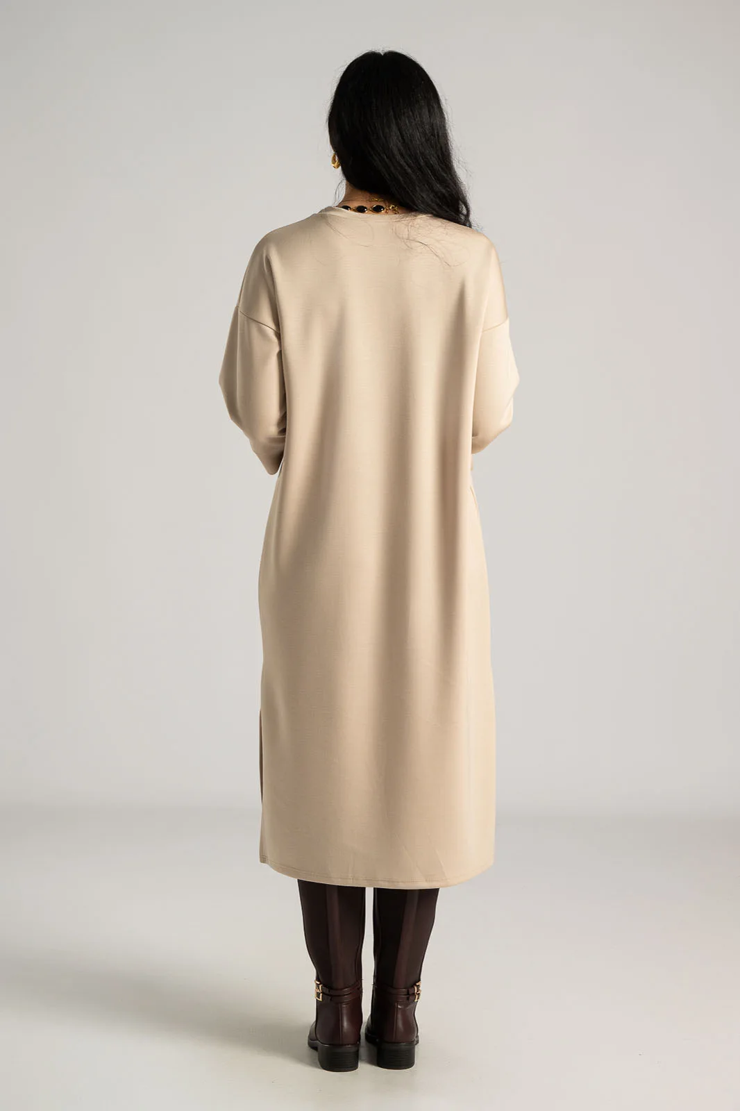Φόρεμα midi. Διαθέτει στρογγυλή λαιμόκοψη και μανίκια 3/4. Έχει πολύ μαλακό ύφασμα και είναι άνετο. Είναι σε ίσια γραμμή και έχει πλαινά ανοίγματα στο τελείωμα. Οι μετρήσεις του πίνακα είναι αντιπροσωπευτικές για κάθε κωδικό. 55% polyester, 39% viscose,6% elastan.