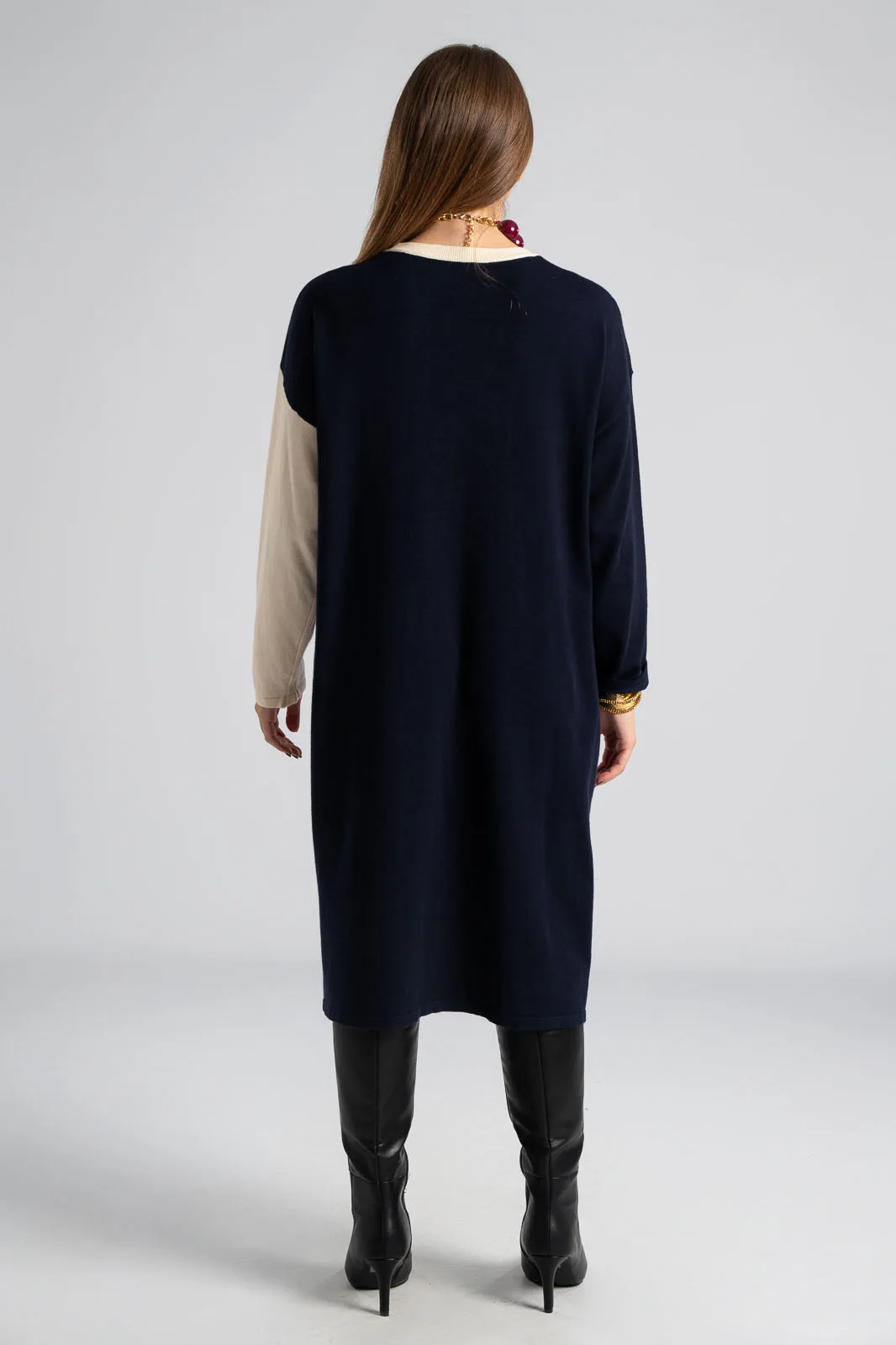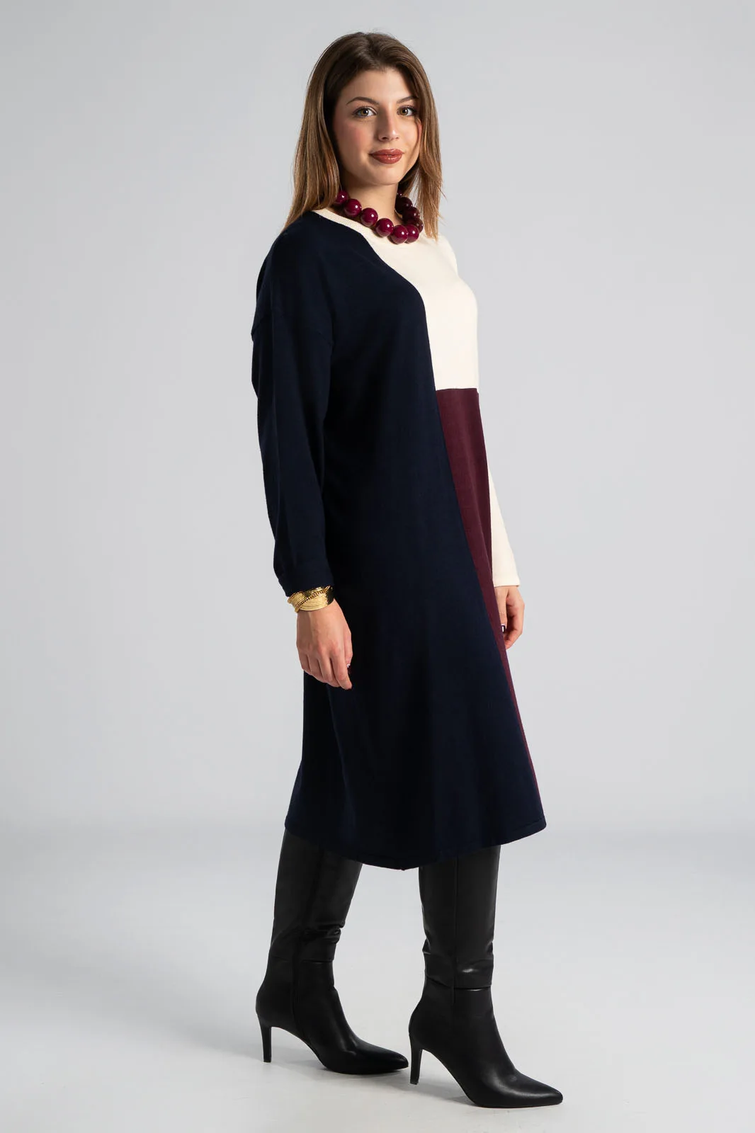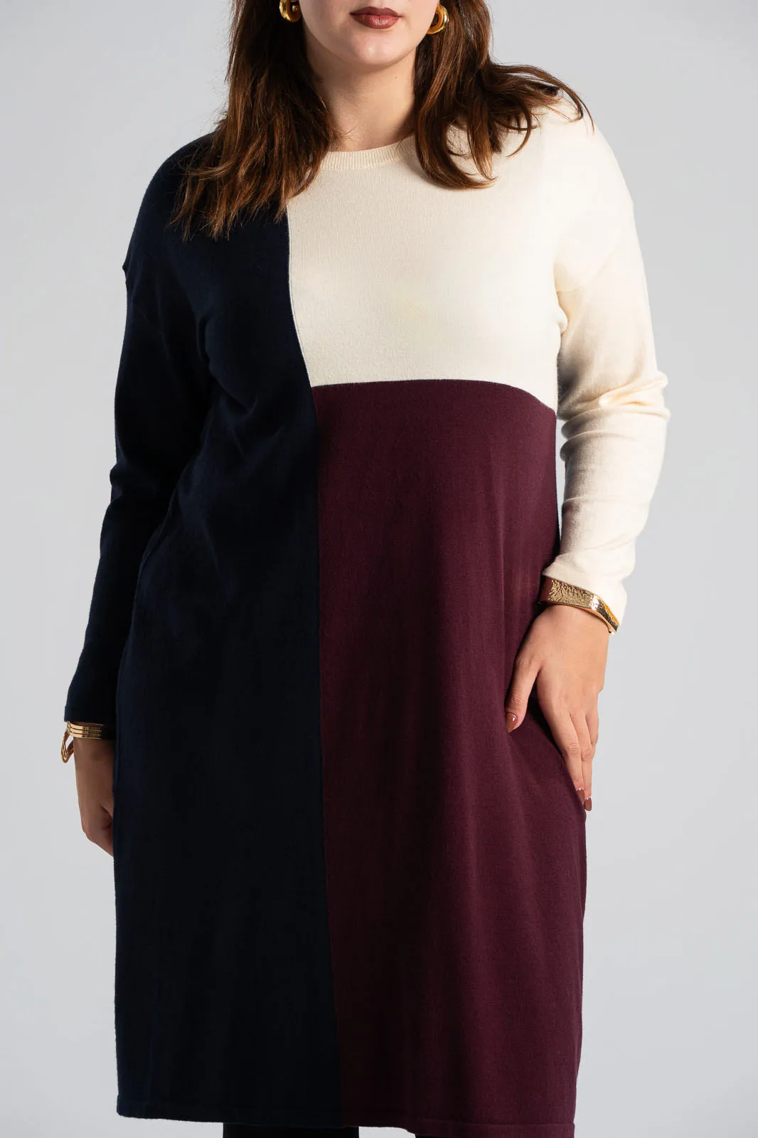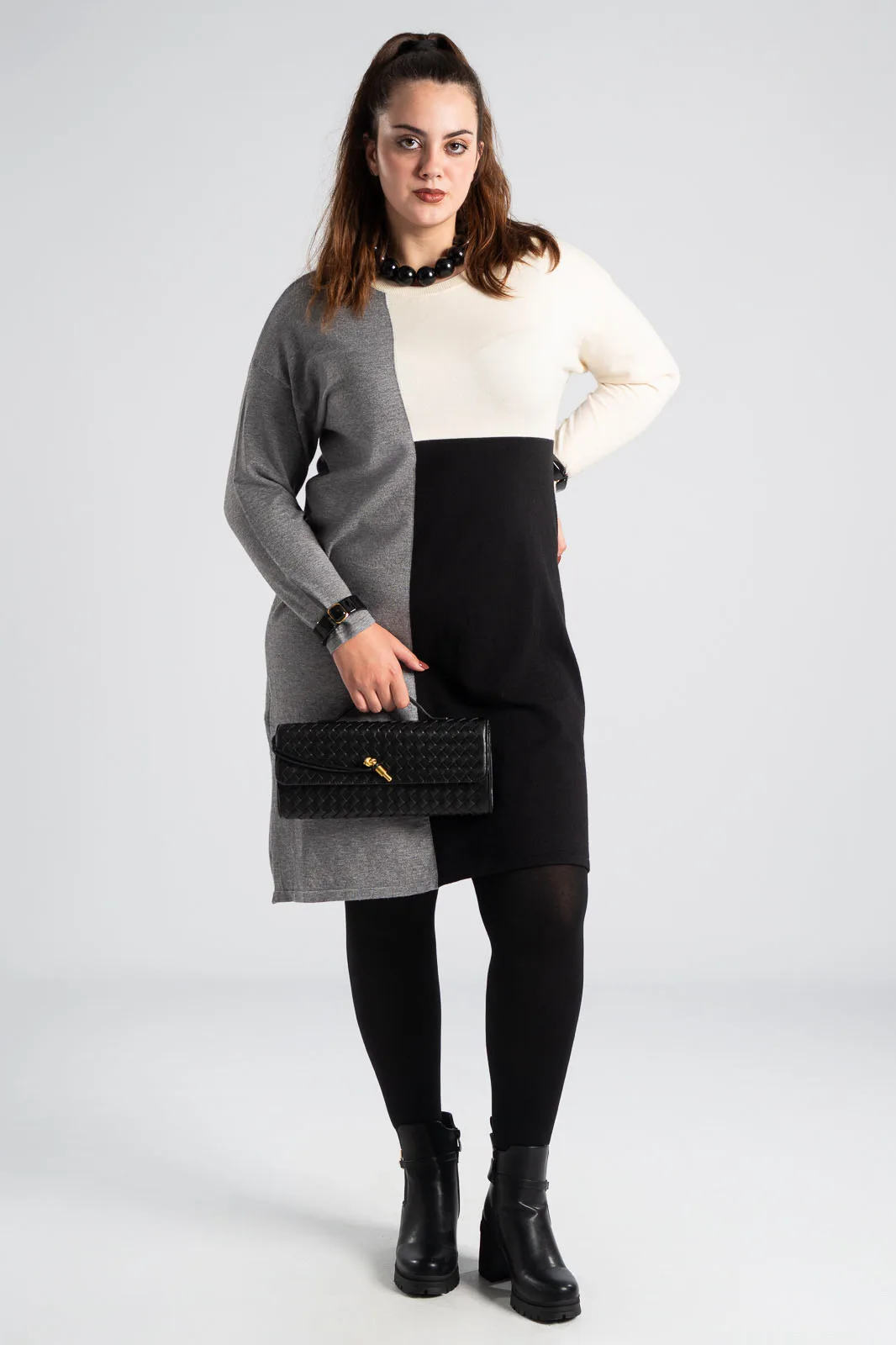 Midi dress based on the color blocking trend, harmoniously combining colors. It has a round neckline and long sleeves. It is made of compact knit fabric and has a ribbed neckline. It has an A-line silhouette and a slit on the side. The measurements in the table are representative for each product. 30% polyamide, 30% viscose, 20% modal, 20% elastane.
