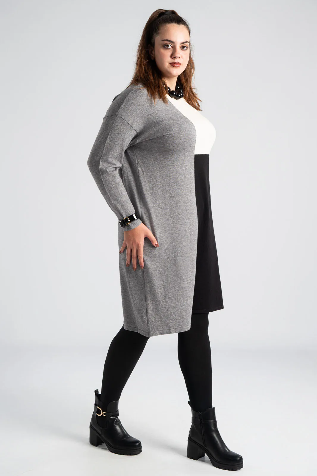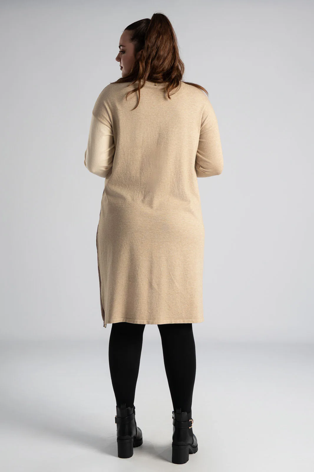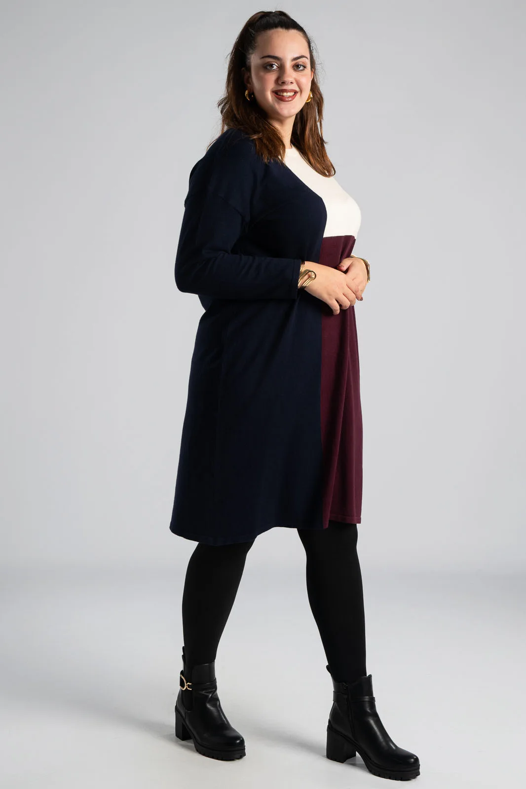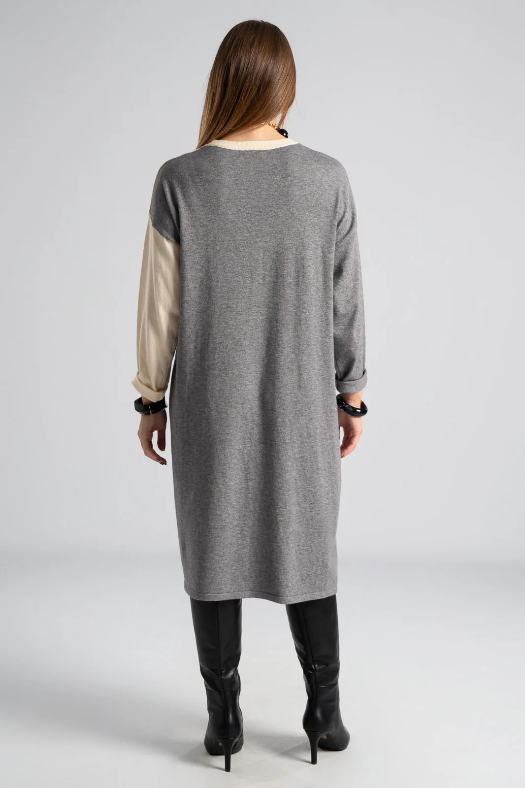 Midi dress based on the color blocking trend, harmoniously combining colors. It has a round neckline and long sleeves. It is made of compact knit fabric and has a ribbed neckline. It has an A-line silhouette and a slit on the side. The measurements in the table are representative for each product. 30% polyamide, 30% viscose, 20% modal, 20% elastane.