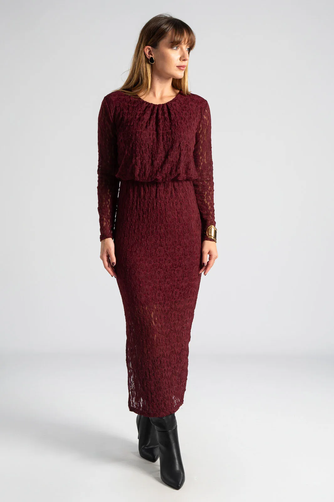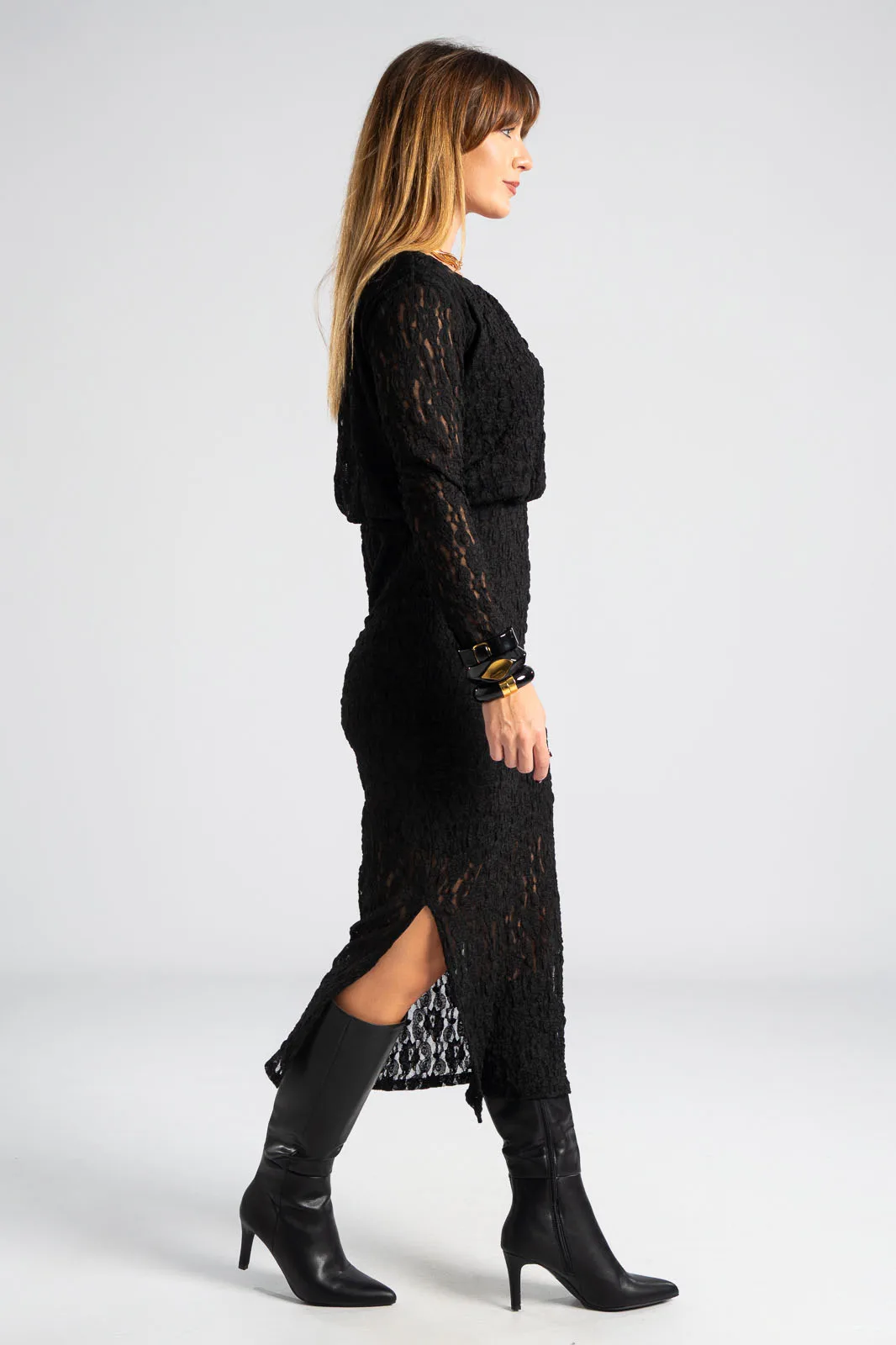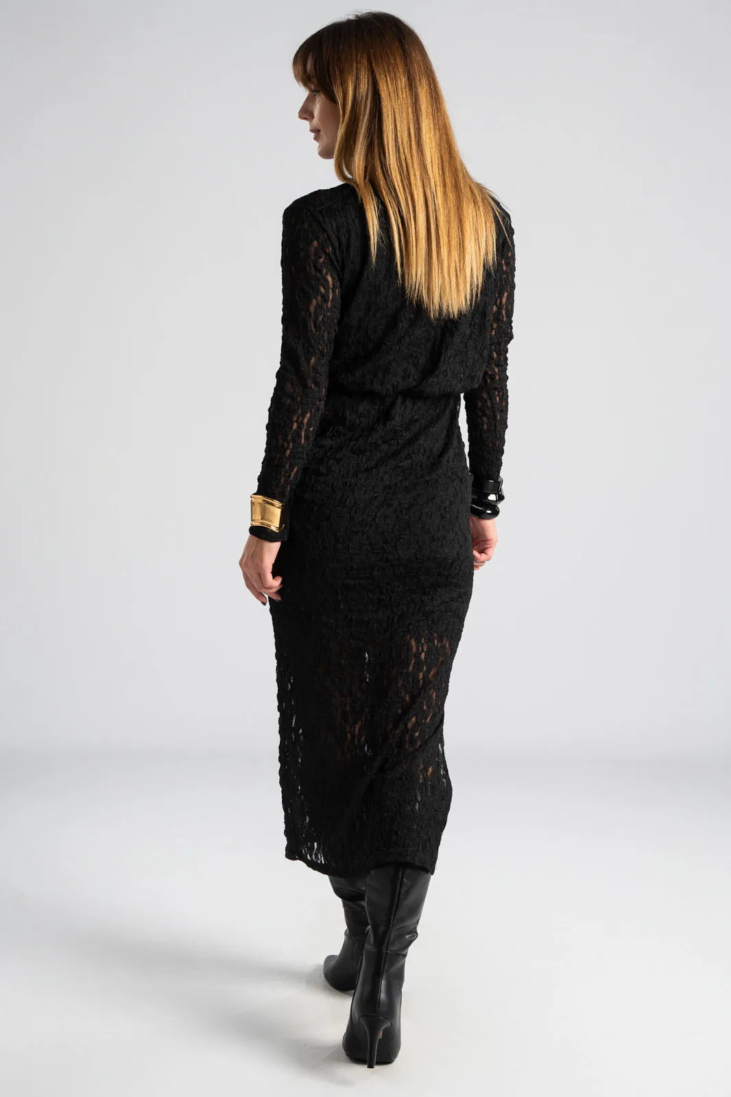 Φόρεμα maxi με δαντέλα σε όλη την επιφάνεια. Διαθέτει φόδρα σε όλο τον κορμό. Έχει μακριά μανίκια και στρογγυλή λαιμόκοψη. Στο ύψος της μέσης έχει λάστιχο. Στο τελείωμα στο πλάι έχει σκίσιμο. Αγκαλιάζει και αναδεικνύει πανέμορφα τις καμπύλες. Οι μετρήσεις του πίνακα είναι αντιπροσωπευτικές για κάθε προϊόν. 95% polyester, 5% elastan (εσωτερική φόδρα 95% viscose, 5% elastan).