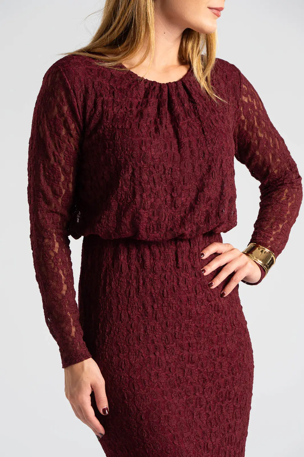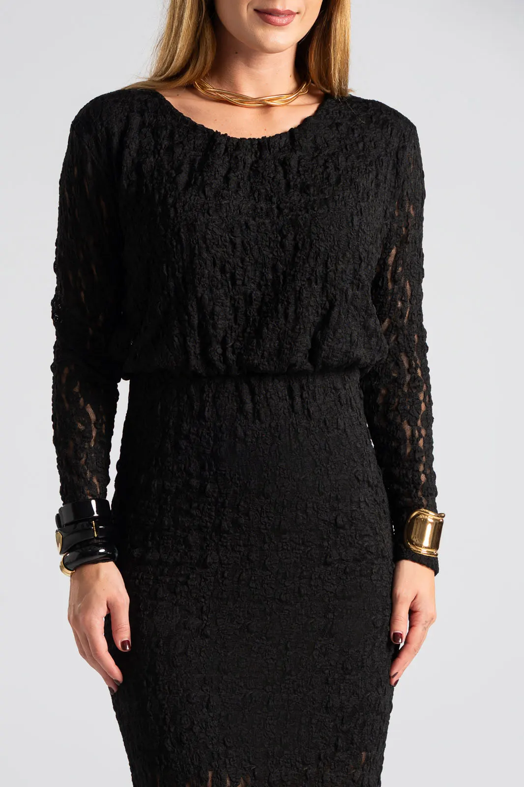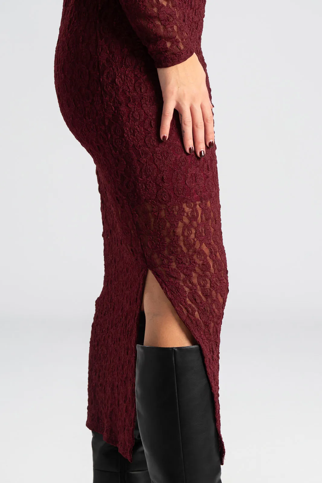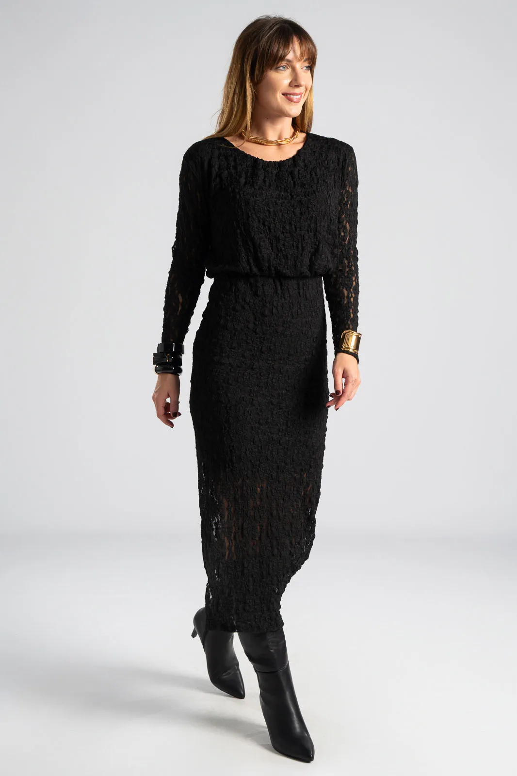 Φόρεμα maxi με δαντέλα σε όλη την επιφάνεια. Διαθέτει φόδρα σε όλο τον κορμό. Έχει μακριά μανίκια και στρογγυλή λαιμόκοψη. Στο ύψος της μέσης έχει λάστιχο. Στο τελείωμα στο πλάι έχει σκίσιμο. Αγκαλιάζει και αναδεικνύει πανέμορφα τις καμπύλες. Οι μετρήσεις του πίνακα είναι αντιπροσωπευτικές για κάθε προϊόν. 95% polyester, 5% elastan (εσωτερική φόδρα 95% viscose, 5% elastan).
