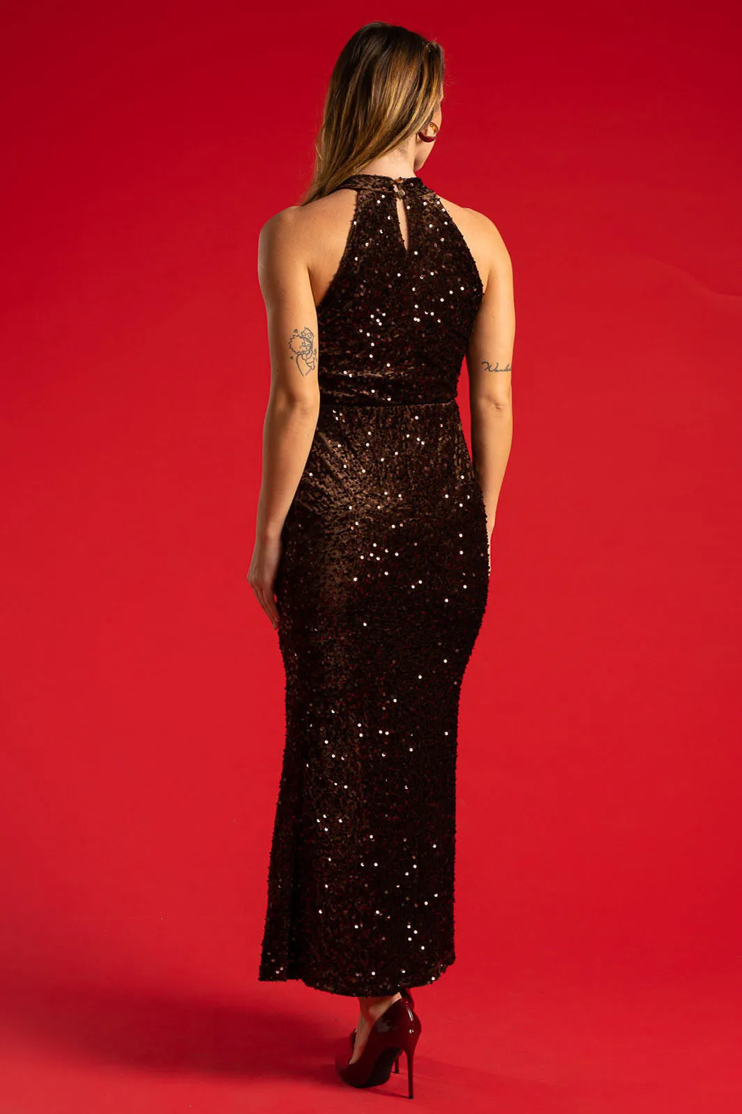 DRESS HALTER NECKLINE SEQUIN CHOCO