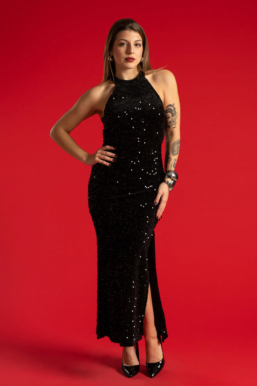 Halter neck dress. Fastens at the back of the neck with two buttons. Sleeveless with padded shoulders. Features cups for a better fit. It has elastic at the waist and is lined on the inside. It has a velvet texture and decorative sequins all over. It is maxi length and has an opening at the side. The measurements in the table are representative of each product. 100% polyester.