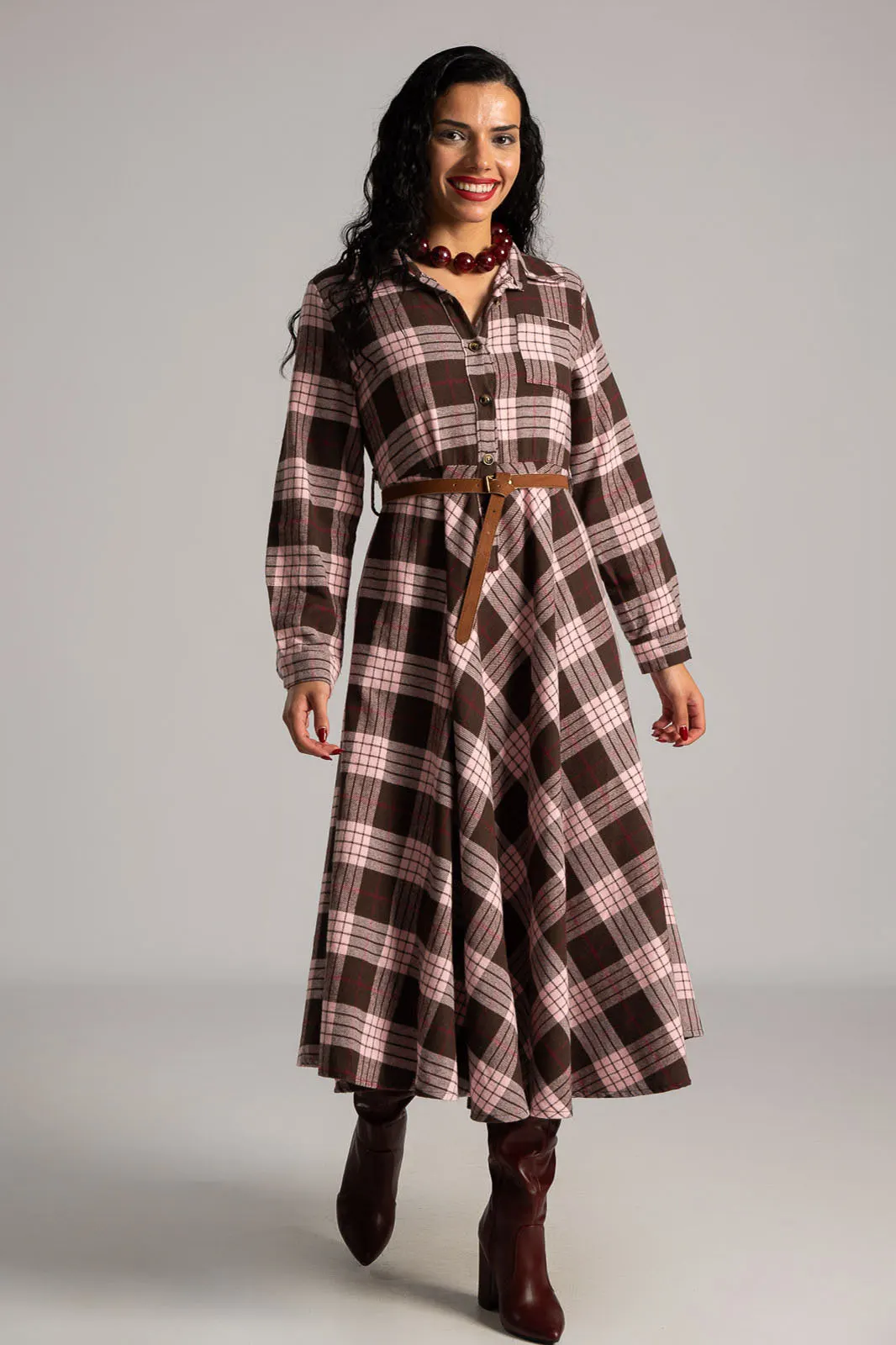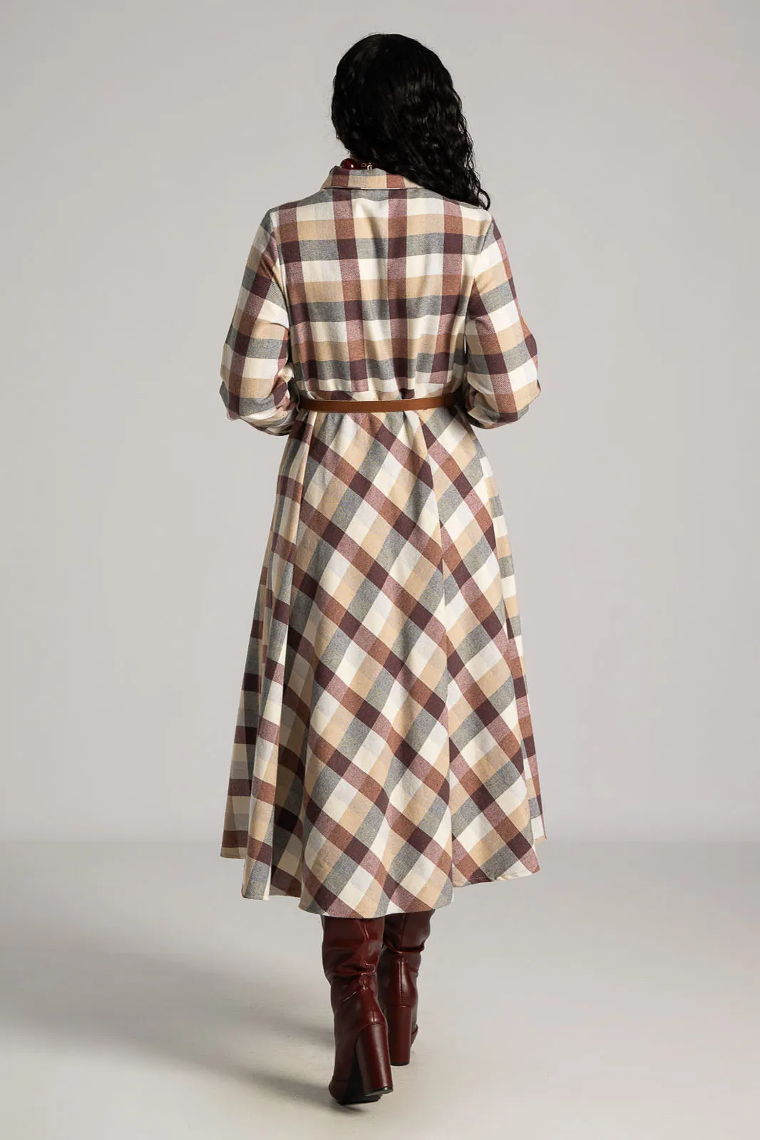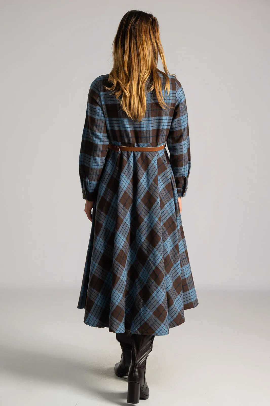 Dress with a soft texture. The top fastens with buttons and has a collar. There is a pocket on one side at the front. It has long sleeves that fasten with buttons. It has its own belt for a better fit. The skirt is A-line. It has a checkered pattern all over. The measurements in the table are representative for each code. 65% polyester, 33% viscose, 2% elastane.