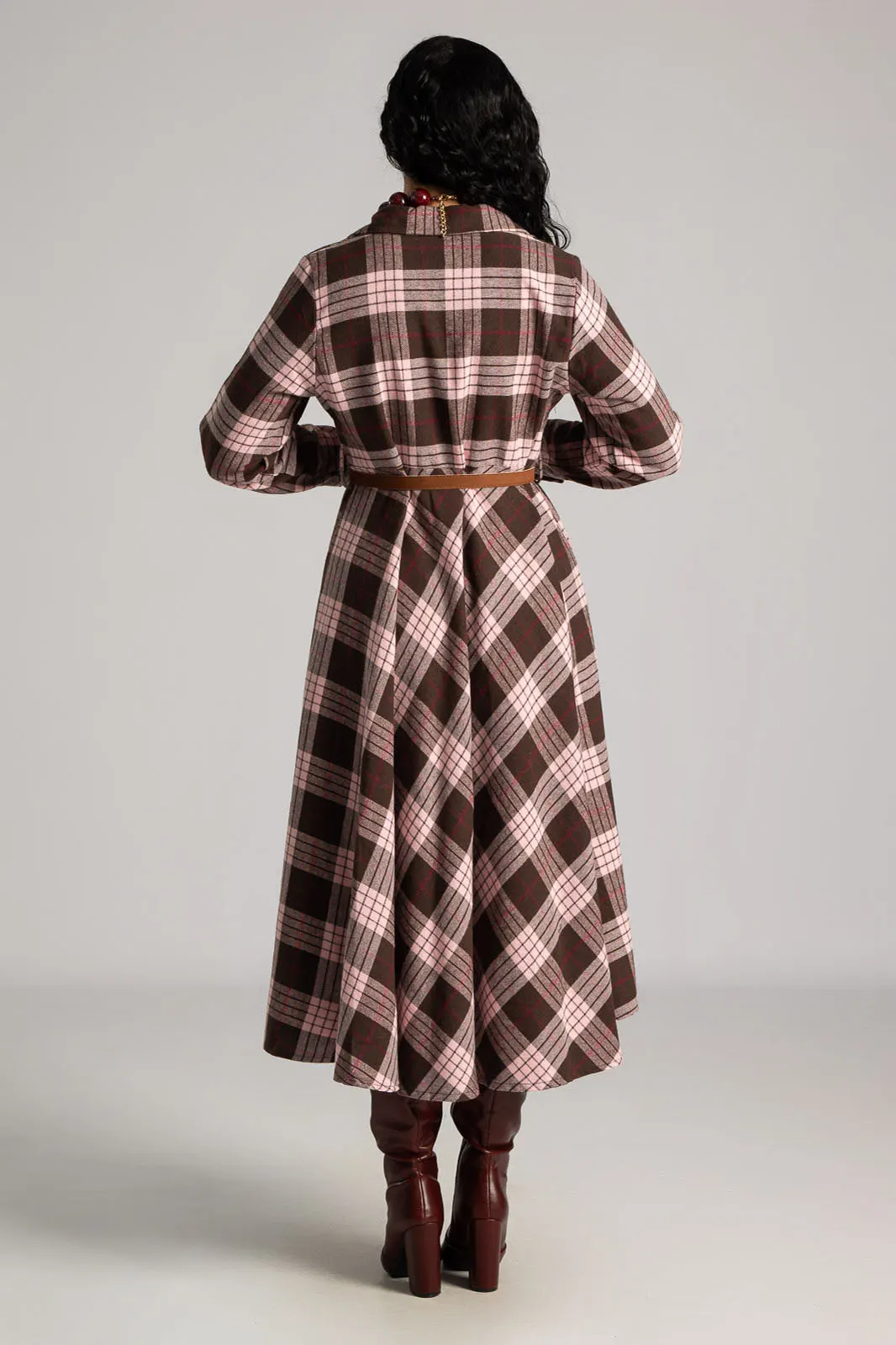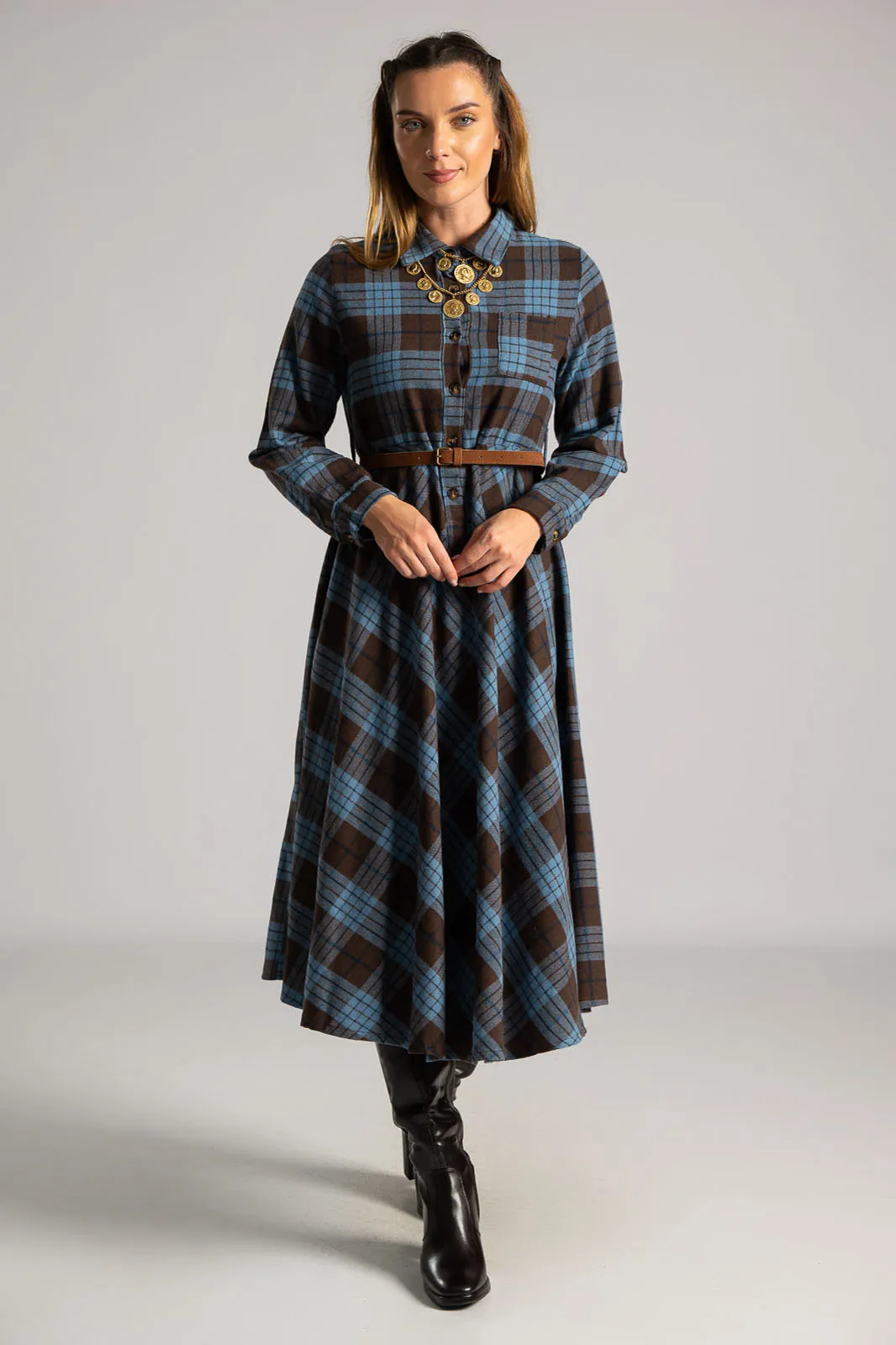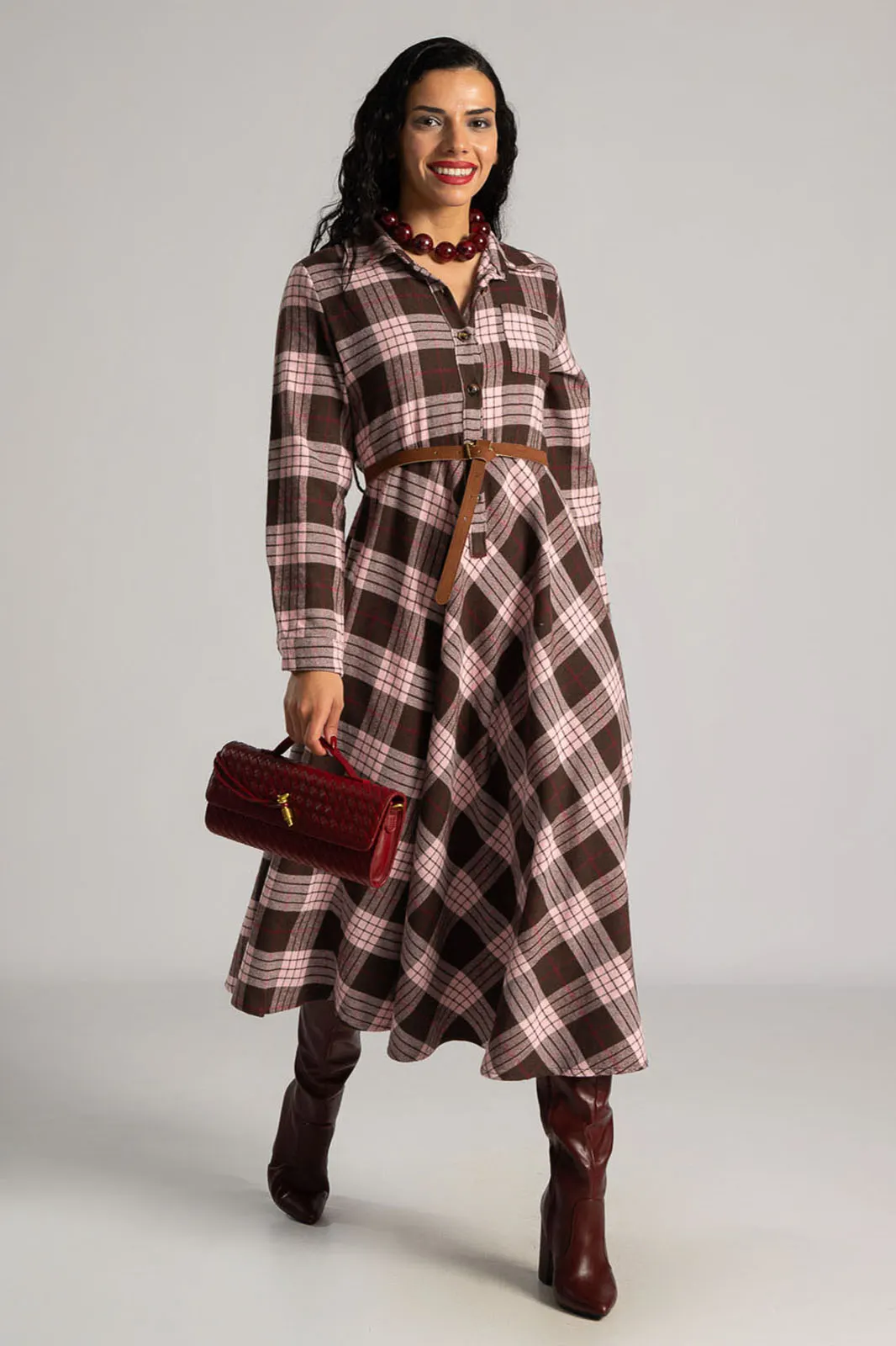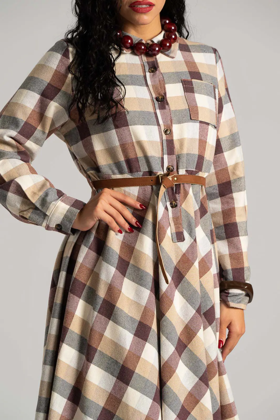 Dress with a soft texture. The top fastens with buttons and has a collar. There is a pocket on one side at the front. It has long sleeves that fasten with buttons. It has its own belt for a better fit. The skirt is A-line. It has a checkered pattern all over. The measurements in the table are representative for each code. 65% polyester, 33% viscose, 2% elastane.