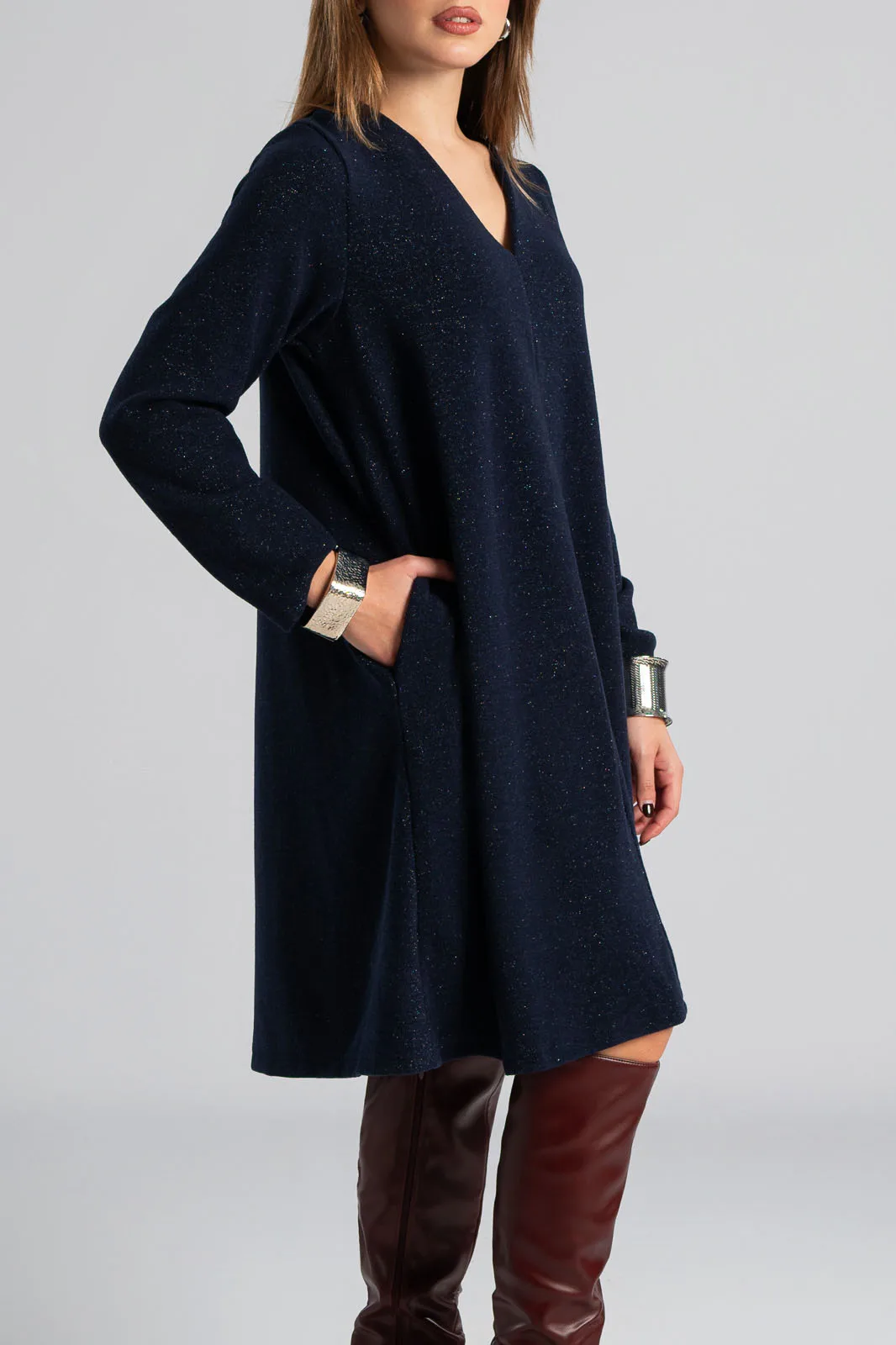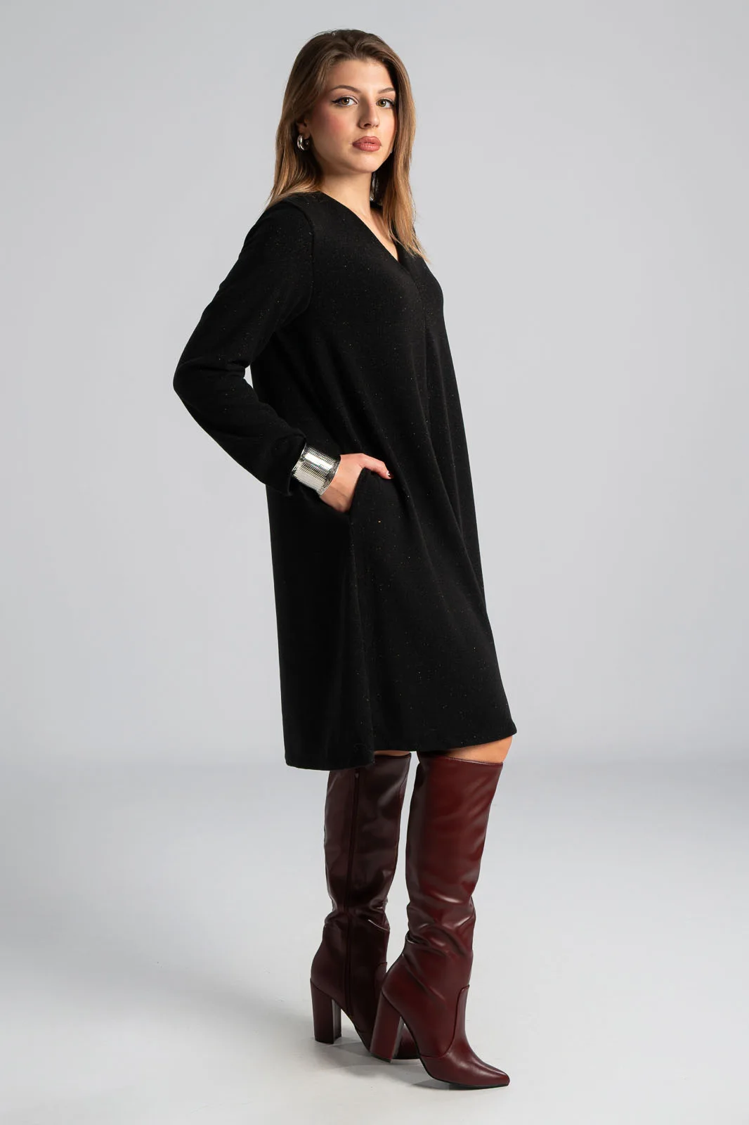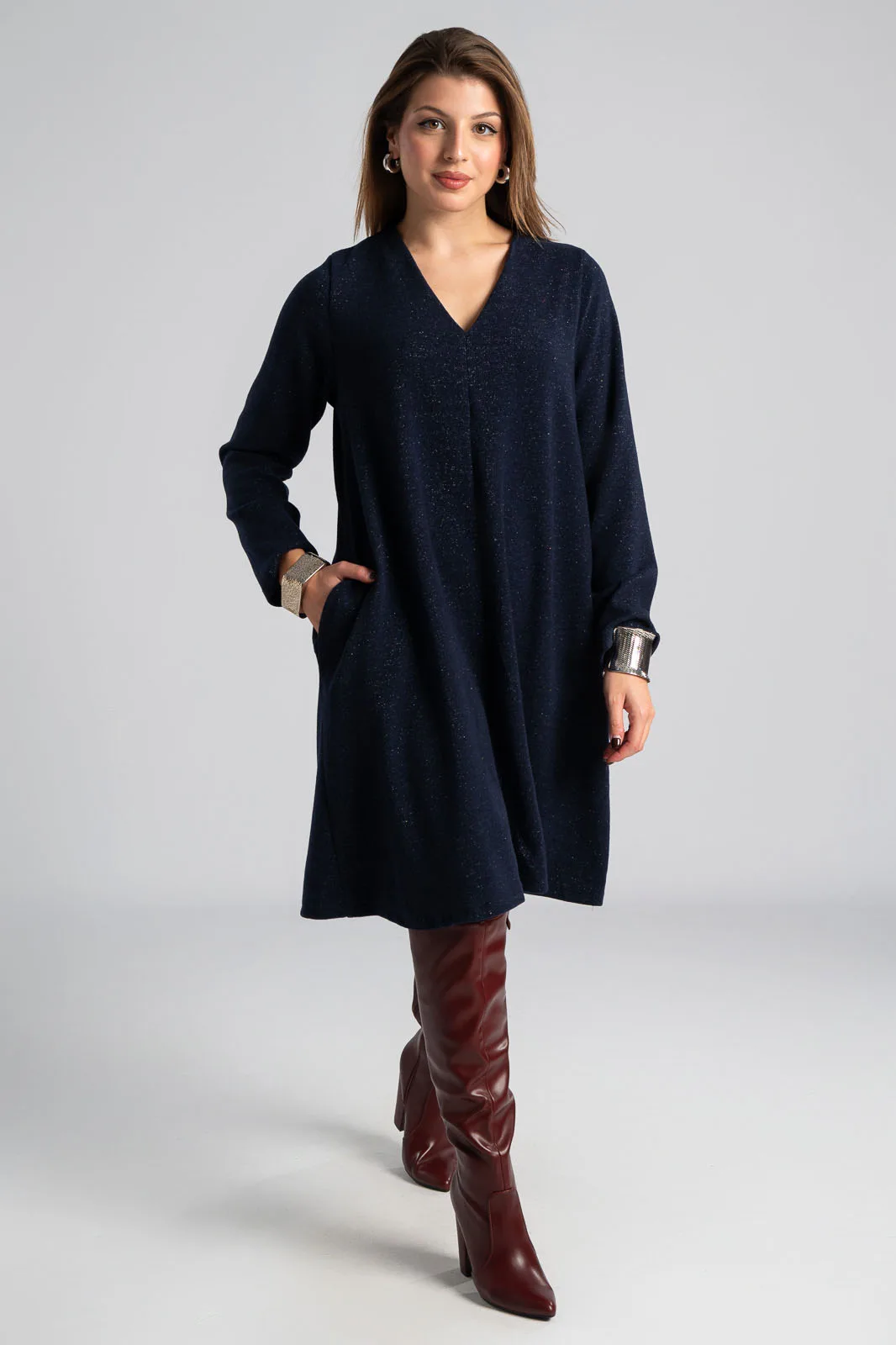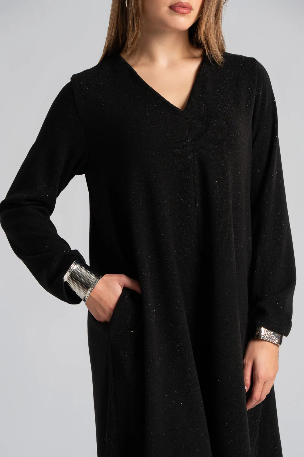Φόρεμα με νημάτινη συμπαγή πλέξη που διαθέτει V άνοιγμα στην λαιμόκοψη. Έχει μακριά μανίκια. Είναι midi. Σε όλη την επιφάνεια έχει διακοσμητική ασημοκλωστή. Στα πλαινά έχει τσέπες. Οι μετρήσεις του πίνακα είναι αντιπροσωπευτικές για κάθε κωδικό. 94% polyester, 5% viscose, 1% elastan.