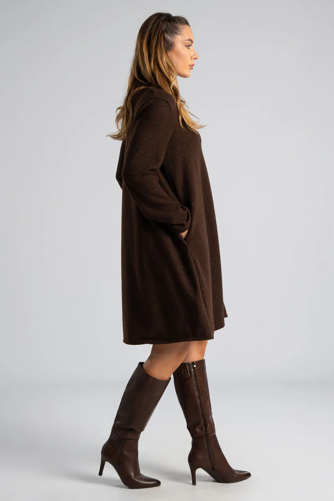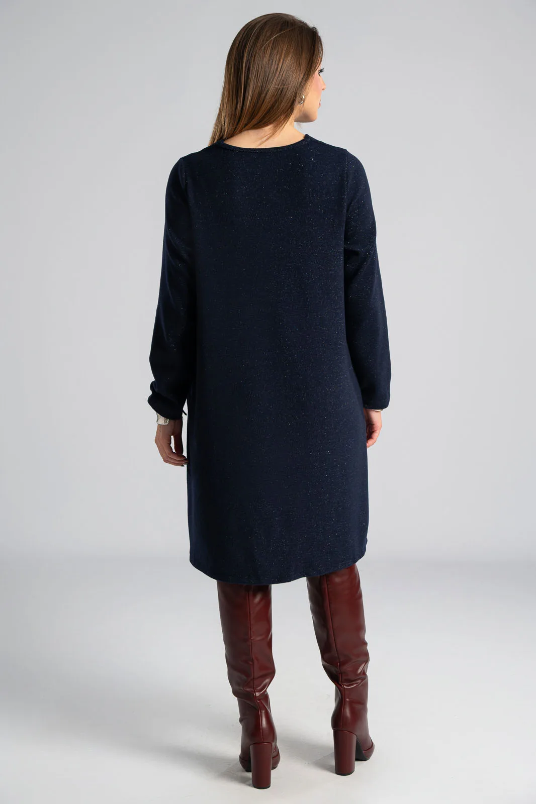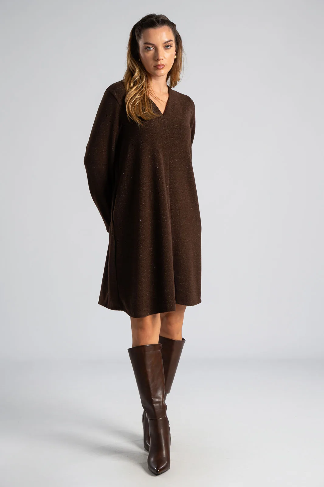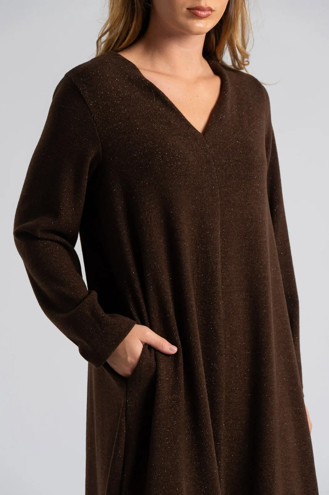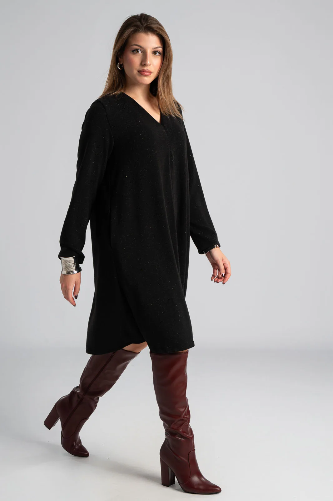 Φόρεμα με νημάτινη συμπαγή πλέξη που διαθέτει V άνοιγμα στην λαιμόκοψη. Έχει μακριά μανίκια. Είναι midi. Σε όλη την επιφάνεια έχει διακοσμητική ασημοκλωστή. Στα πλαινά έχει τσέπες. Οι μετρήσεις του πίνακα είναι αντιπροσωπευτικές για κάθε κωδικό. 94% polyester, 5% viscose, 1% elastan.