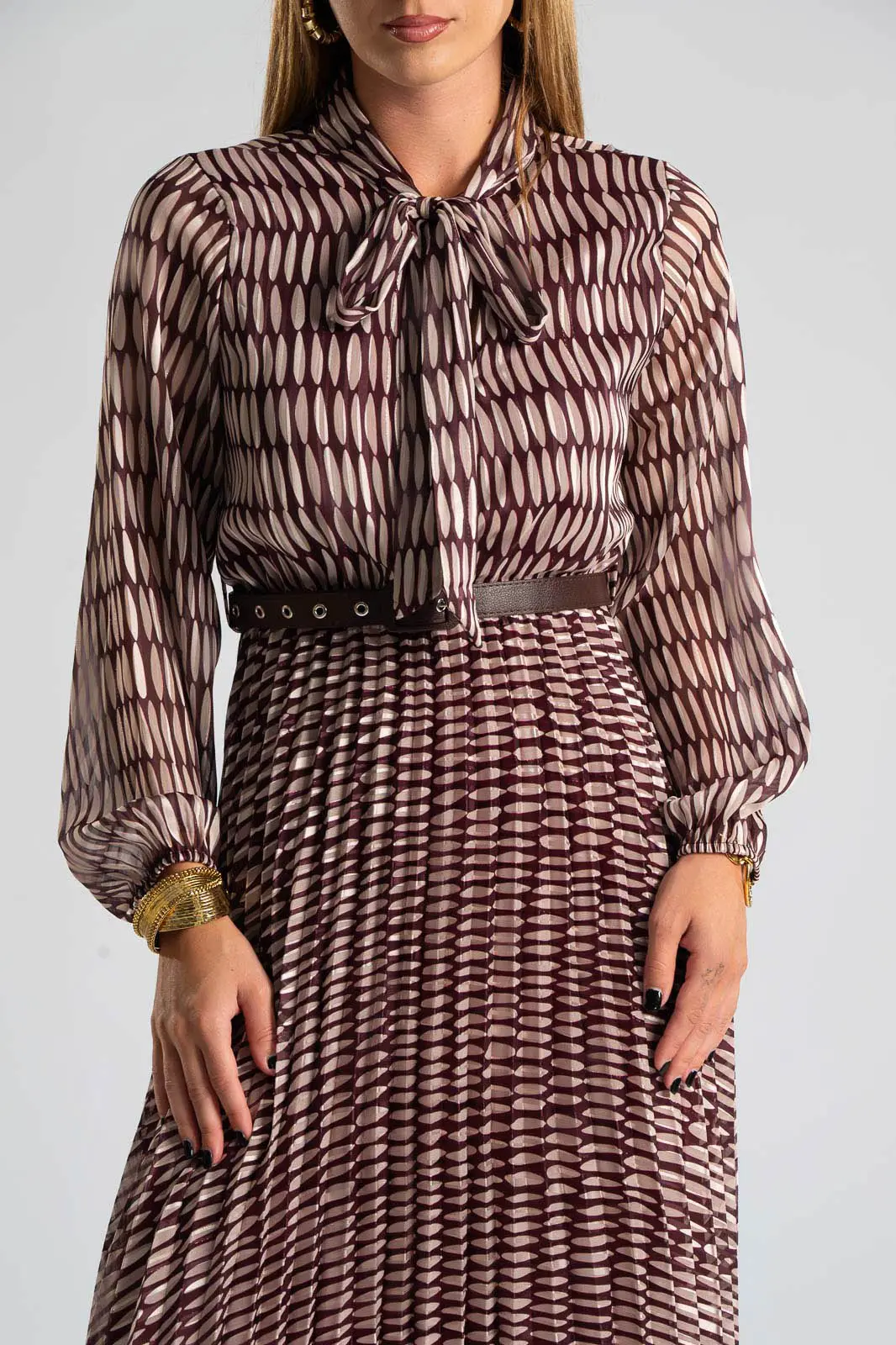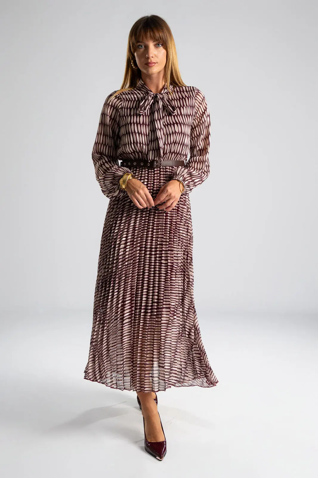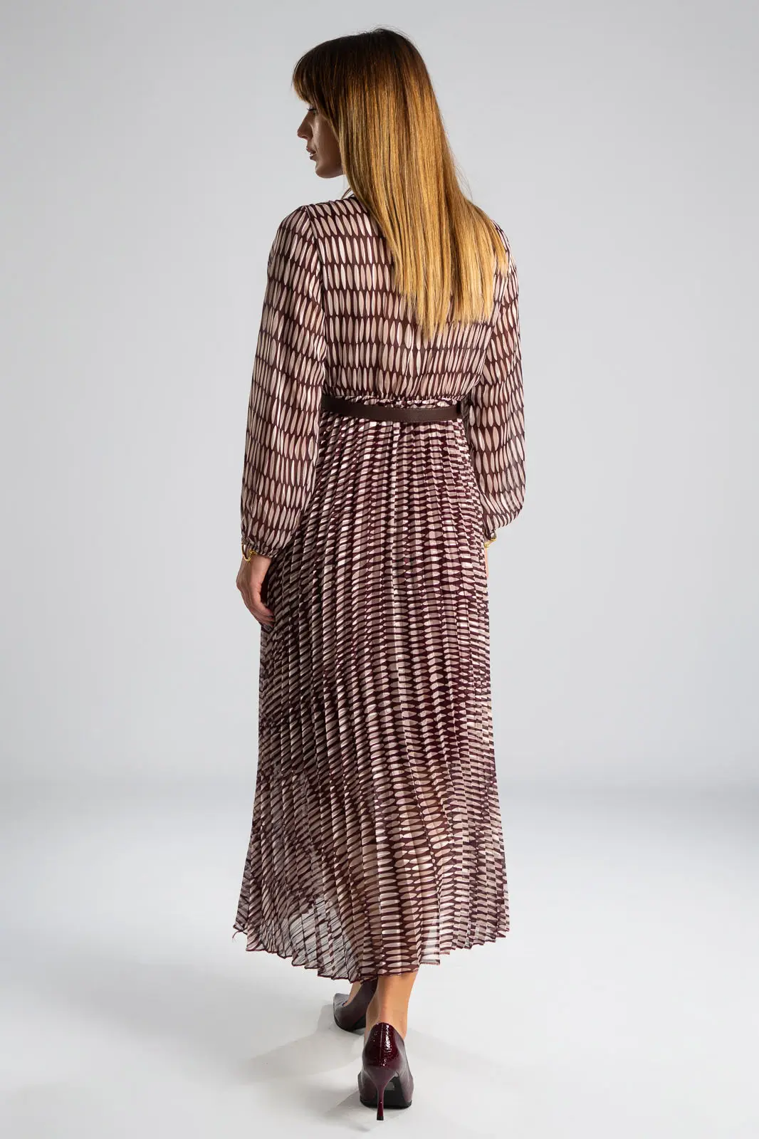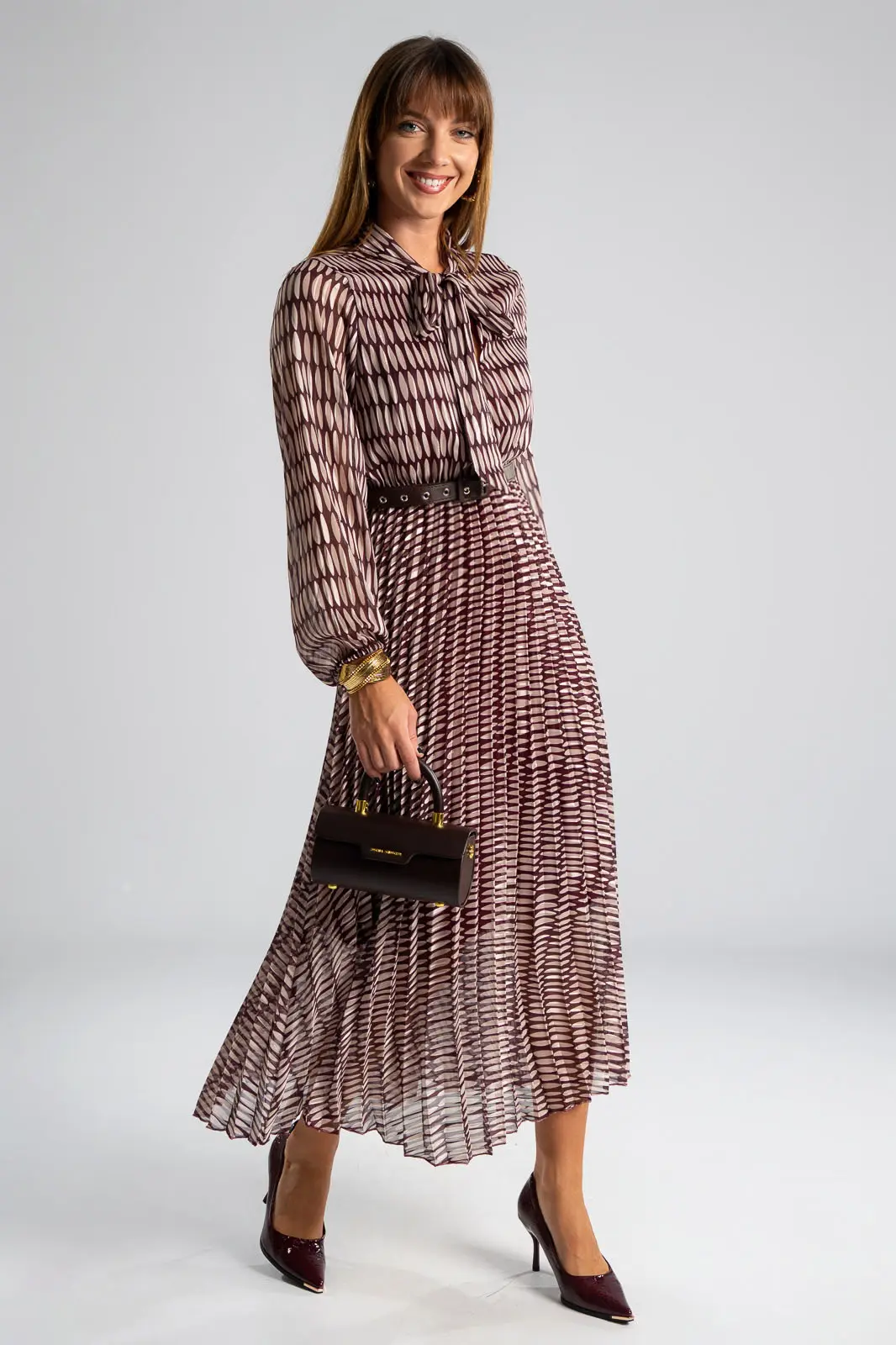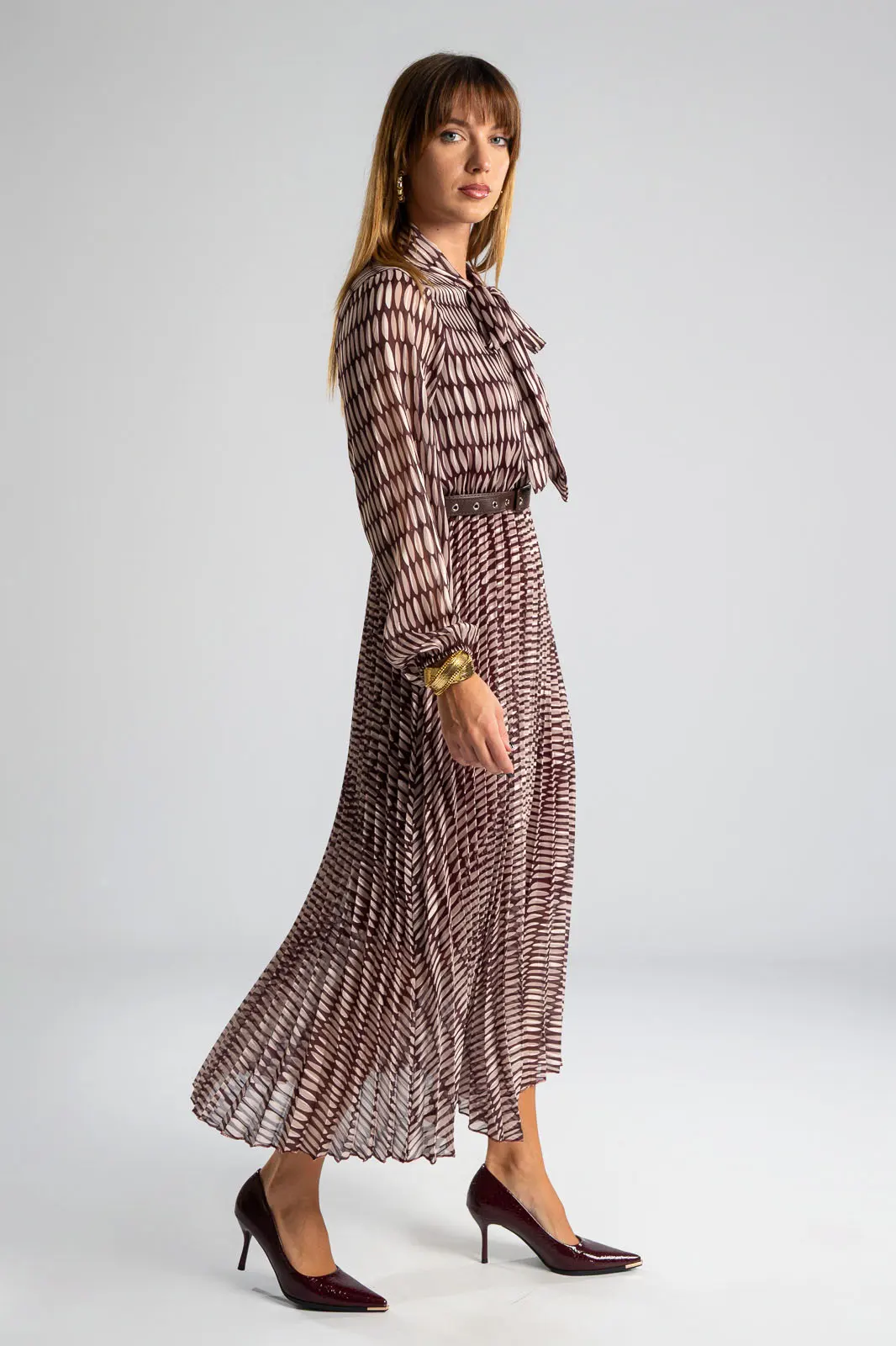 Φόρεμα με V άνοιγμα στην λαιμόκοψη που κλείνει με δέσιμο. Έχει μακριά μανίκια που καταλήγουν σε λεπτό λάστιχο. Σε όλη την επιφάνεια έχει Lurex και εμπριμέ σχέδιο. Έχει δική του ζώνη στη μέση για καλύτερη εφαρμογή. Έχει λάστιχο στη μέση. Η φούστα είναι πλισέ. Εσωτερικά είναι φοδραρισμένο. Είναι maxi. Οι μετρήσεις του πίνακα είναι αντιπροσωπευτικές για κάθε προϊόν. 95% polyester, 5% elastan. 100% viscose (εσωτερική φόδρα)