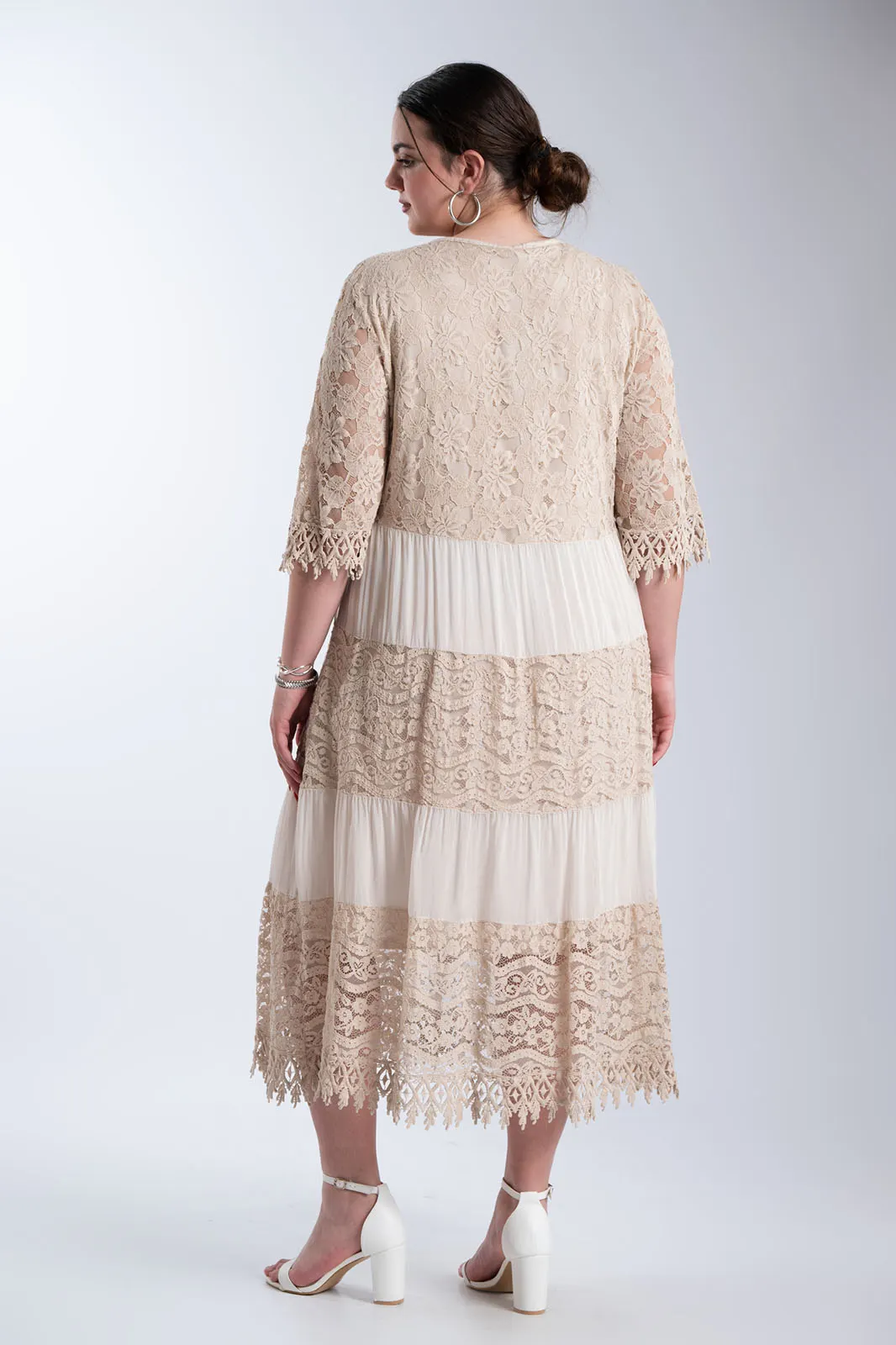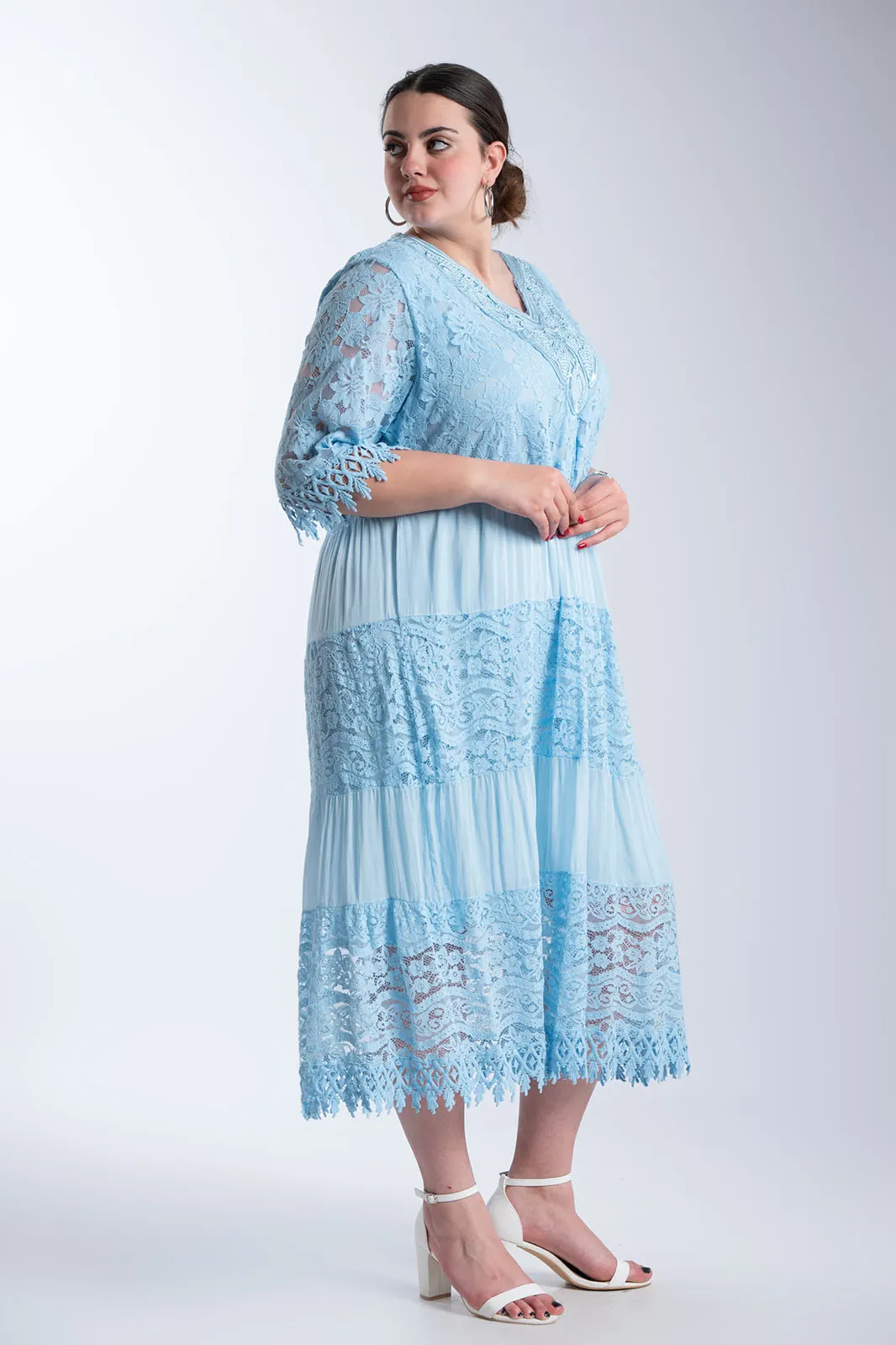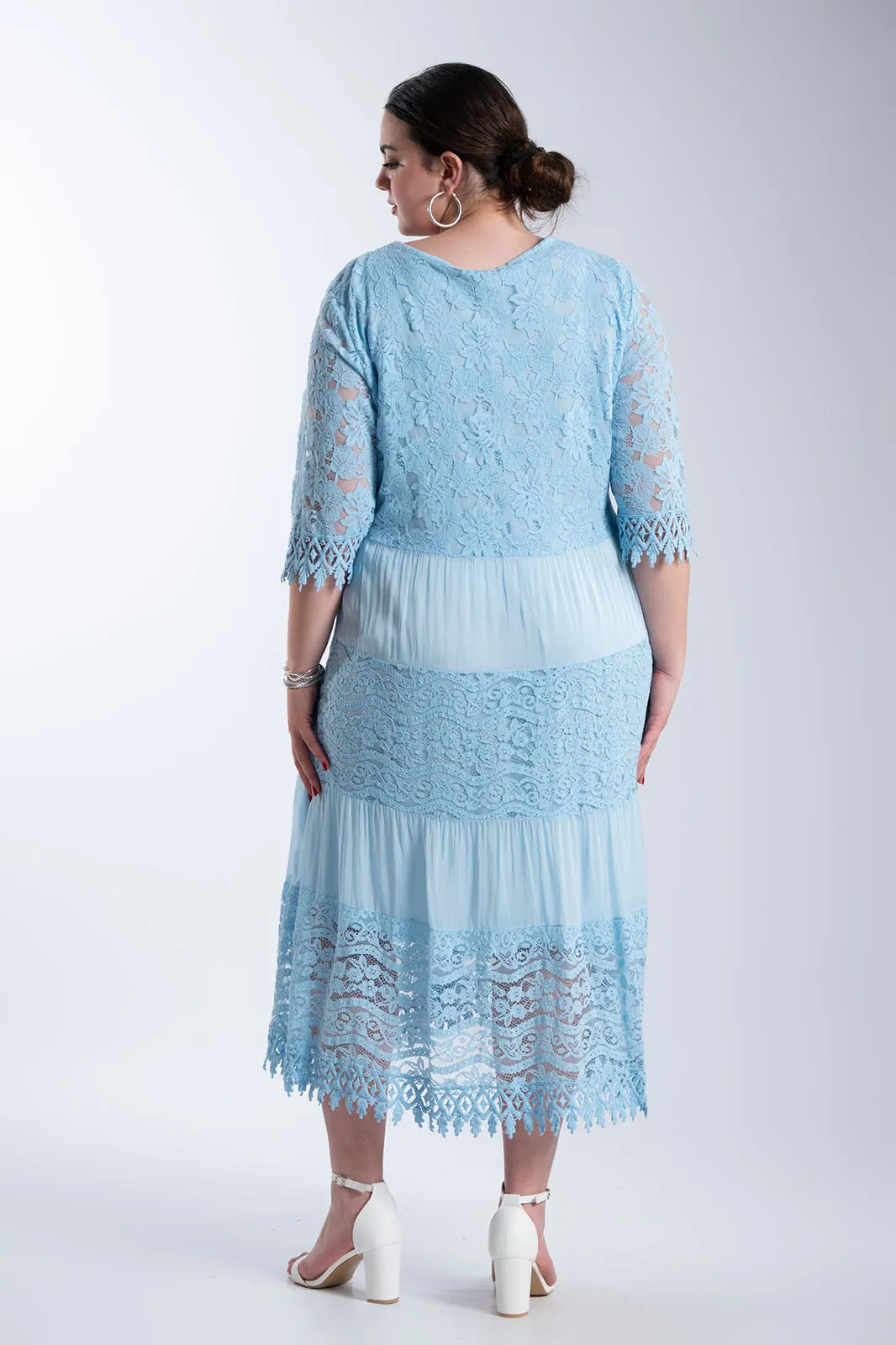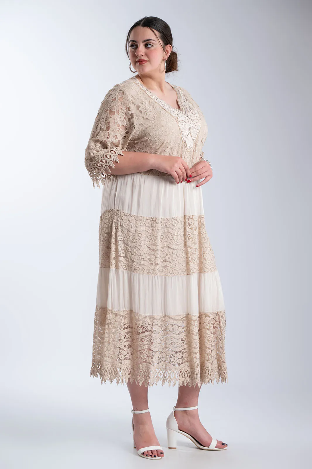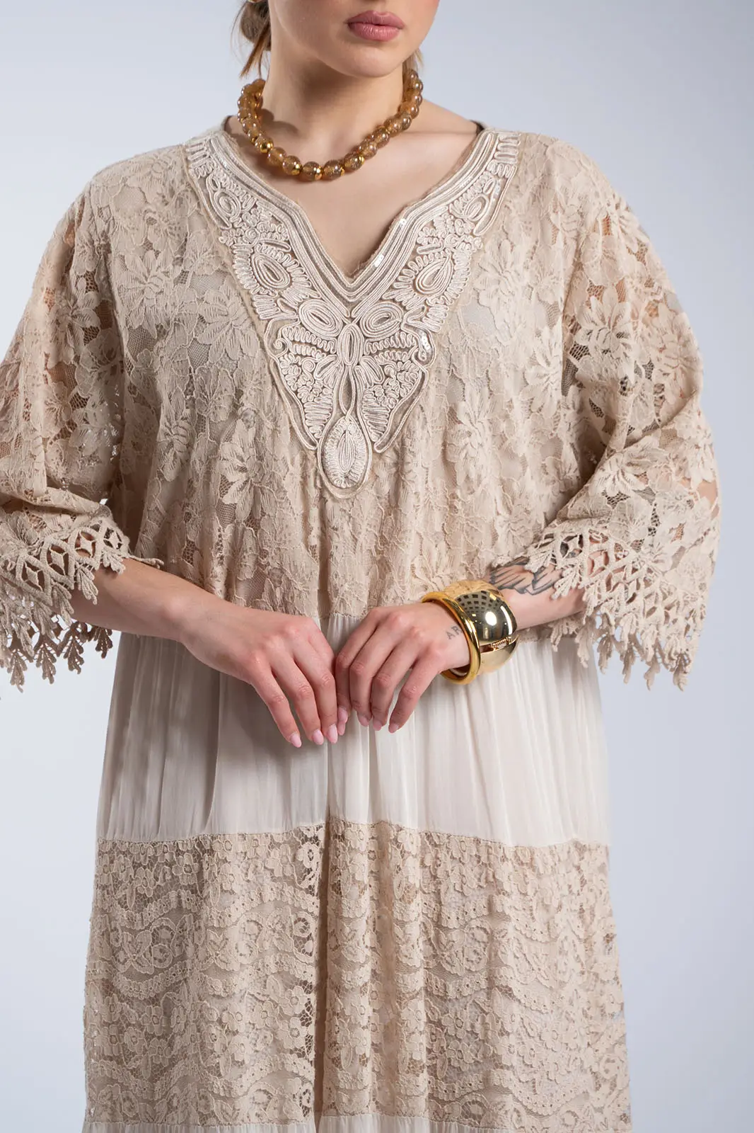 Αέρινο midi φόρεμα με δαντελένια υφή που αποπνέει ρομαντισμό και κομψότητα. Το επάνω μέρος διακοσμείται με εντυπωσιακό κέντημα στο ντεκολτέ, προσθέτοντας ιδιαίτερο χαρακτήρα και λεπτομέρεια στο σύνολο. Τα 3/4 μανίκια και το επάνω μέρος είναι από δαντέλα, ενώ η φούστα δημιουργεί ένα όμορφο layering effect με συνδυασμό διαφάνειας και υφής. Διαθέτει εσωτερική φόδρα για άνεση και σωστή εφαρμογή, ενώ η χαλαρή γραμμή του το καθιστά ιδανικό για κομψές αλλά και πιο casual εμφανίσεις.
