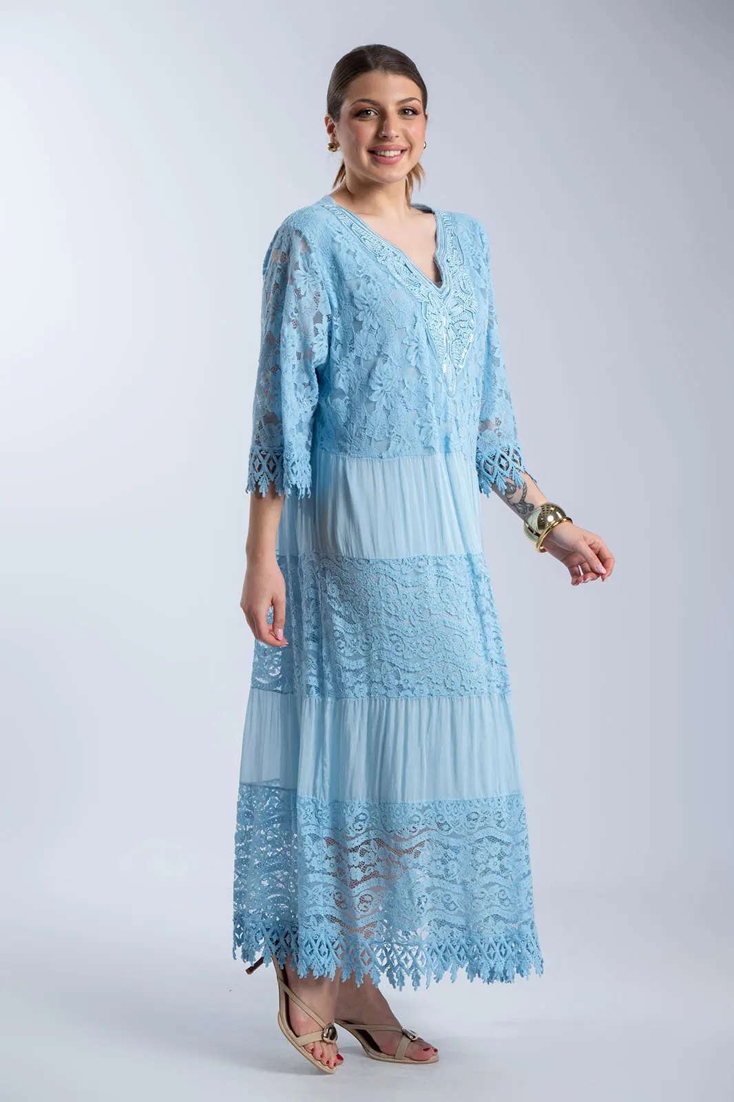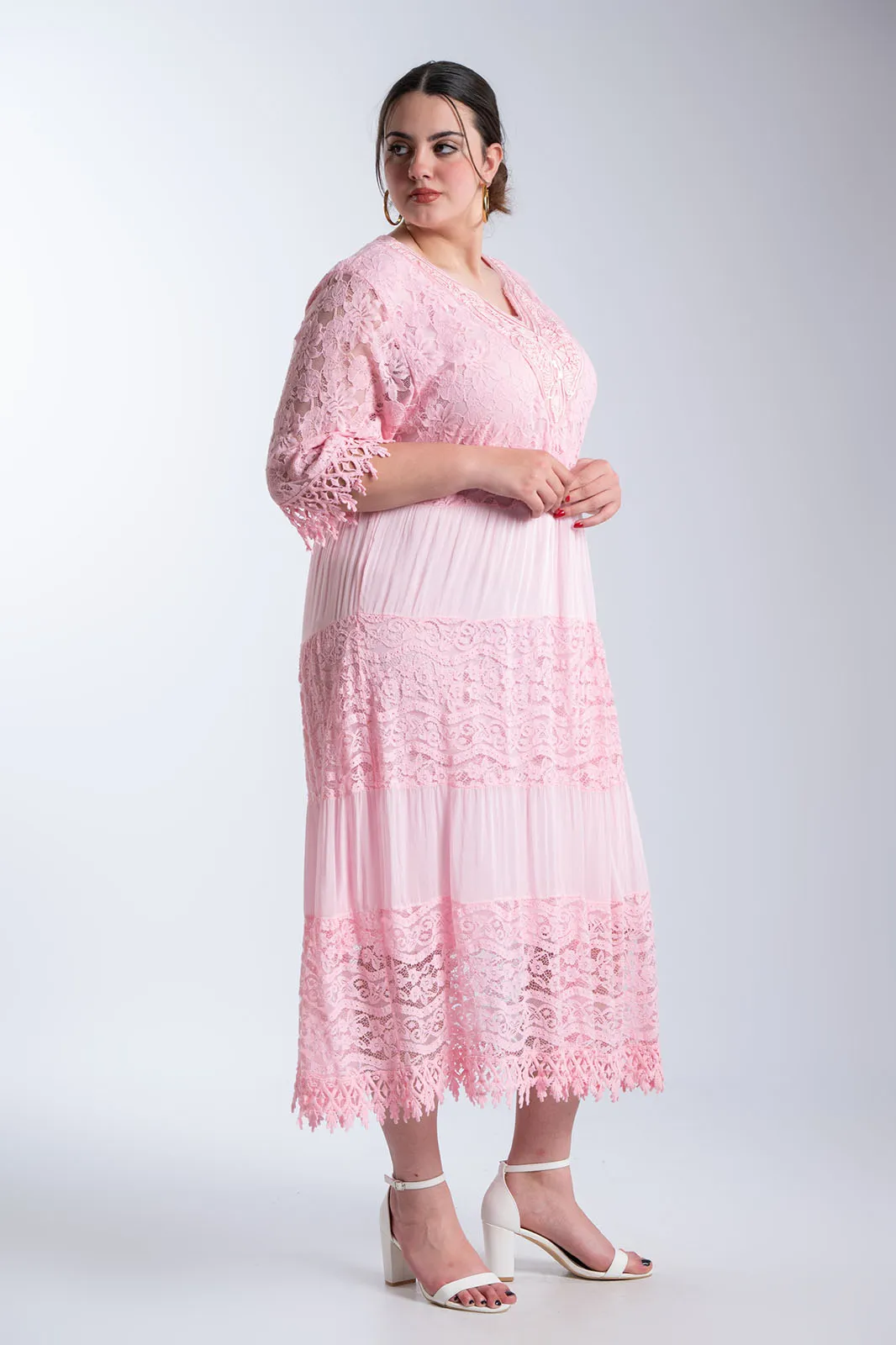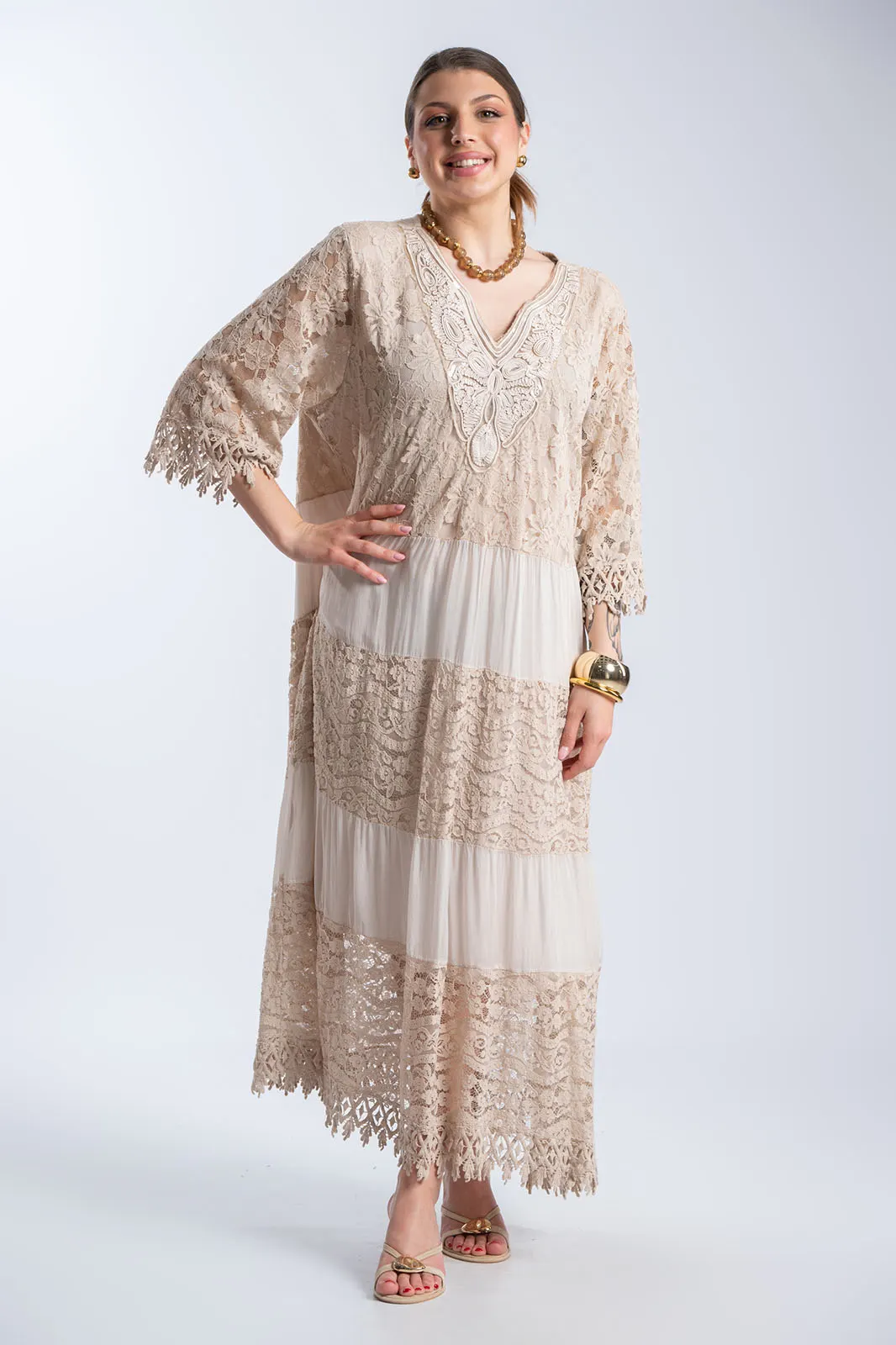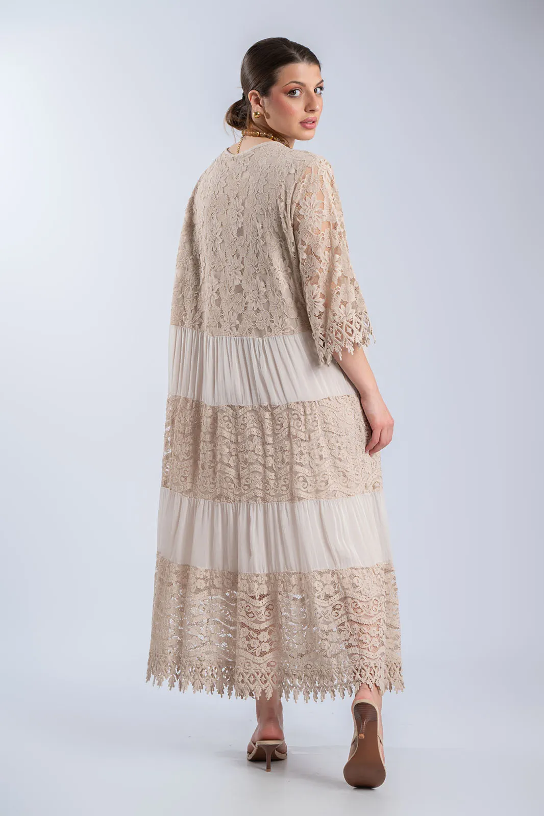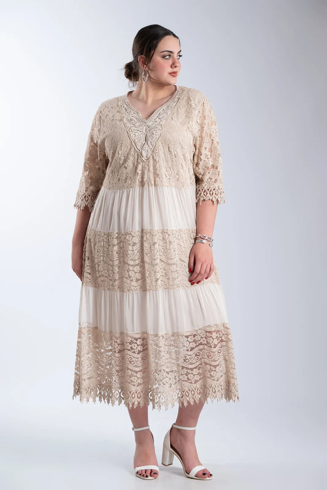 Αέρινο midi φόρεμα με δαντελένια υφή που αποπνέει ρομαντισμό και κομψότητα. Το επάνω μέρος διακοσμείται με εντυπωσιακό κέντημα στο ντεκολτέ, προσθέτοντας ιδιαίτερο χαρακτήρα και λεπτομέρεια στο σύνολο. Τα 3/4 μανίκια και το επάνω μέρος είναι από δαντέλα, ενώ η φούστα δημιουργεί ένα όμορφο layering effect με συνδυασμό διαφάνειας και υφής. Διαθέτει εσωτερική φόδρα για άνεση και σωστή εφαρμογή, ενώ η χαλαρή γραμμή του το καθιστά ιδανικό για κομψές αλλά και πιο casual εμφανίσεις.