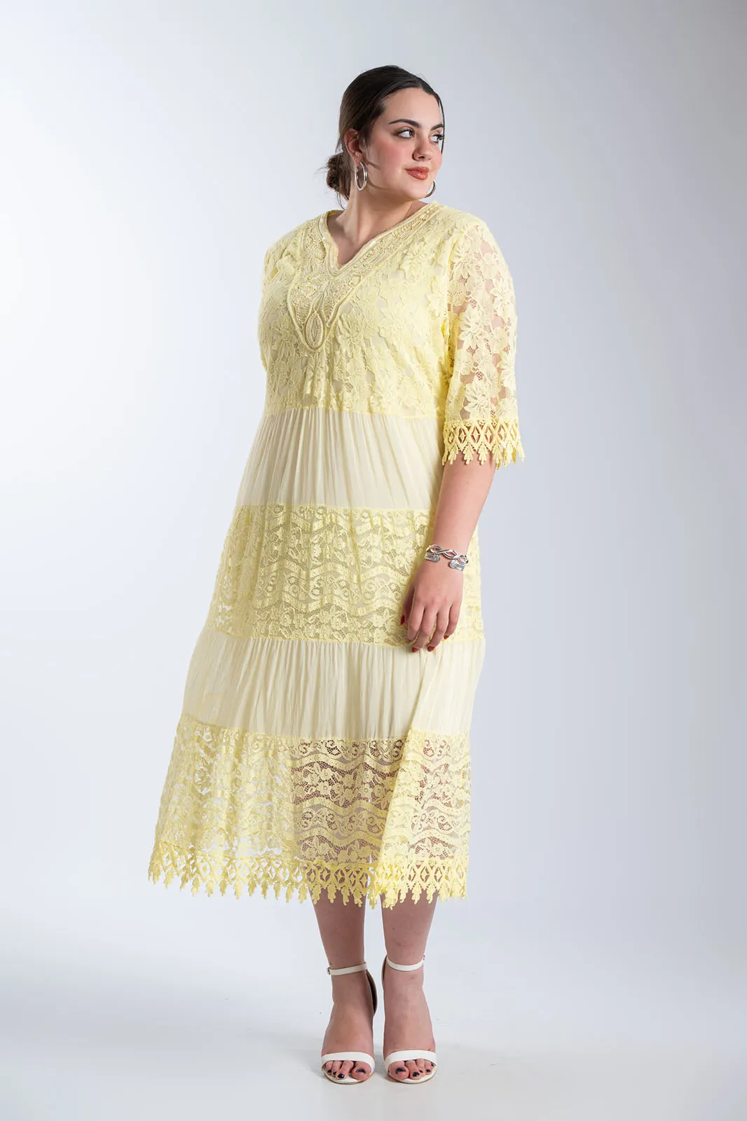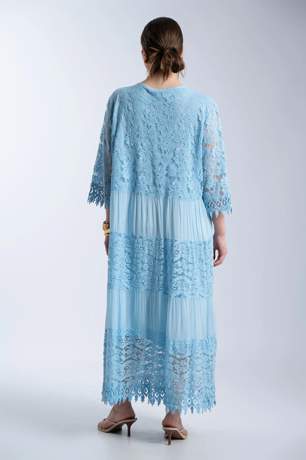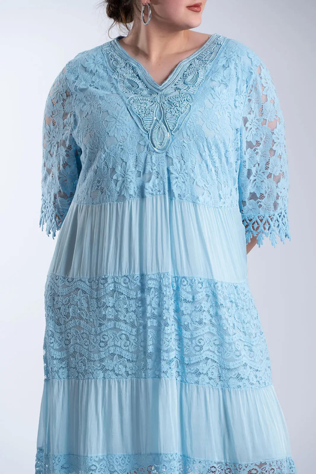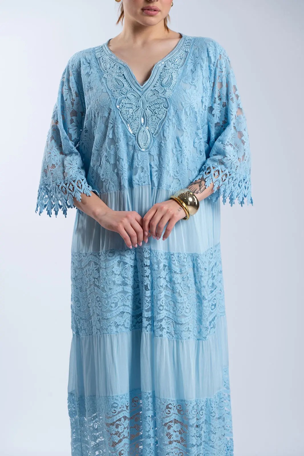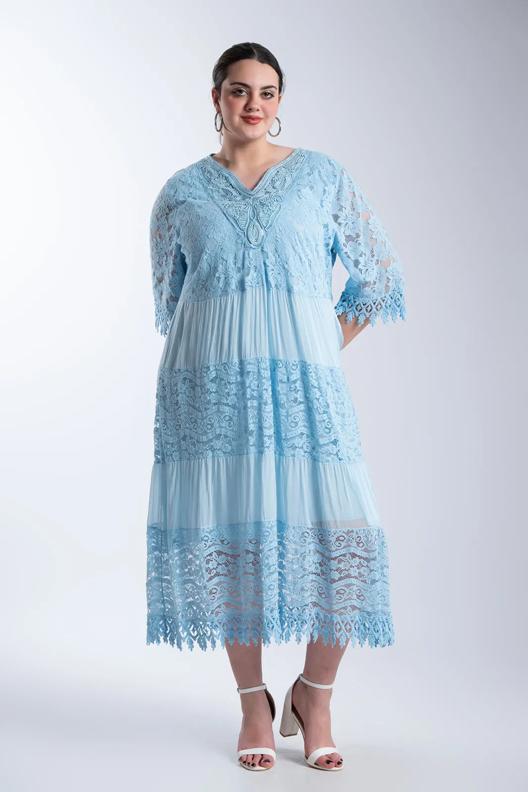 Αέρινο midi φόρεμα με δαντελένια υφή που αποπνέει ρομαντισμό και κομψότητα. Το επάνω μέρος διακοσμείται με εντυπωσιακό κέντημα στο ντεκολτέ, προσθέτοντας ιδιαίτερο χαρακτήρα και λεπτομέρεια στο σύνολο. Τα 3/4 μανίκια και το επάνω μέρος είναι από δαντέλα, ενώ η φούστα δημιουργεί ένα όμορφο layering effect με συνδυασμό διαφάνειας και υφής. Διαθέτει εσωτερική φόδρα για άνεση και σωστή εφαρμογή, ενώ η χαλαρή γραμμή του το καθιστά ιδανικό για κομψές αλλά και πιο casual εμφανίσεις.