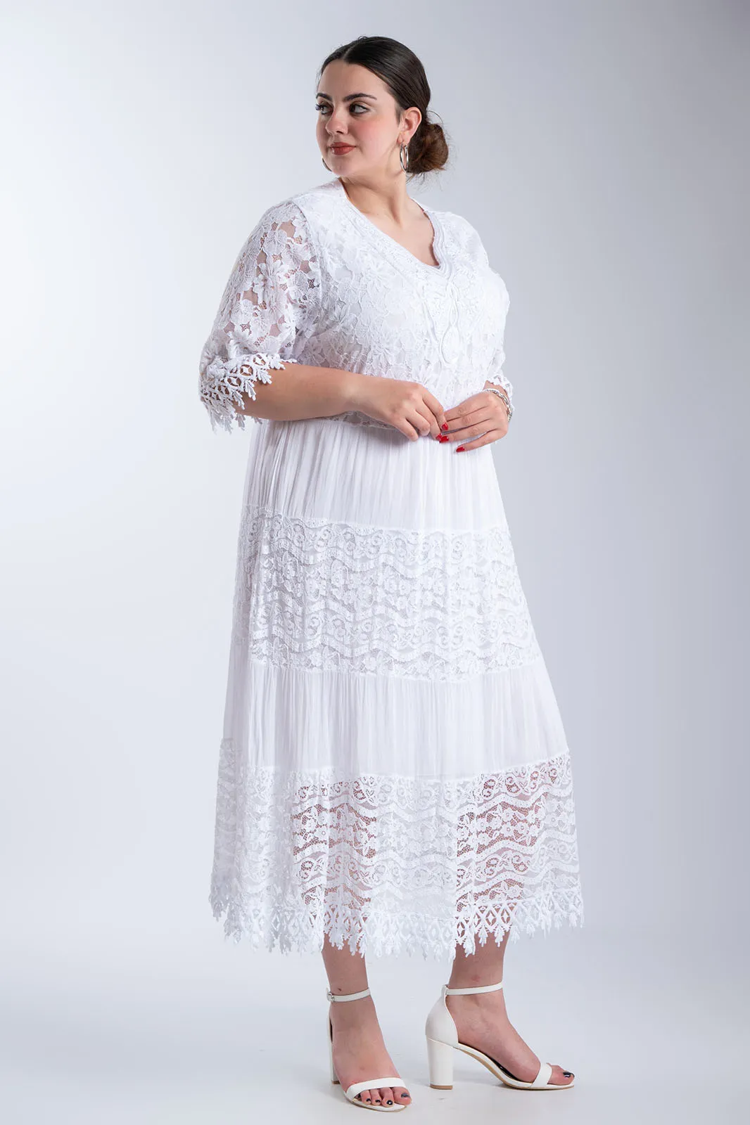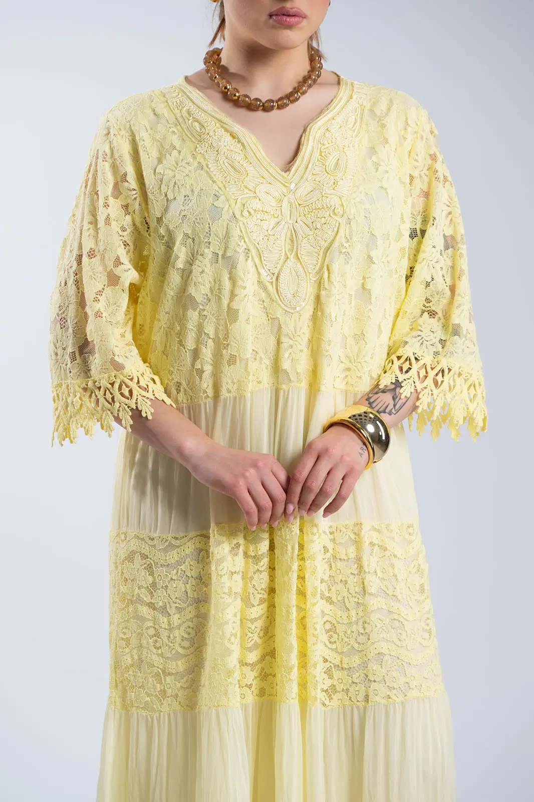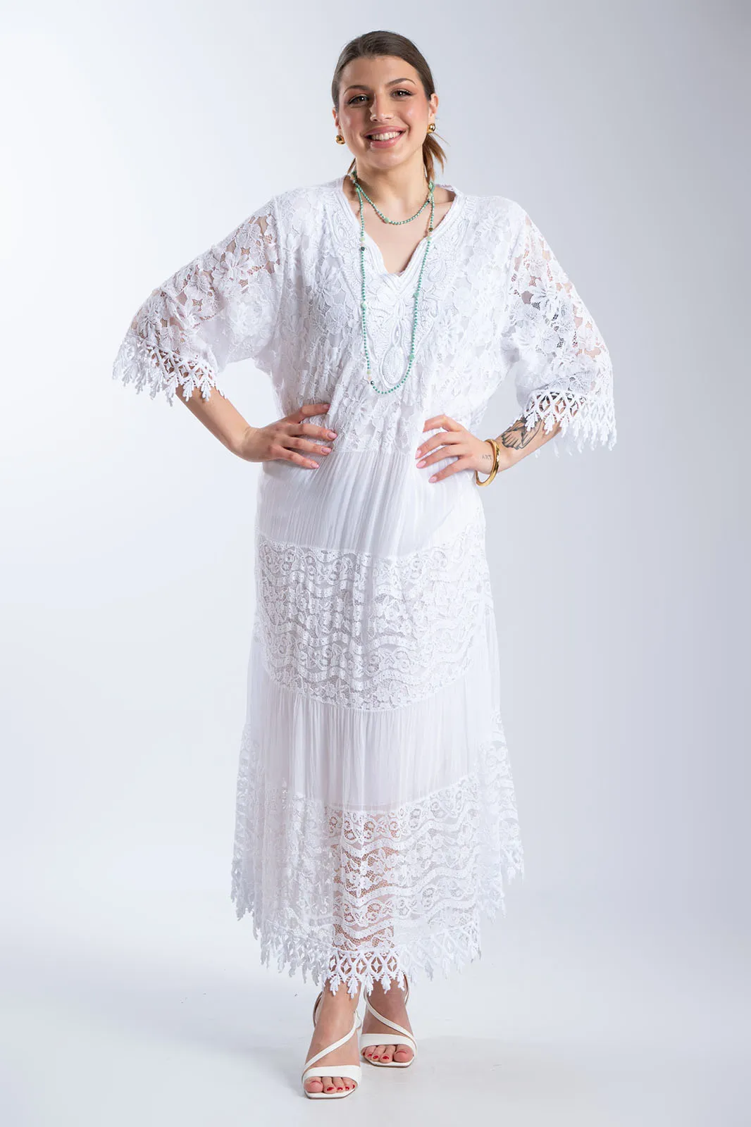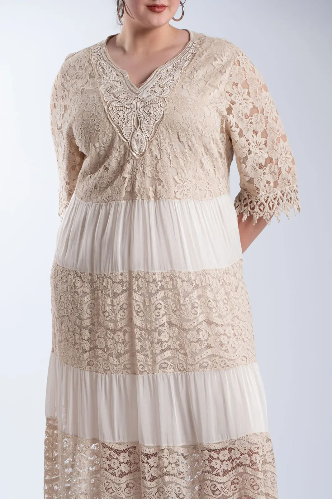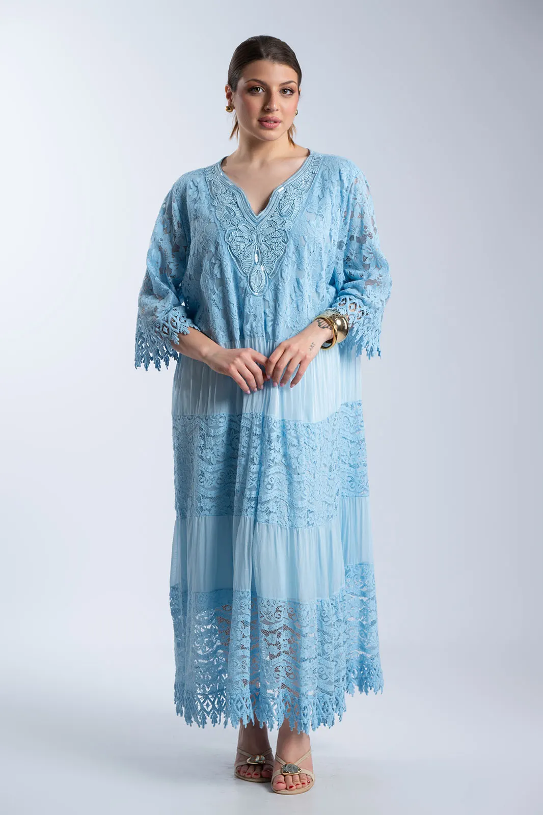 Αέρινο midi φόρεμα με δαντελένια υφή που αποπνέει ρομαντισμό και κομψότητα. Το επάνω μέρος διακοσμείται με εντυπωσιακό κέντημα στο ντεκολτέ, προσθέτοντας ιδιαίτερο χαρακτήρα και λεπτομέρεια στο σύνολο. Τα 3/4 μανίκια και το επάνω μέρος είναι από δαντέλα, ενώ η φούστα δημιουργεί ένα όμορφο layering effect με συνδυασμό διαφάνειας και υφής. Διαθέτει εσωτερική φόδρα για άνεση και σωστή εφαρμογή, ενώ η χαλαρή γραμμή του το καθιστά ιδανικό για κομψές αλλά και πιο casual εμφανίσεις.