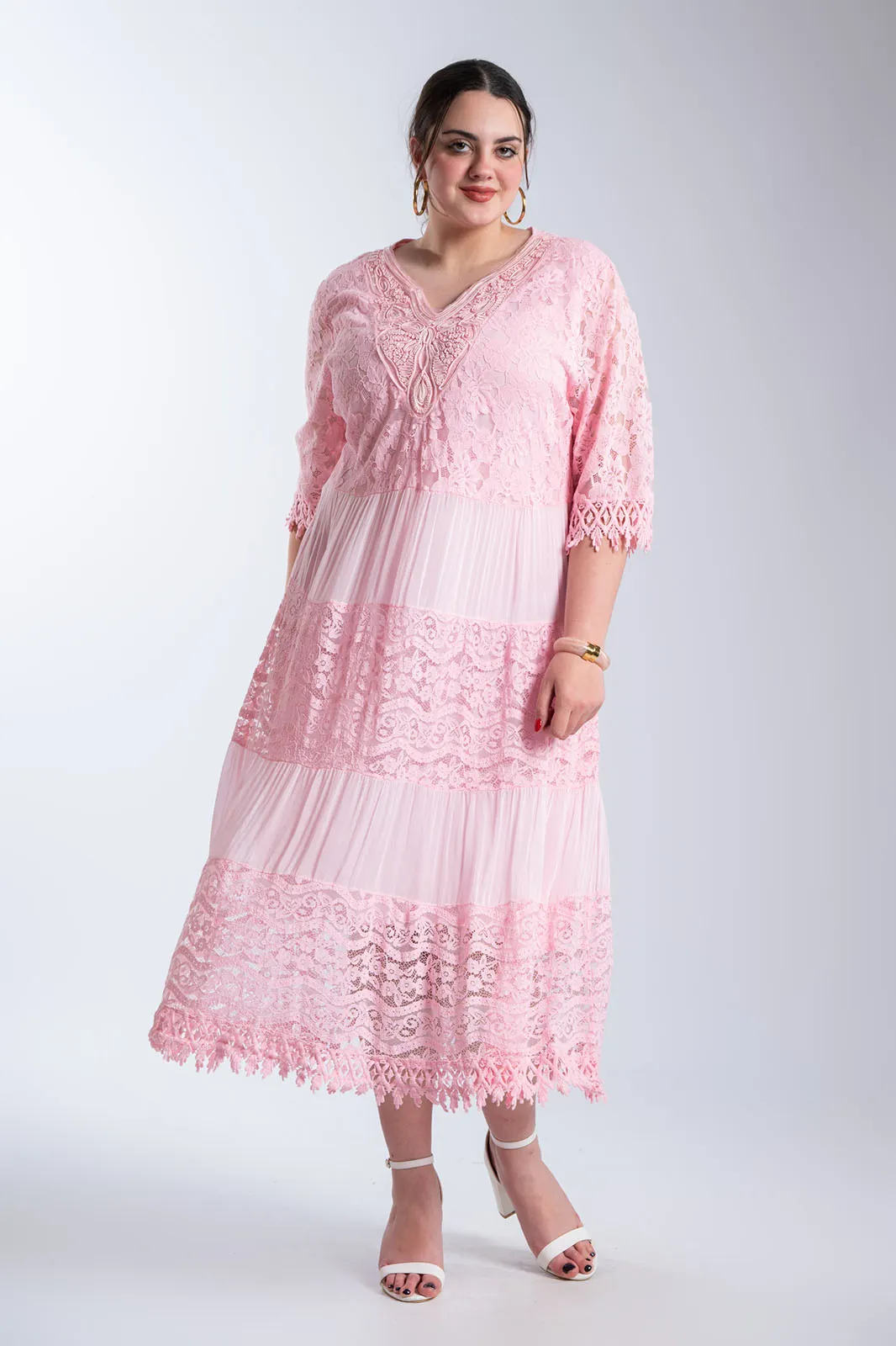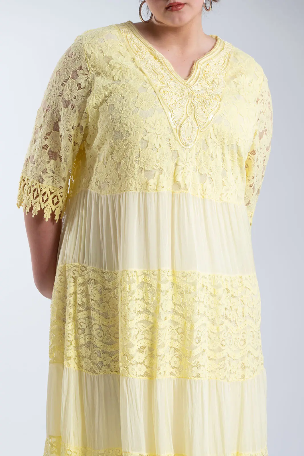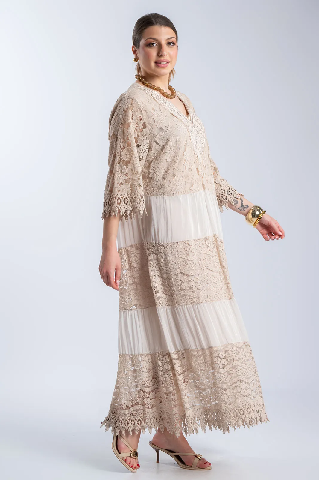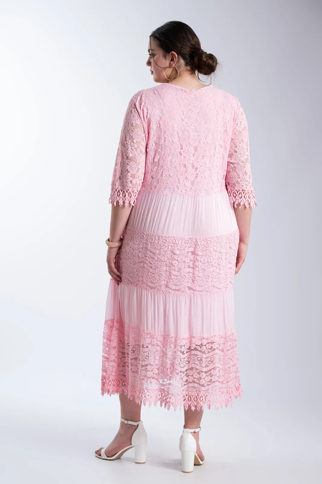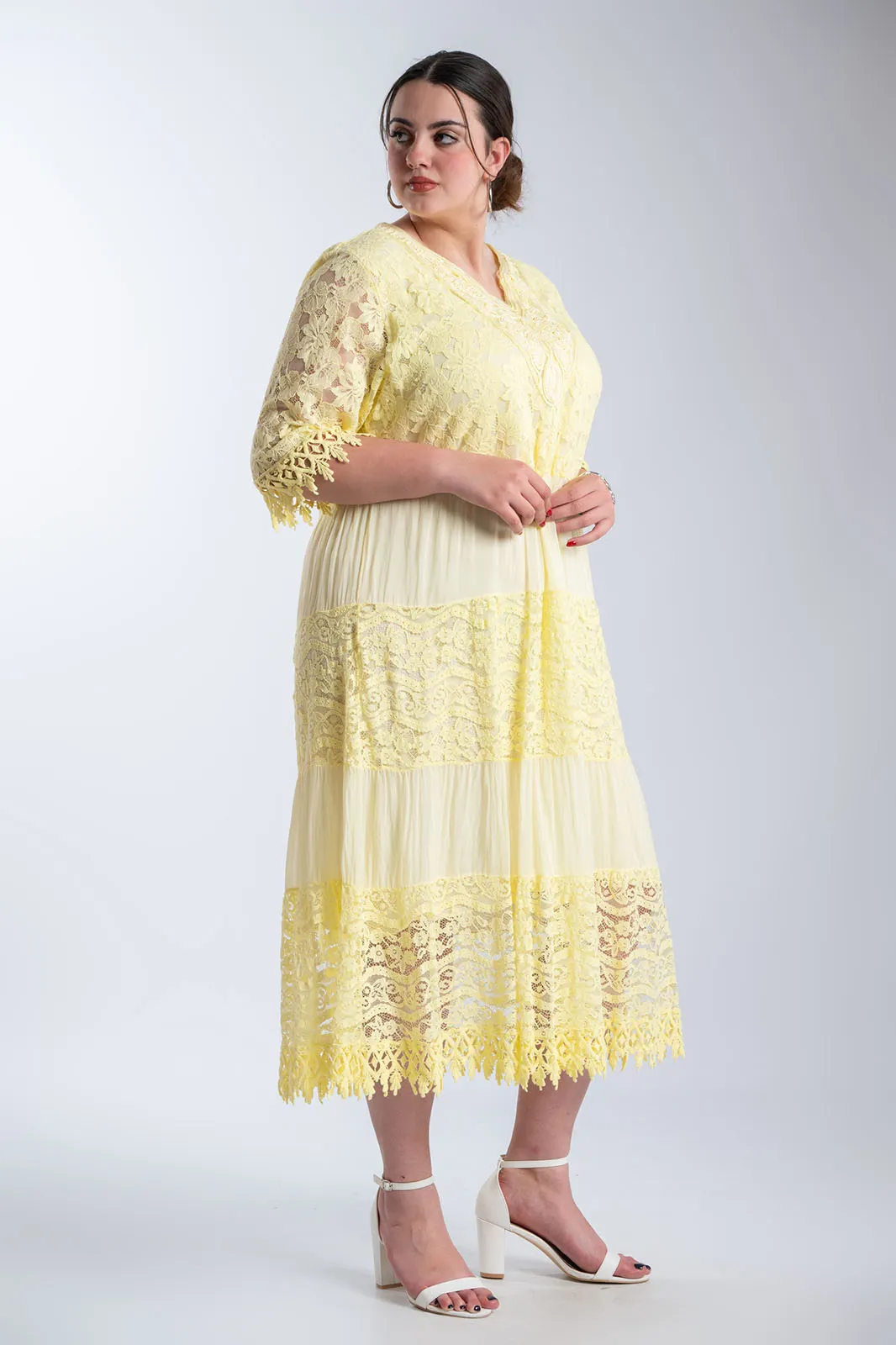 Αέρινο midi φόρεμα με δαντελένια υφή που αποπνέει ρομαντισμό και κομψότητα. Το επάνω μέρος διακοσμείται με εντυπωσιακό κέντημα στο ντεκολτέ, προσθέτοντας ιδιαίτερο χαρακτήρα και λεπτομέρεια στο σύνολο. Τα 3/4 μανίκια και το επάνω μέρος είναι από δαντέλα, ενώ η φούστα δημιουργεί ένα όμορφο layering effect με συνδυασμό διαφάνειας και υφής. Διαθέτει εσωτερική φόδρα για άνεση και σωστή εφαρμογή, ενώ η χαλαρή γραμμή του το καθιστά ιδανικό για κομψές αλλά και πιο casual εμφανίσεις.