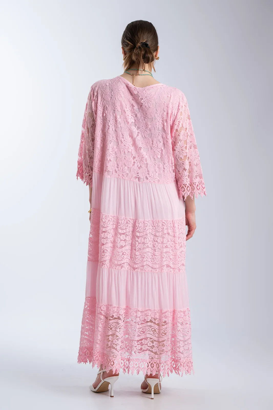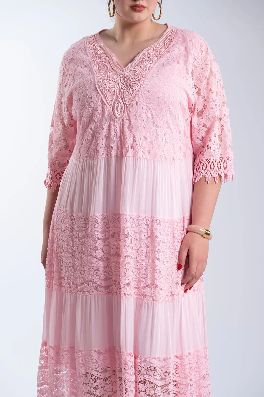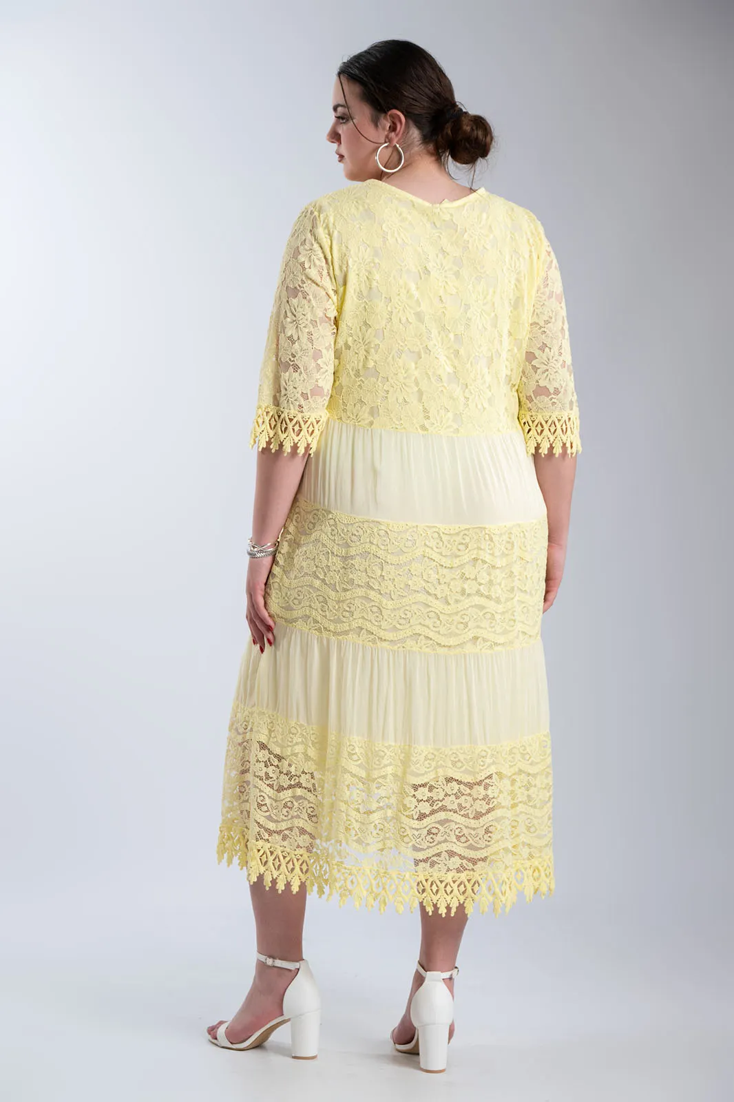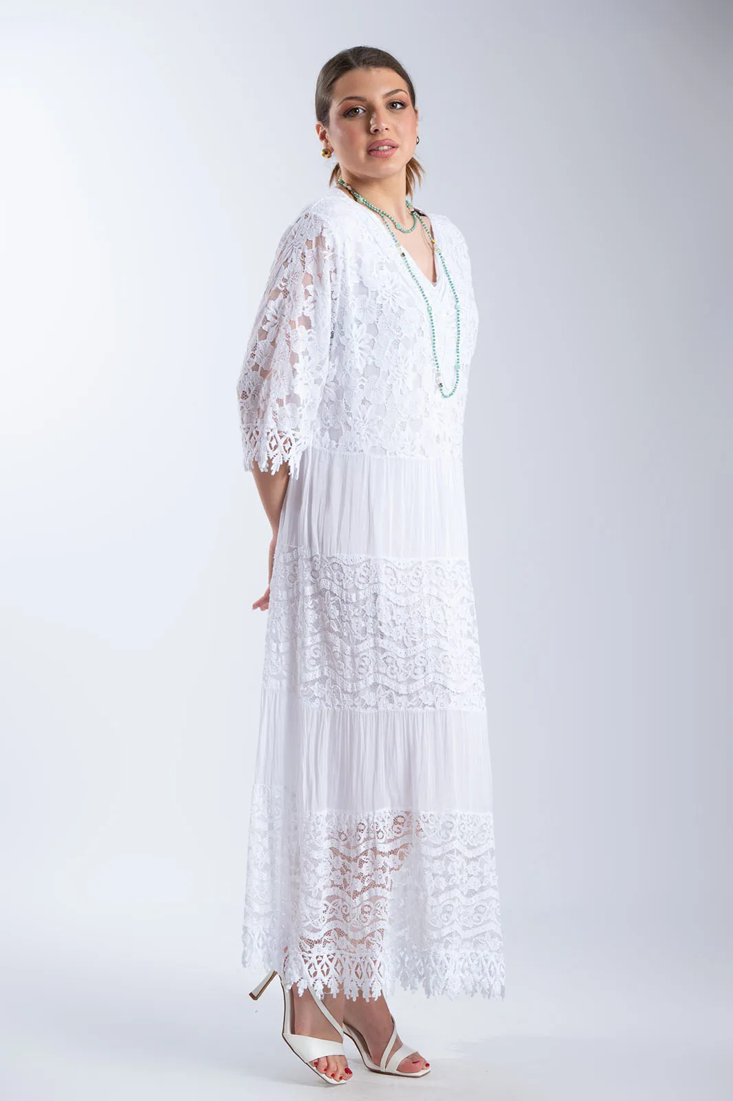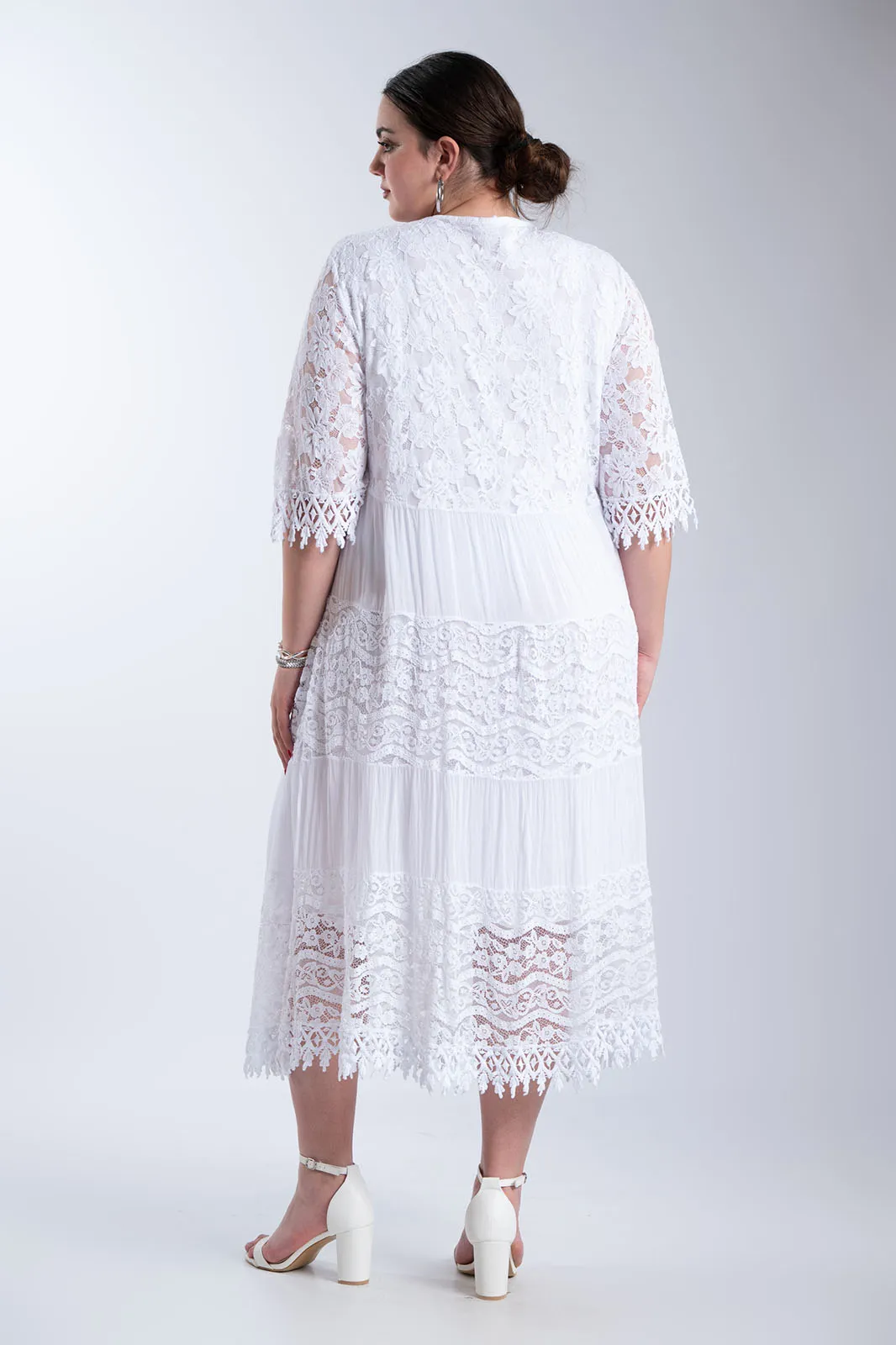 Αέρινο midi φόρεμα με δαντελένια υφή που αποπνέει ρομαντισμό και κομψότητα. Το επάνω μέρος διακοσμείται με εντυπωσιακό κέντημα στο ντεκολτέ, προσθέτοντας ιδιαίτερο χαρακτήρα και λεπτομέρεια στο σύνολο. Τα 3/4 μανίκια και το επάνω μέρος είναι από δαντέλα, ενώ η φούστα δημιουργεί ένα όμορφο layering effect με συνδυασμό διαφάνειας και υφής. Διαθέτει εσωτερική φόδρα για άνεση και σωστή εφαρμογή, ενώ η χαλαρή γραμμή του το καθιστά ιδανικό για κομψές αλλά και πιο casual εμφανίσεις.