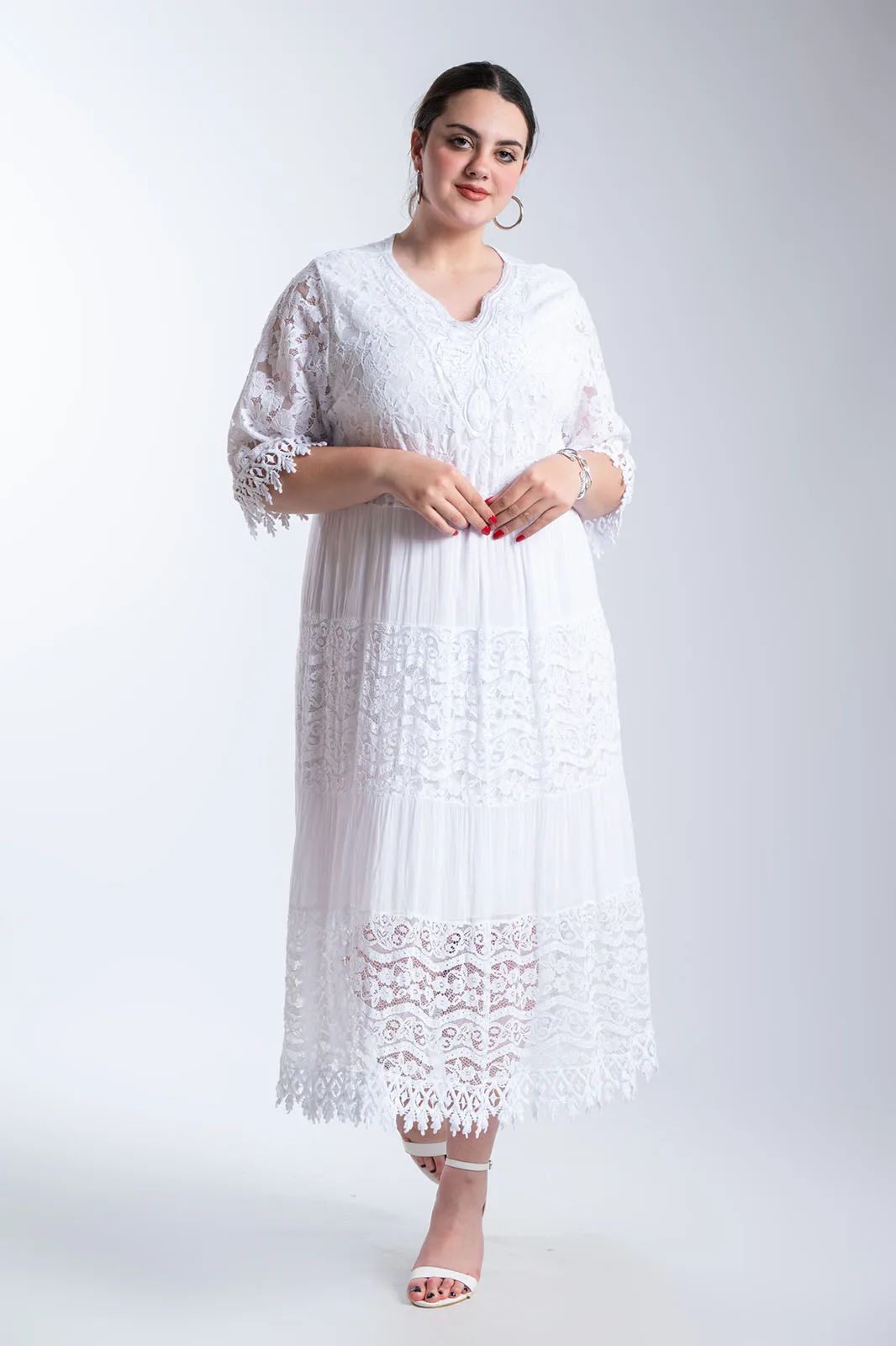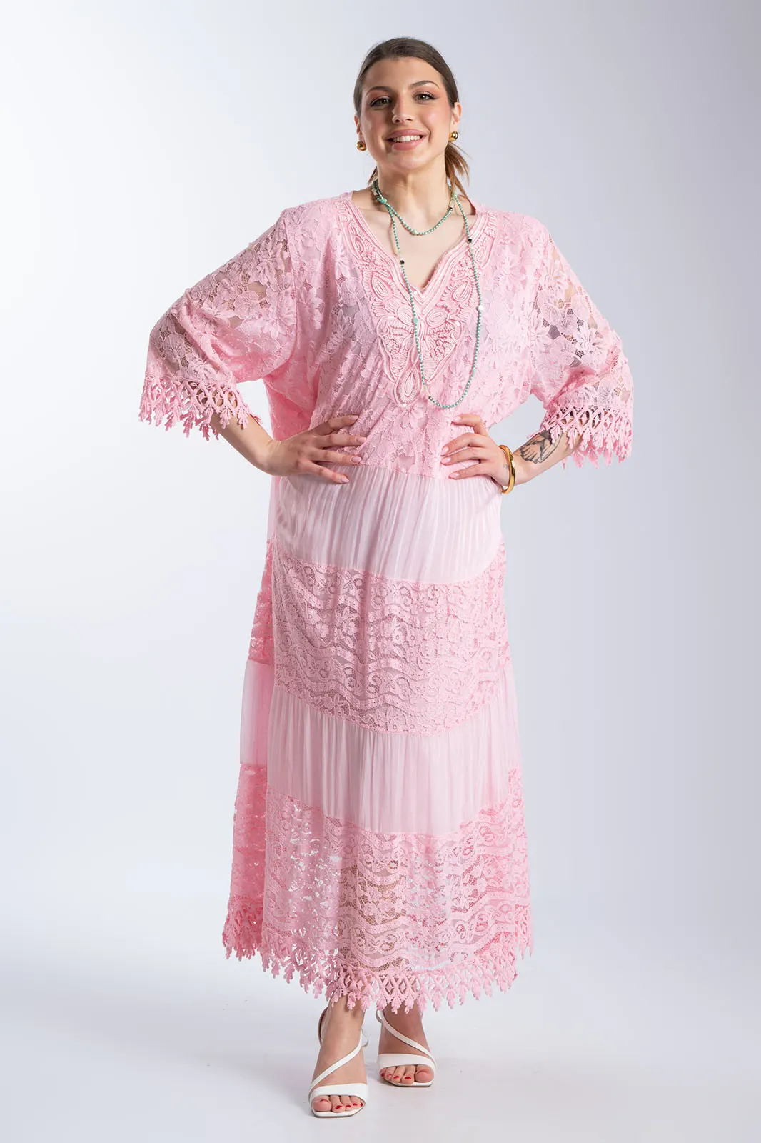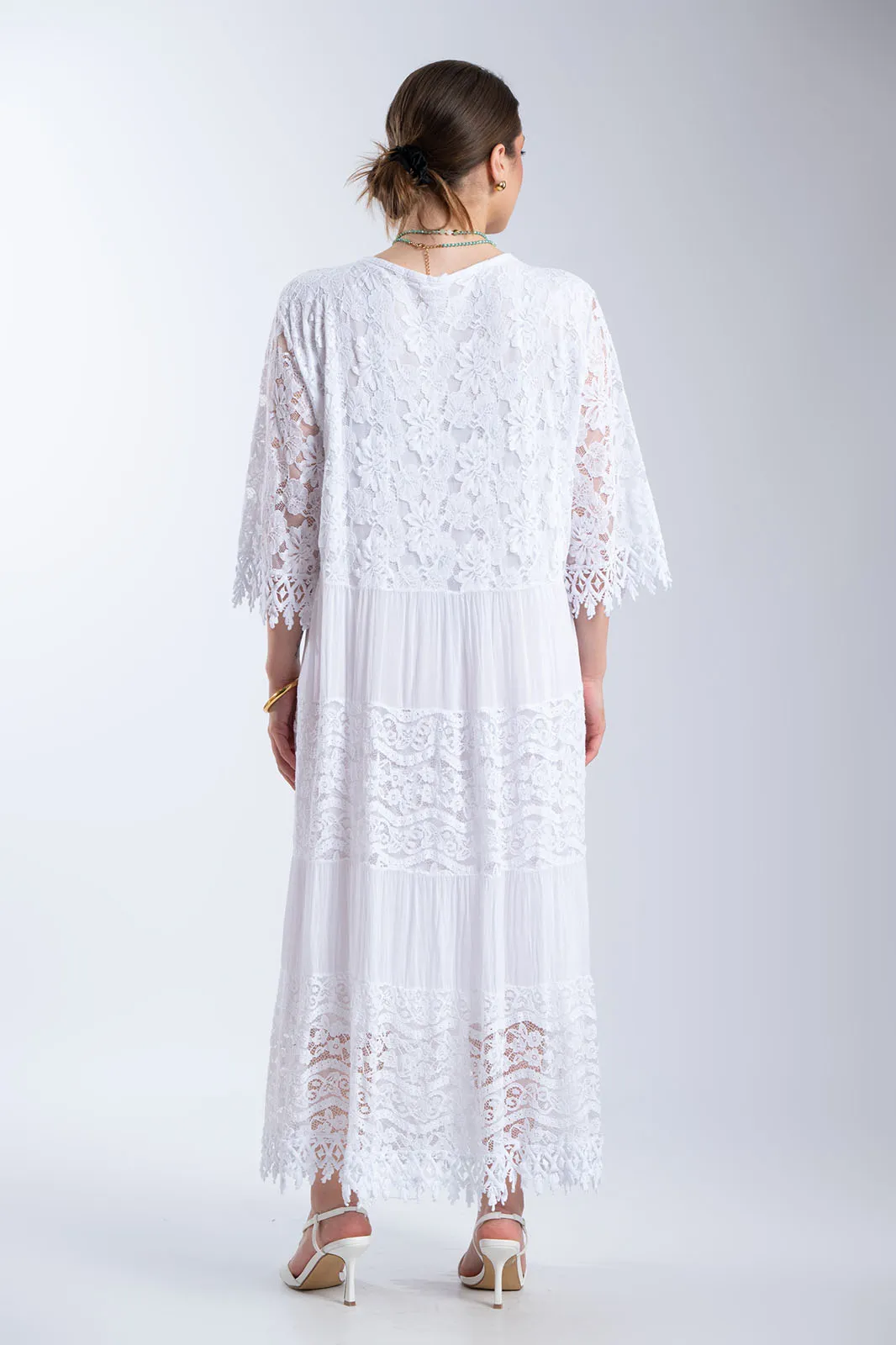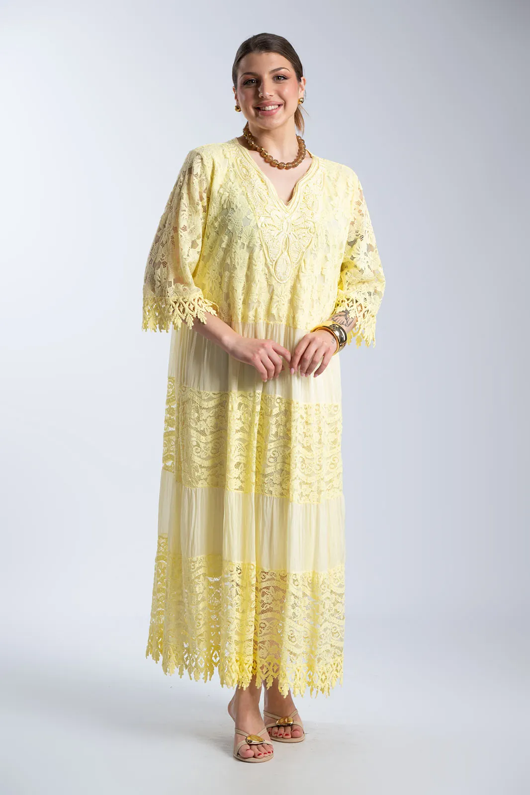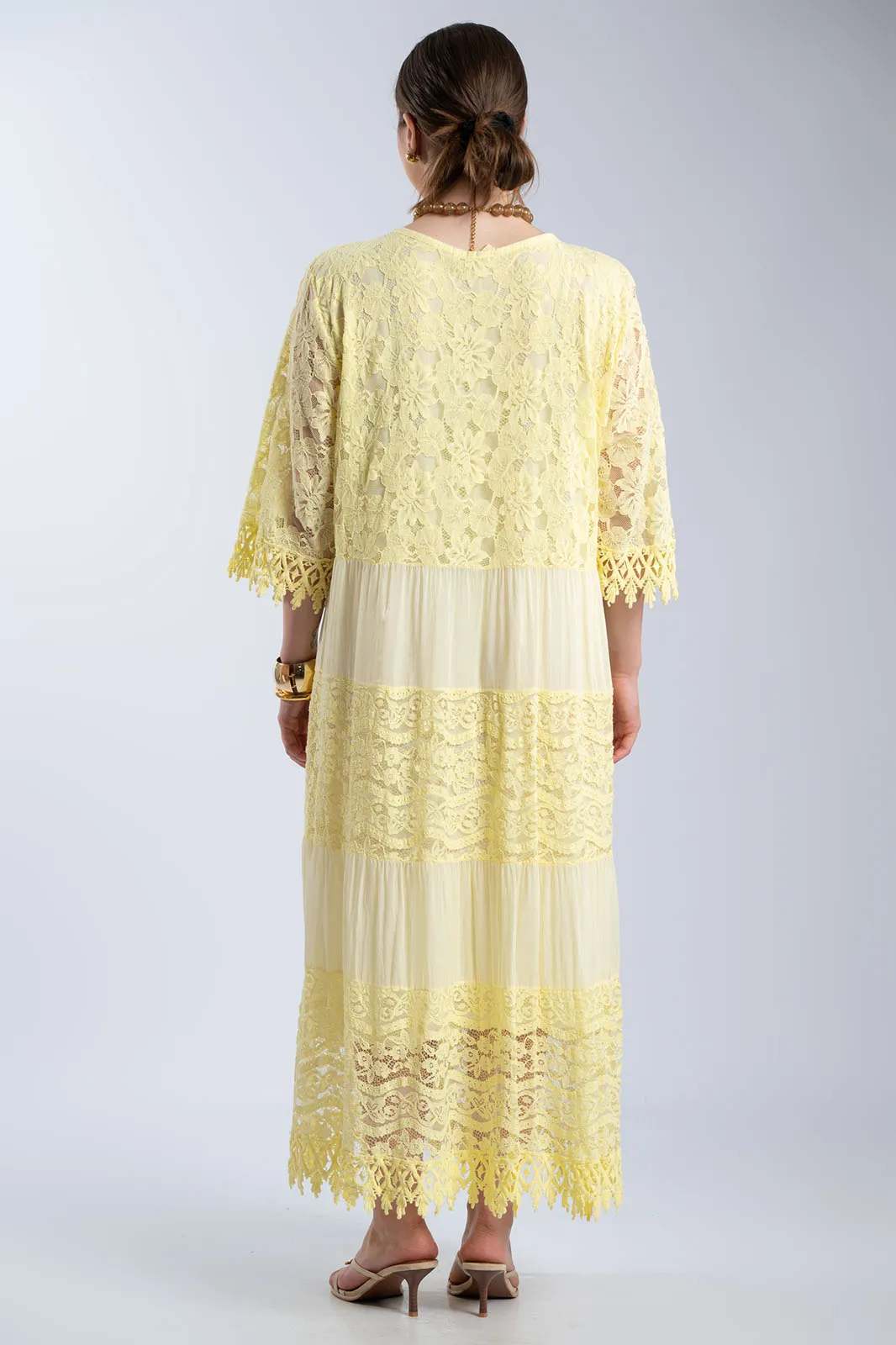 Αέρινο midi φόρεμα με δαντελένια υφή που αποπνέει ρομαντισμό και κομψότητα. Το επάνω μέρος διακοσμείται με εντυπωσιακό κέντημα στο ντεκολτέ, προσθέτοντας ιδιαίτερο χαρακτήρα και λεπτομέρεια στο σύνολο. Τα 3/4 μανίκια και το επάνω μέρος είναι από δαντέλα, ενώ η φούστα δημιουργεί ένα όμορφο layering effect με συνδυασμό διαφάνειας και υφής. Διαθέτει εσωτερική φόδρα για άνεση και σωστή εφαρμογή, ενώ η χαλαρή γραμμή του το καθιστά ιδανικό για κομψές αλλά και πιο casual εμφανίσεις.