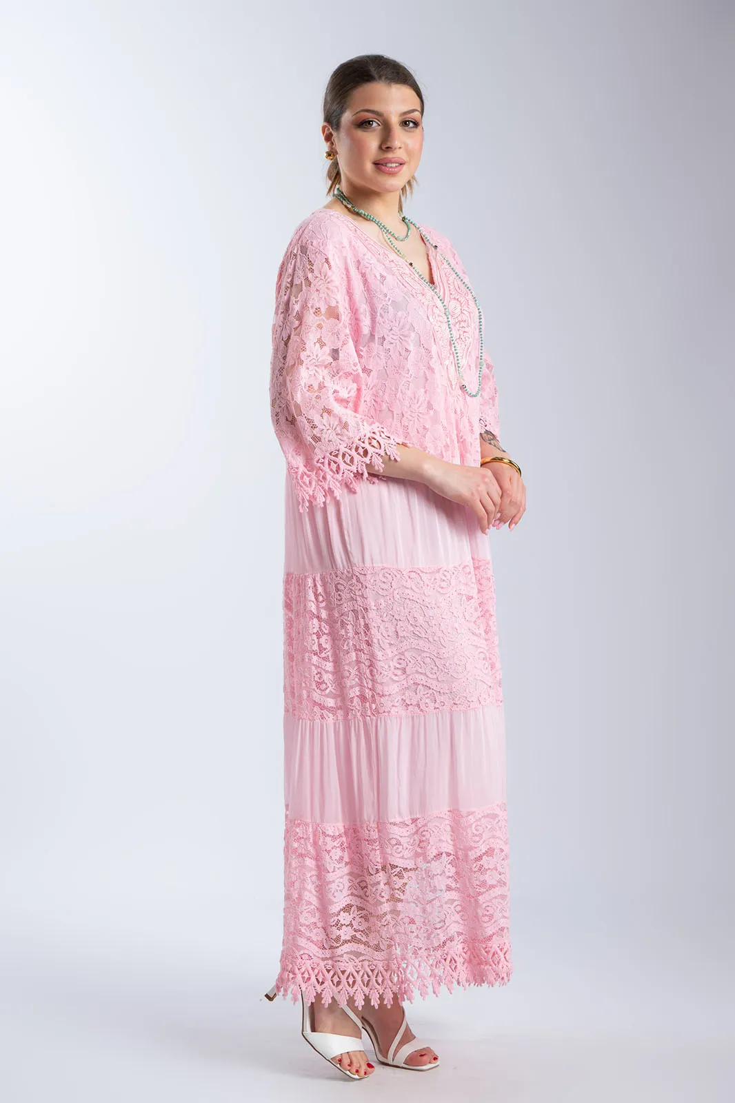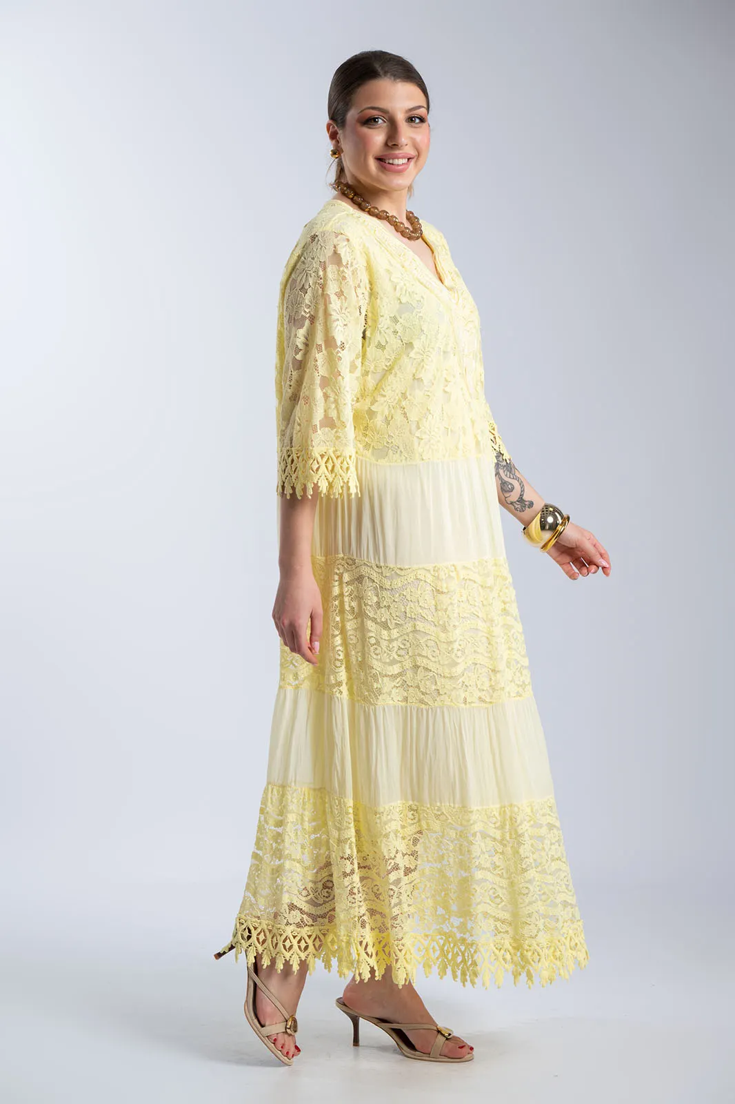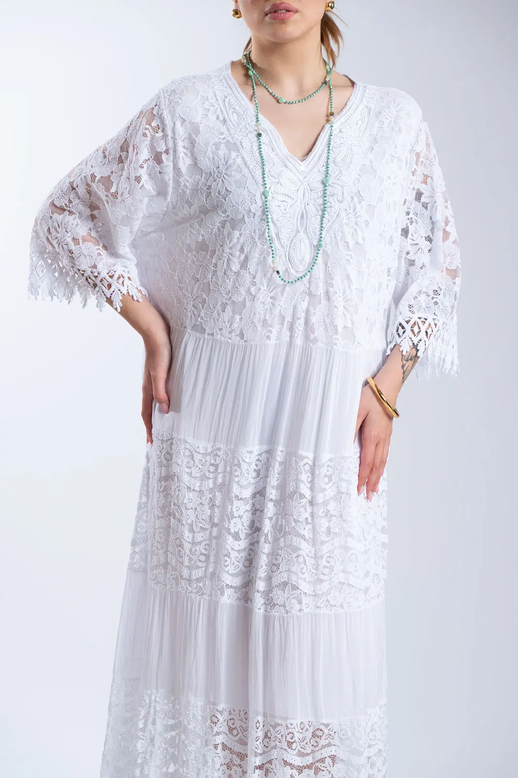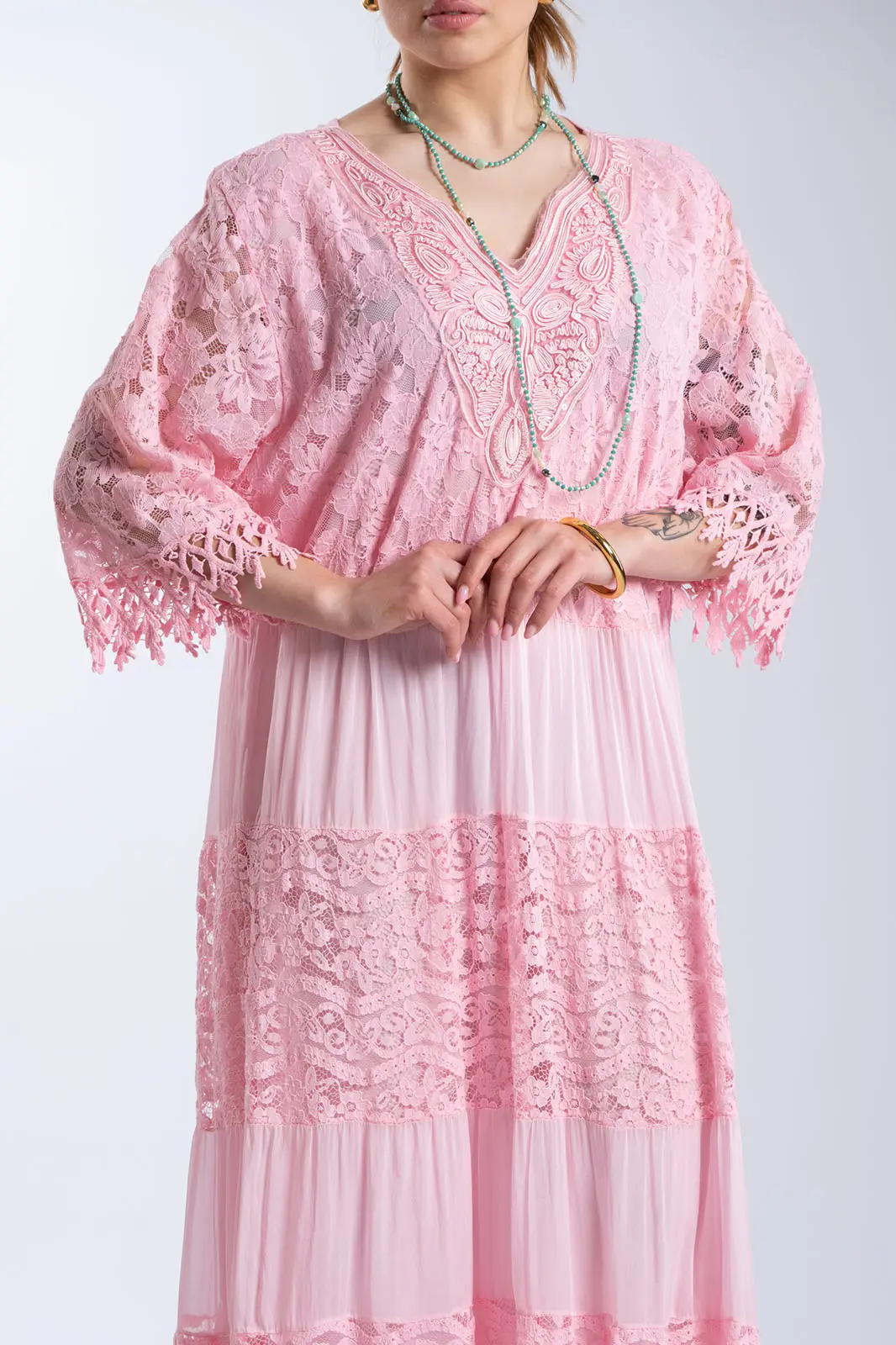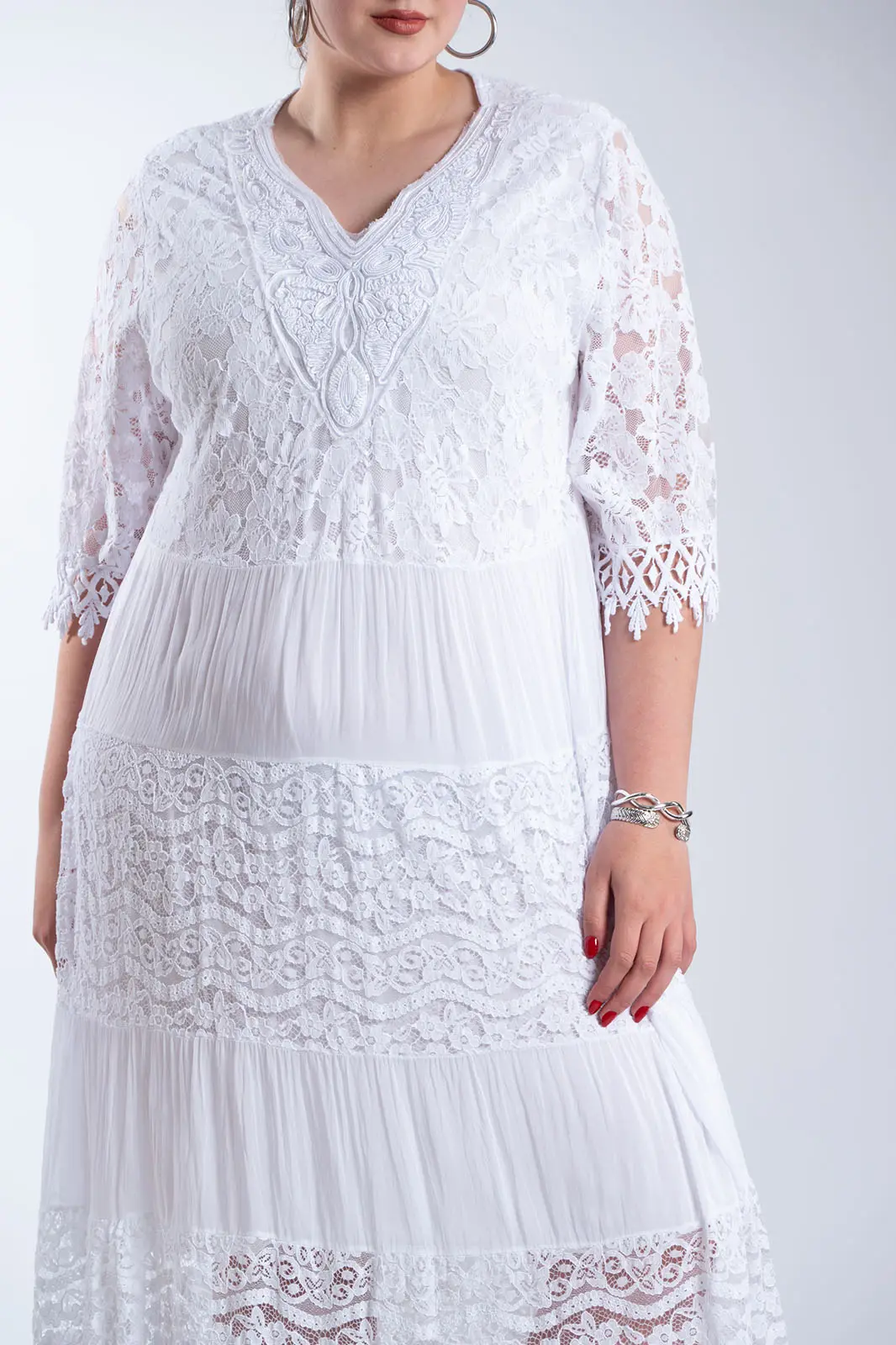 Αέρινο midi φόρεμα με δαντελένια υφή που αποπνέει ρομαντισμό και κομψότητα. Το επάνω μέρος διακοσμείται με εντυπωσιακό κέντημα στο ντεκολτέ, προσθέτοντας ιδιαίτερο χαρακτήρα και λεπτομέρεια στο σύνολο. Τα 3/4 μανίκια και το επάνω μέρος είναι από δαντέλα, ενώ η φούστα δημιουργεί ένα όμορφο layering effect με συνδυασμό διαφάνειας και υφής. Διαθέτει εσωτερική φόδρα για άνεση και σωστή εφαρμογή, ενώ η χαλαρή γραμμή του το καθιστά ιδανικό για κομψές αλλά και πιο casual εμφανίσεις.