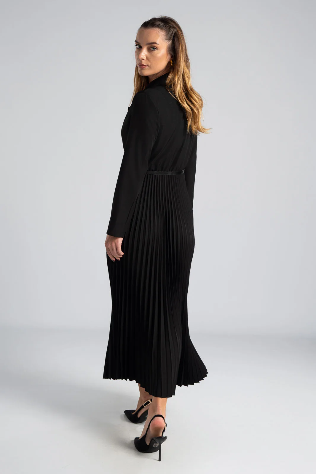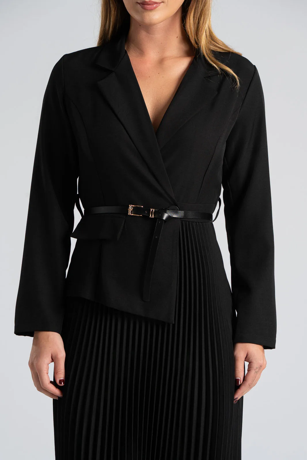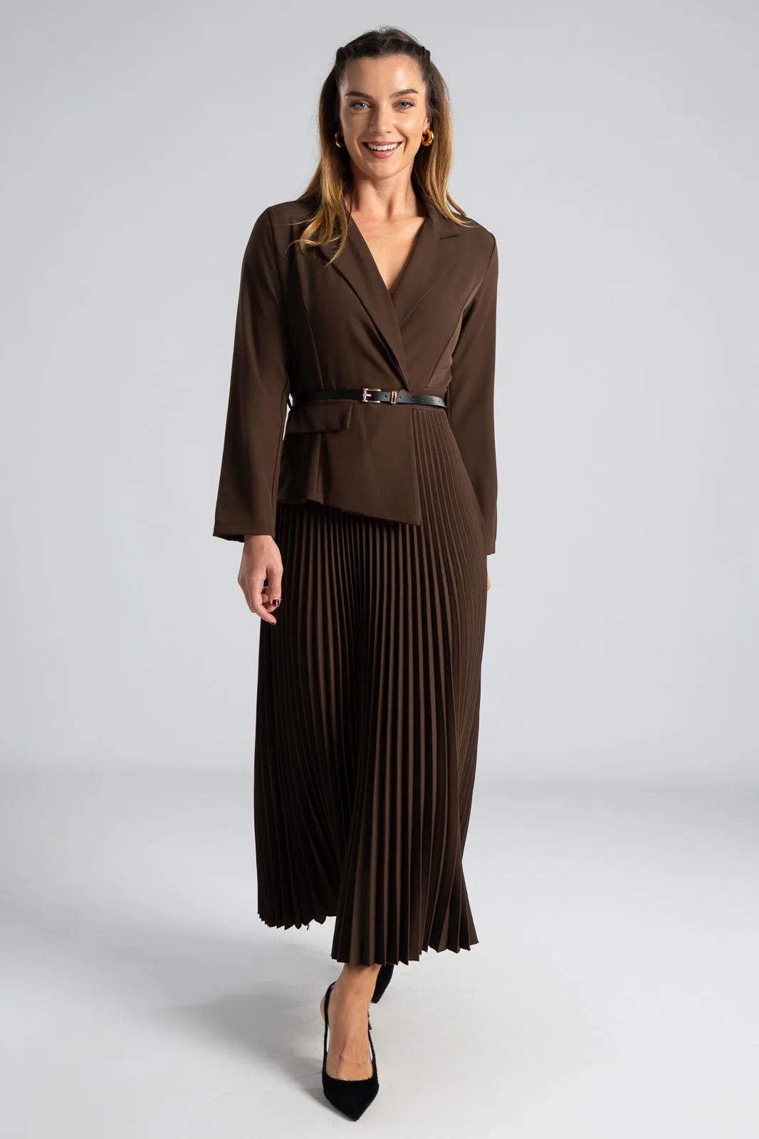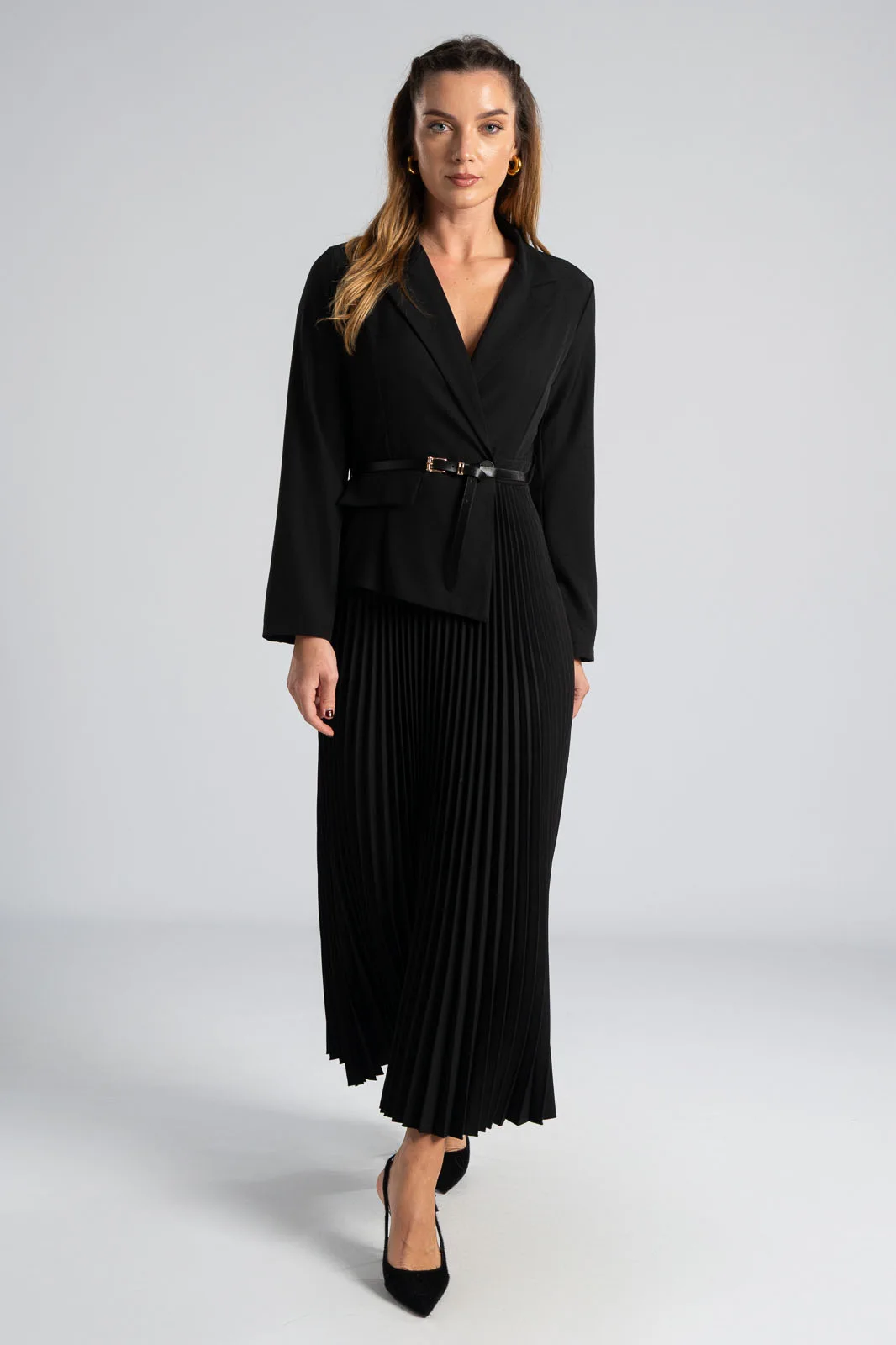 Φόρεμα maxi. Στο επάνω μέρος είναι τύπου σακάκι με κρουαζέ άνοιγμα. Έχει μακριά μανίκια. Είναι από τη μια πλευρά μακρύτερο στο μπροστινό μέρος και έχει διακοσμητική τσέπη με καπάκι. Διαθέτει δύο κουμπιά στο ύψος της μέσης. Έχει δική του ζώνη για καλύτερη εφαρμογή. Η φούστα είναι πλισέ. Οι μετρήσεις του πίνακα είναι αντιπροσωπευτικές για κάθε κωδικό. 96% polyester, 4% elastan.
