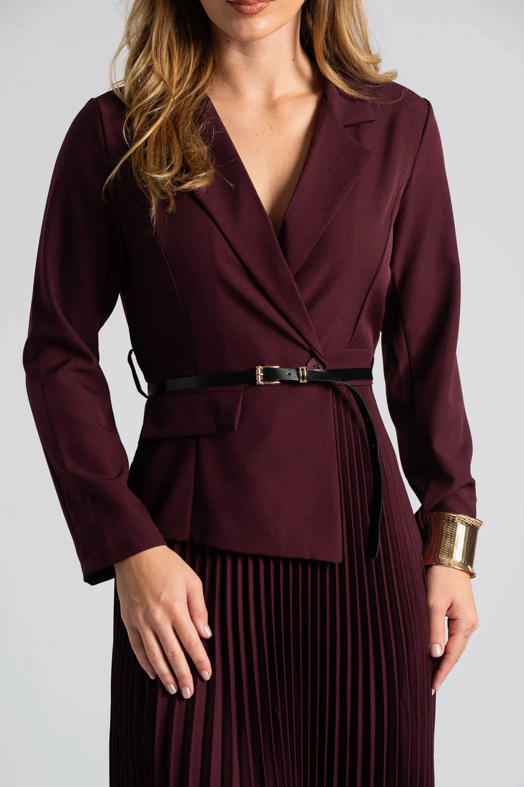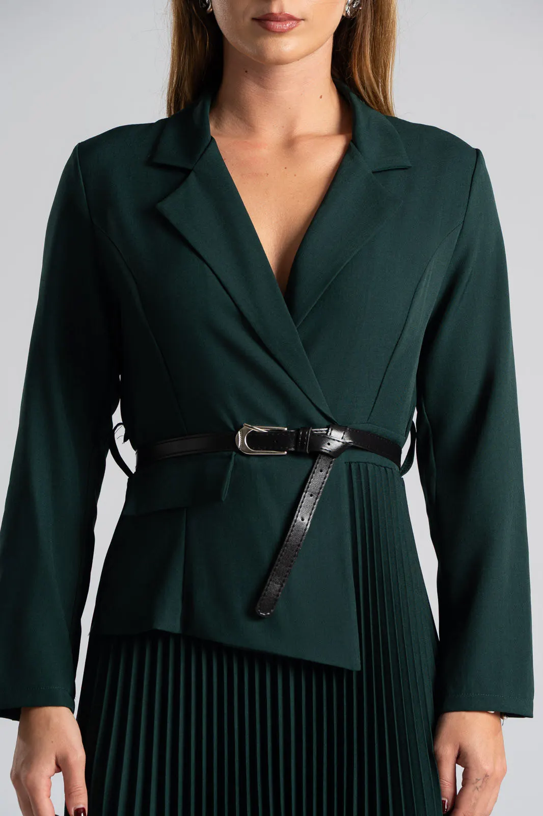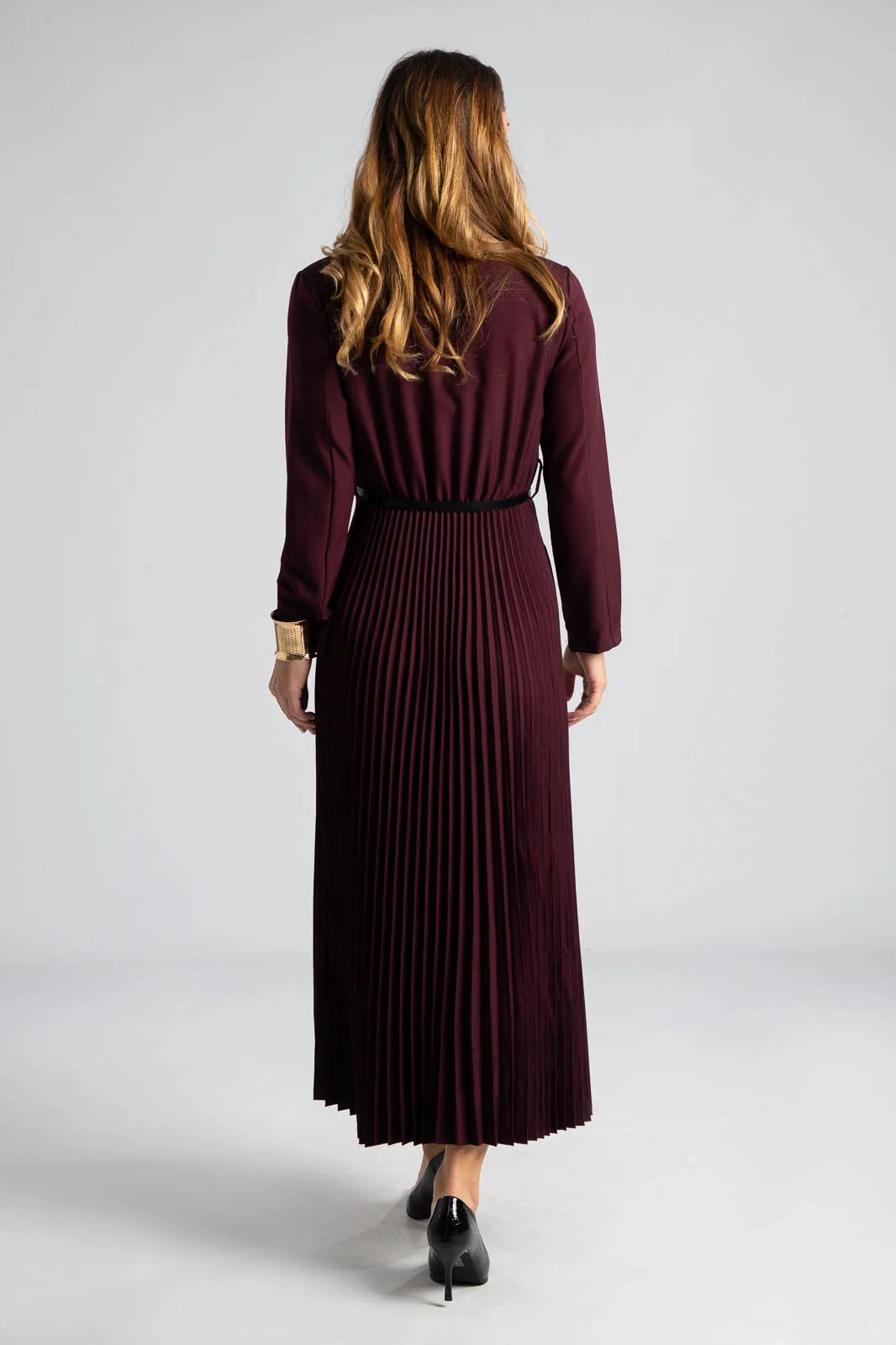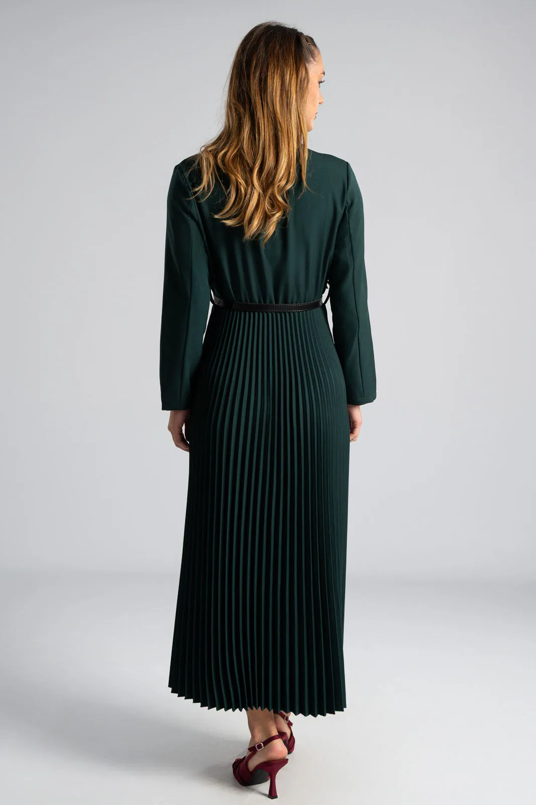 Φόρεμα maxi. Στο επάνω μέρος είναι τύπου σακάκι με κρουαζέ άνοιγμα. Έχει μακριά μανίκια. Είναι από τη μια πλευρά μακρύτερο στο μπροστινό μέρος και έχει διακοσμητική τσέπη με καπάκι. Διαθέτει δύο κουμπιά στο ύψος της μέσης. Έχει δική του ζώνη για καλύτερη εφαρμογή. Η φούστα είναι πλισέ. Οι μετρήσεις του πίνακα είναι αντιπροσωπευτικές για κάθε κωδικό. 96% polyester, 4% elastan.