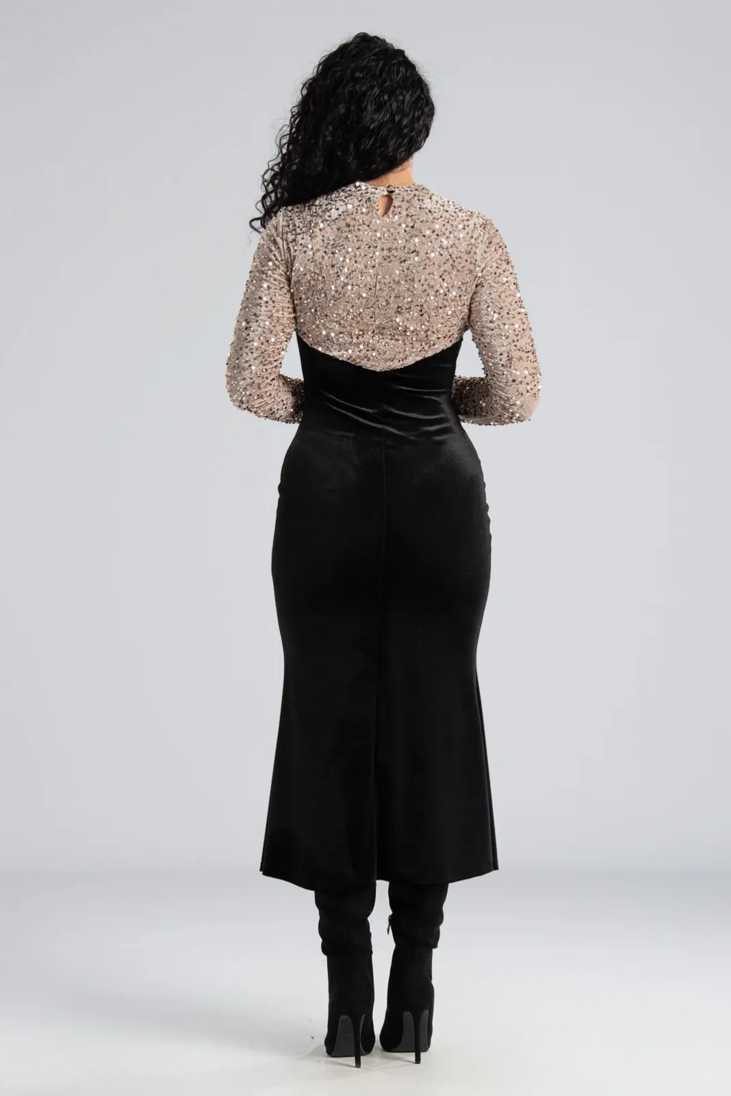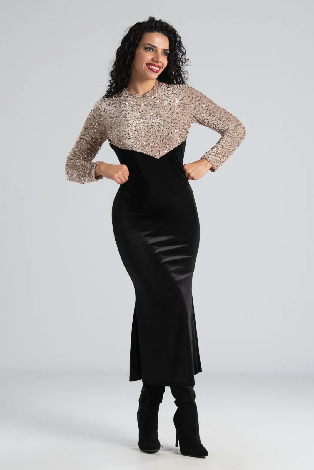 Maxi dress with a round neckline. It has long sleeves and is made of velvet. The top is decorated with sequins. It has a straight cut and flares slightly at the bottom. It is ideal for any occasion. The measurements in the table are representative for each code. 96% polyester, 4% elastane.