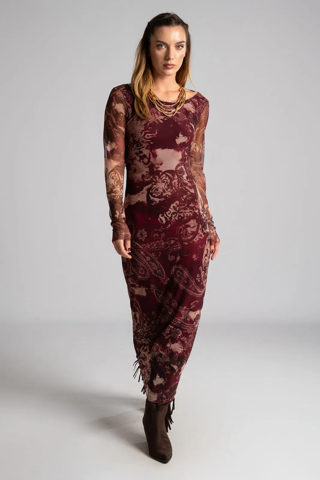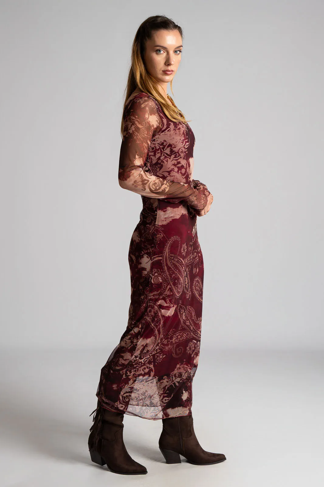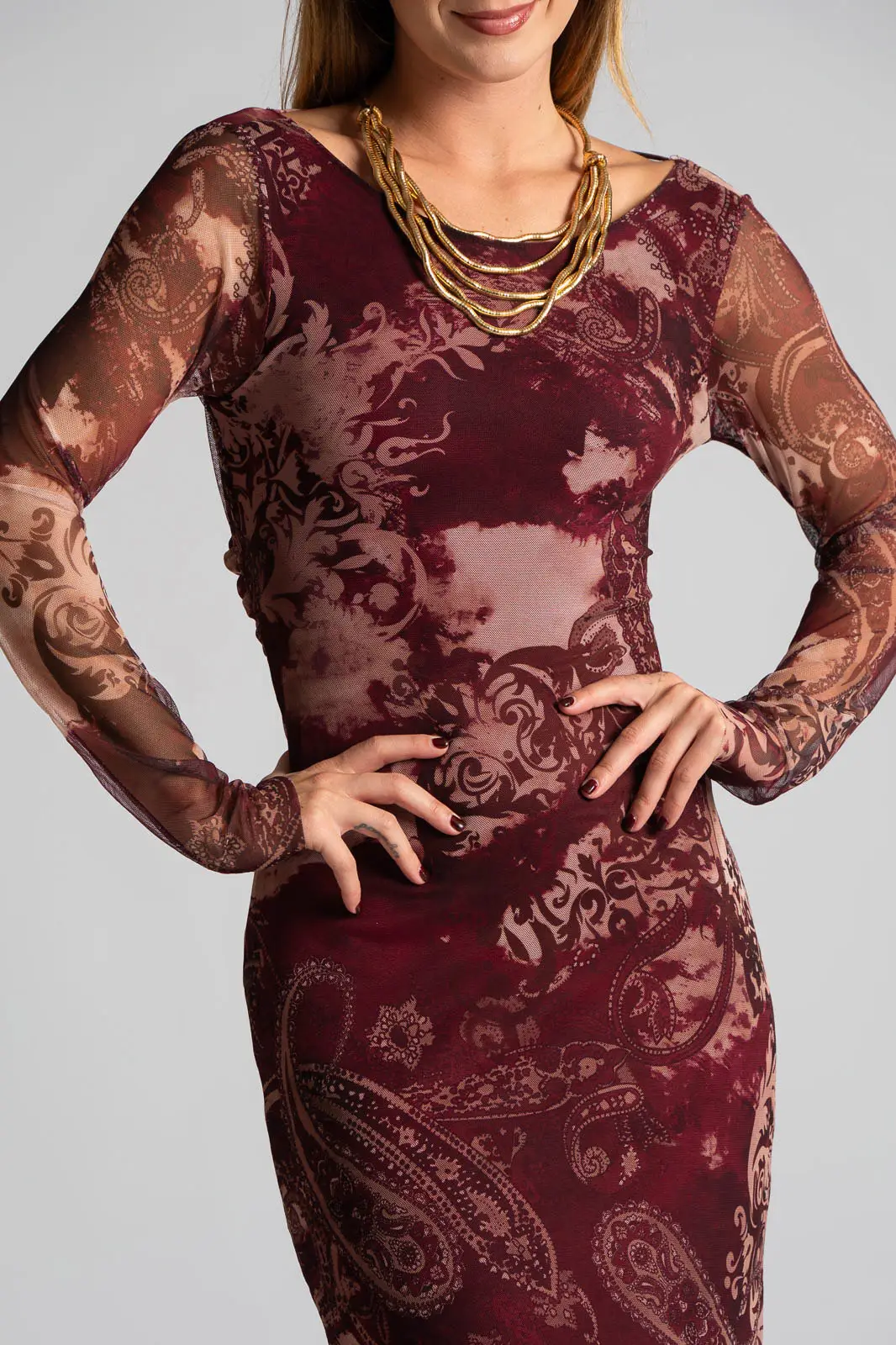 Maxi dress with paisley details all over. It is made of tulle and lined at the torso. It has a round neckline, long sleeves and a slight c-throu. It has an opening at the back. It can be worn on any occasion. The measurements in the table are representative of each product. Dress: 95% polyester, 5% elastane. Lining: 95% viscose, 5% elastane