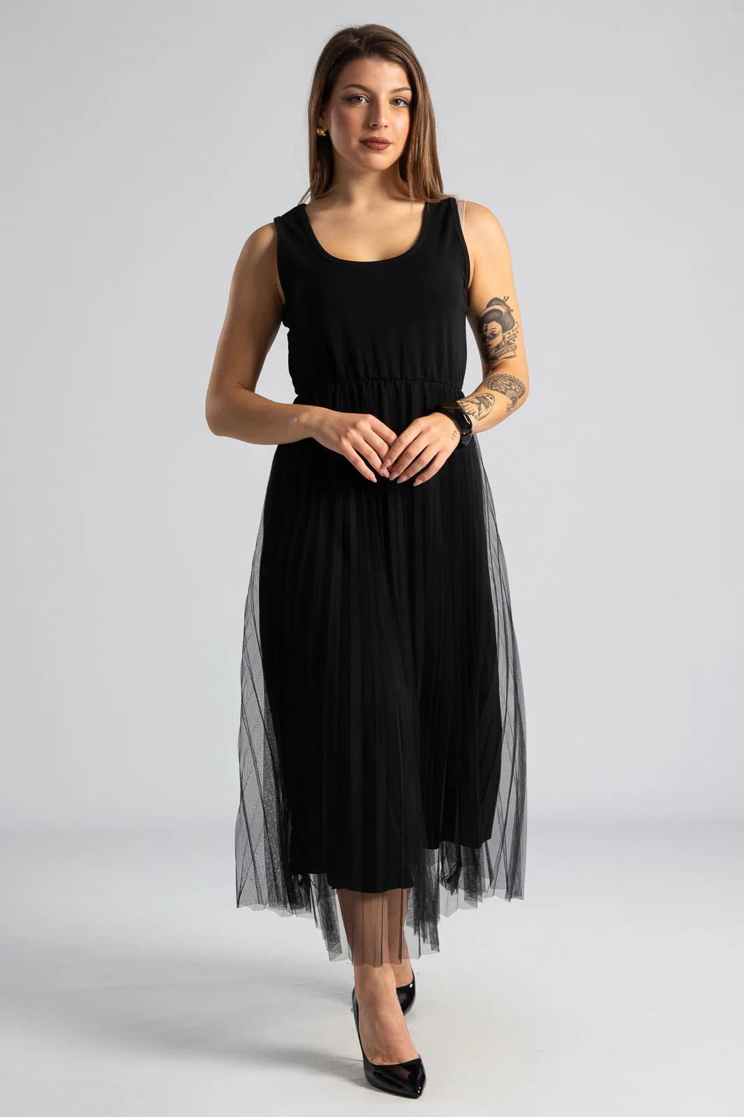 Σετ που αποτελείται από φόρεμα και μπλούζα. Το φόρεμα έχει στρογγυλή λαιμόκοψη και είναι αμάνικο. Στη μέση διαθέτει λάστιχο και η φούστα είναι τούλινη. Είναι maxi. Εσωτερικά είναι φοδραρισμένη. Η μπλούζα έχει στρογγυλή λαιμόκοψη. Σε όλη την επιφάνεια έχει διάτρητη δαντέλα. Τα μανίκια της είναι μακριά. Το πίσω μέρος είναι ελαφρώς μακρύτερο. Οι μετρήσεις του πίνακα είναι αντιπροσωπευτικές για κάθε προϊόν. 95% polyester, 5% elastan.