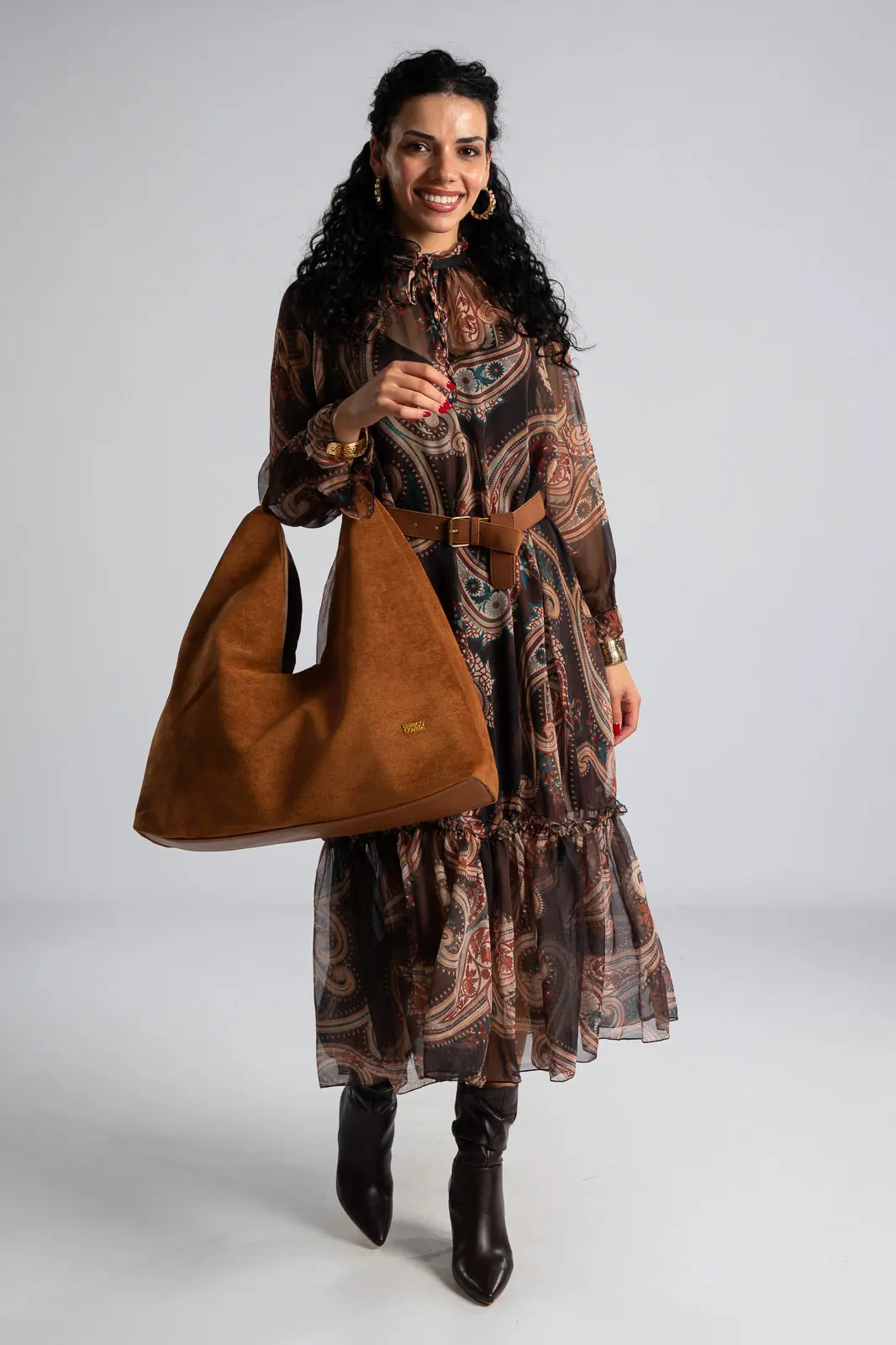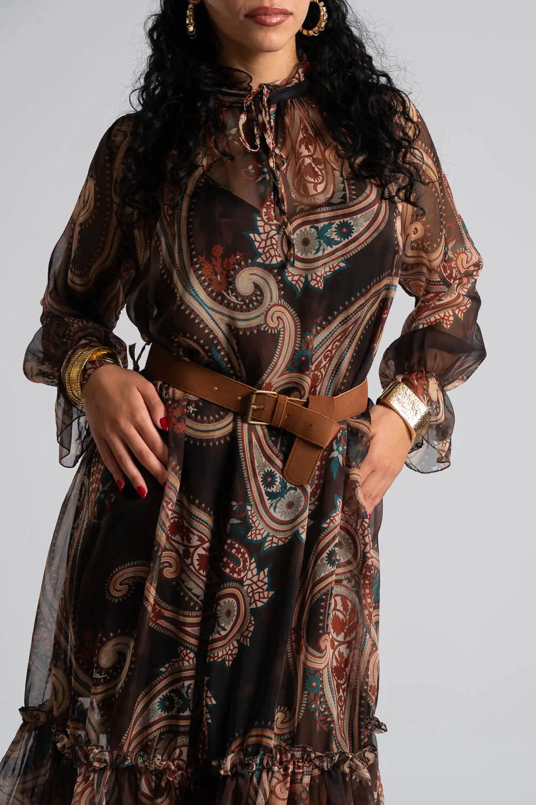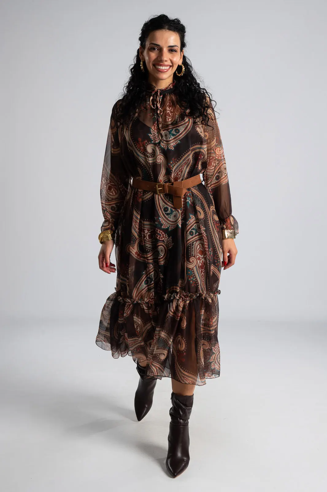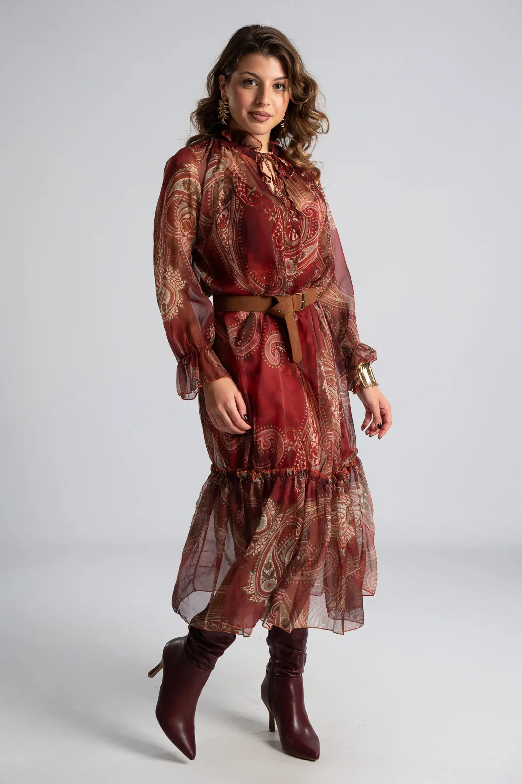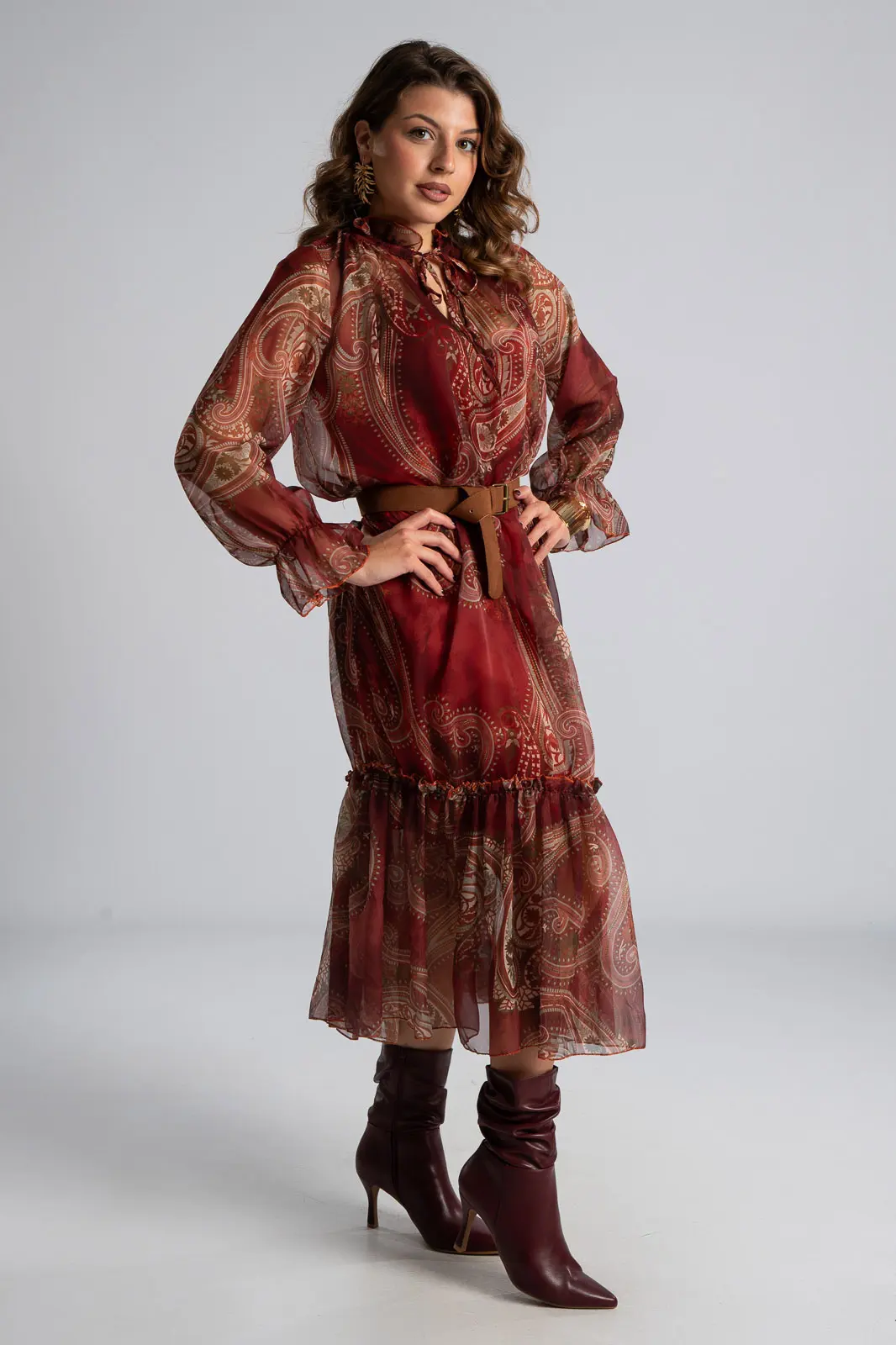 Midi dress with baroque design. It has a V-neckline and ties at the neck. It is A-line and has long sleeves. It has ruffles at the neckline, hem, and sleeves. It has a petticoat inside. The measurements in the table are representative of each product. 100% polyester.