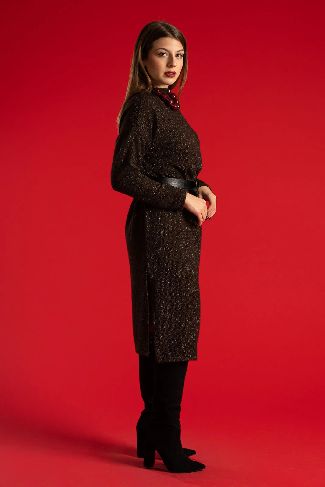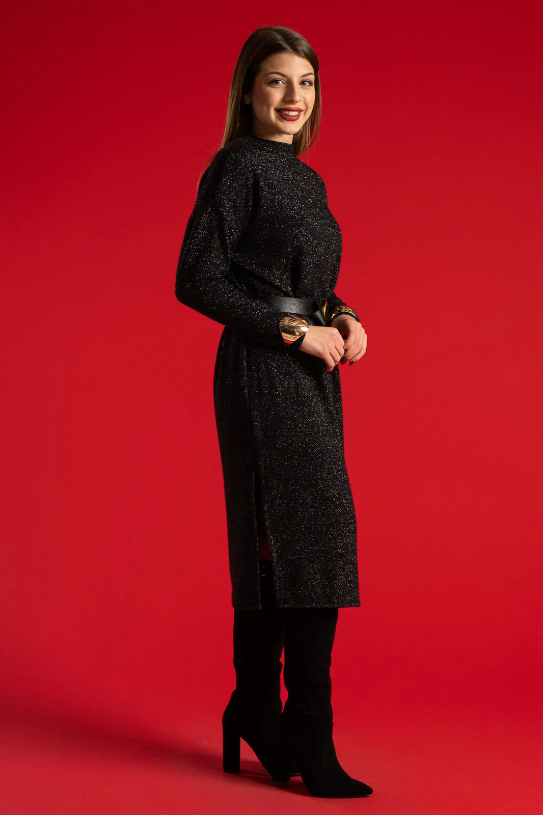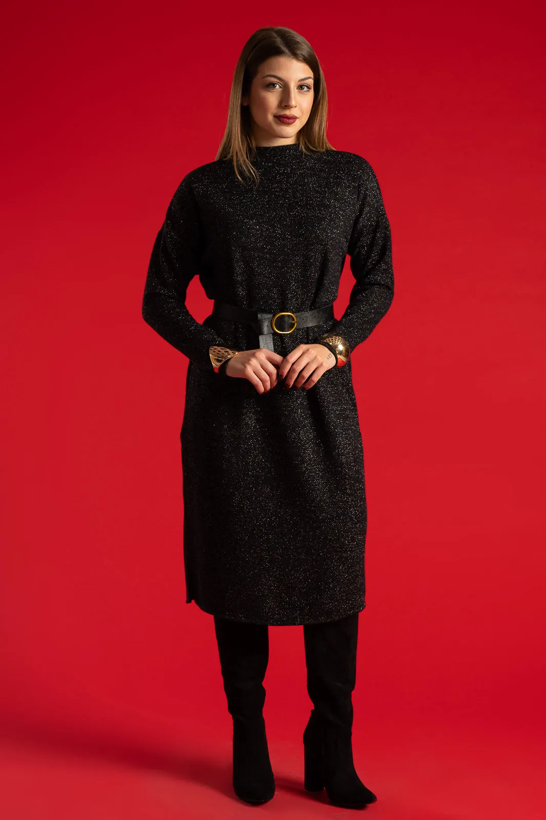 Φόρεμα midi lurex που προσδίδει μια διακριτική λάμψη. Είναι νημάτινο και έχει lupeto λαιμόκοψη. Τα μανίκια του είναι μακριά. Διαθέτει δική του ζώνη σε μαύρο χρώμα με μεταλλική λεπτομέρεια. Στα πλαϊνά διαθέτει άνοιγμα. Οι μετρήσεις του πίνακα είναι αντιπροσωπευτικές για κάθε προϊόν. 42% viscose, 50% polyester, 4% metallica, 4% elastan.