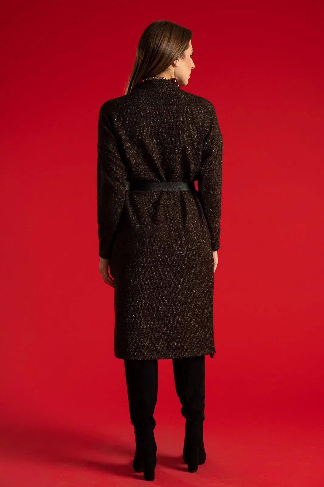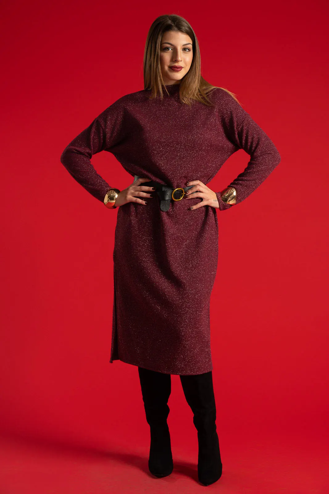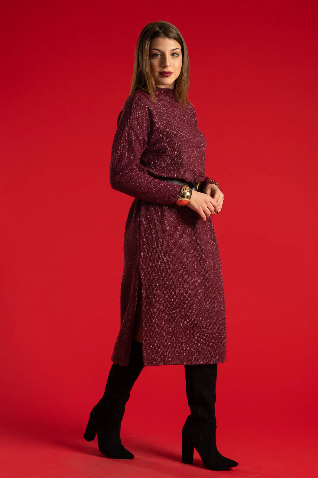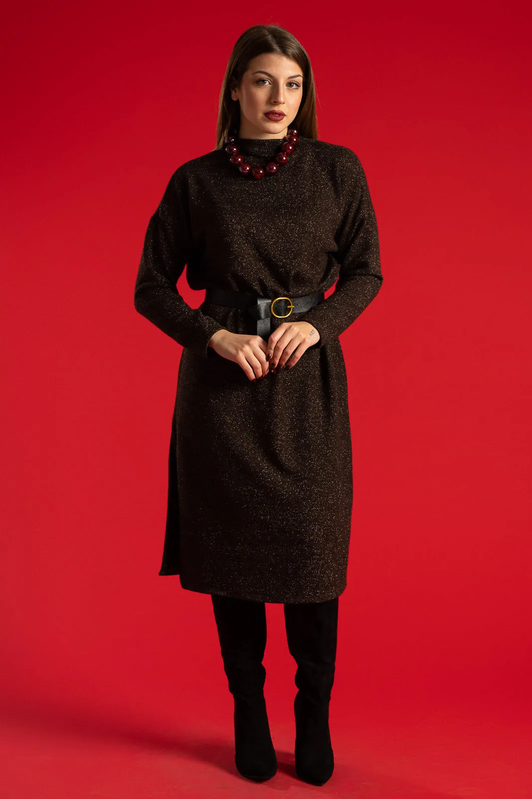 Φόρεμα midi lurex που προσδίδει μια διακριτική λάμψη. Είναι νημάτινο και έχει lupeto λαιμόκοψη. Τα μανίκια του είναι μακριά. Διαθέτει δική του ζώνη σε μαύρο χρώμα με μεταλλική λεπτομέρεια. Στα πλαϊνά διαθέτει άνοιγμα. Οι μετρήσεις του πίνακα είναι αντιπροσωπευτικές για κάθε προϊόν. 42% viscose, 50% polyester, 4% metallica, 4% elastan.