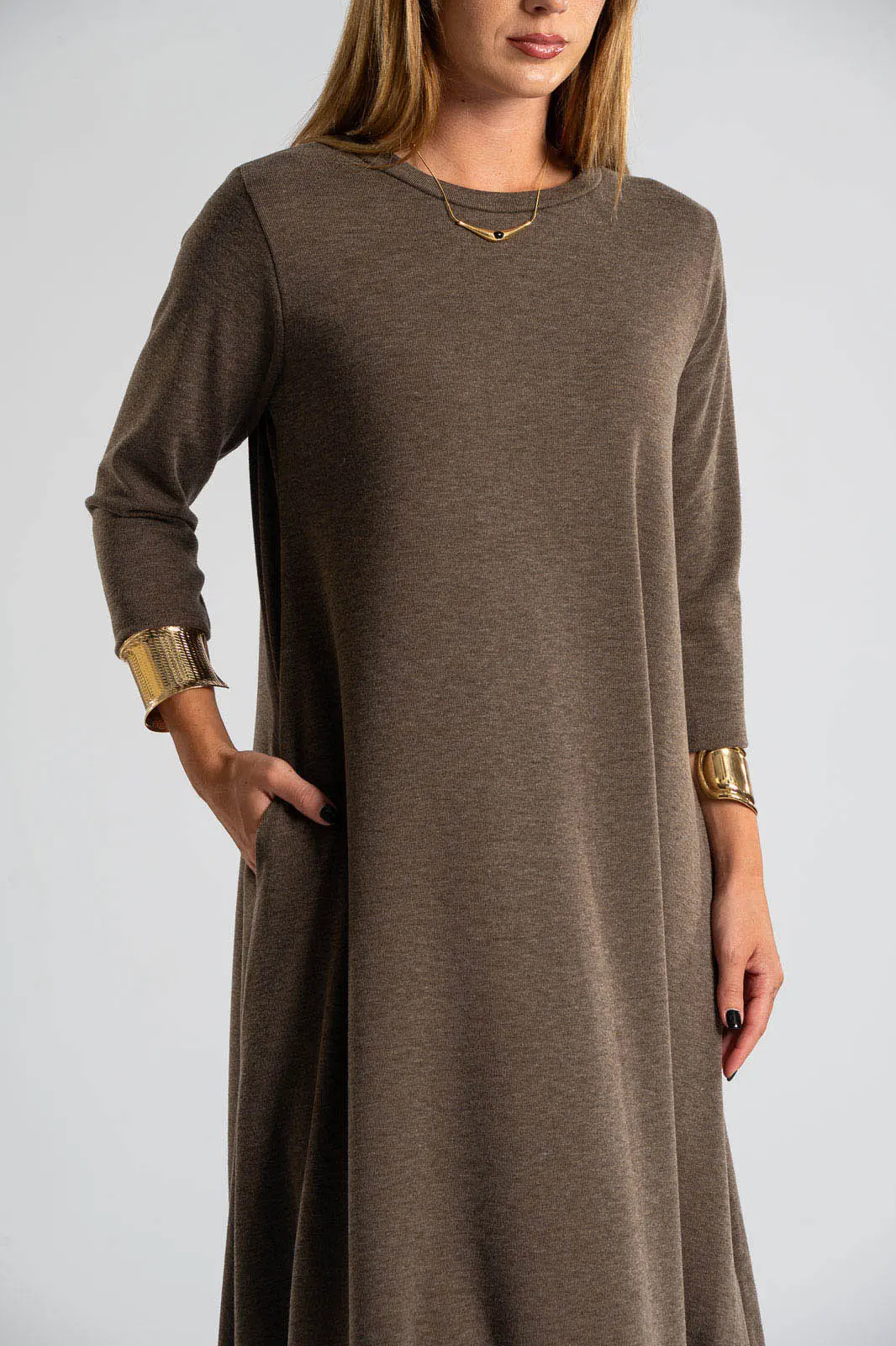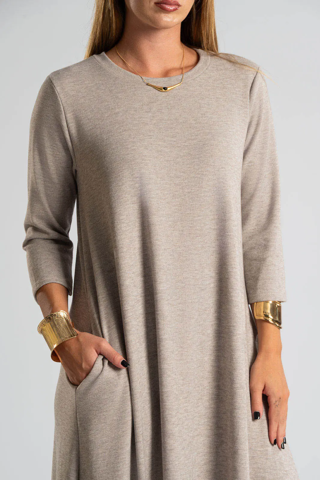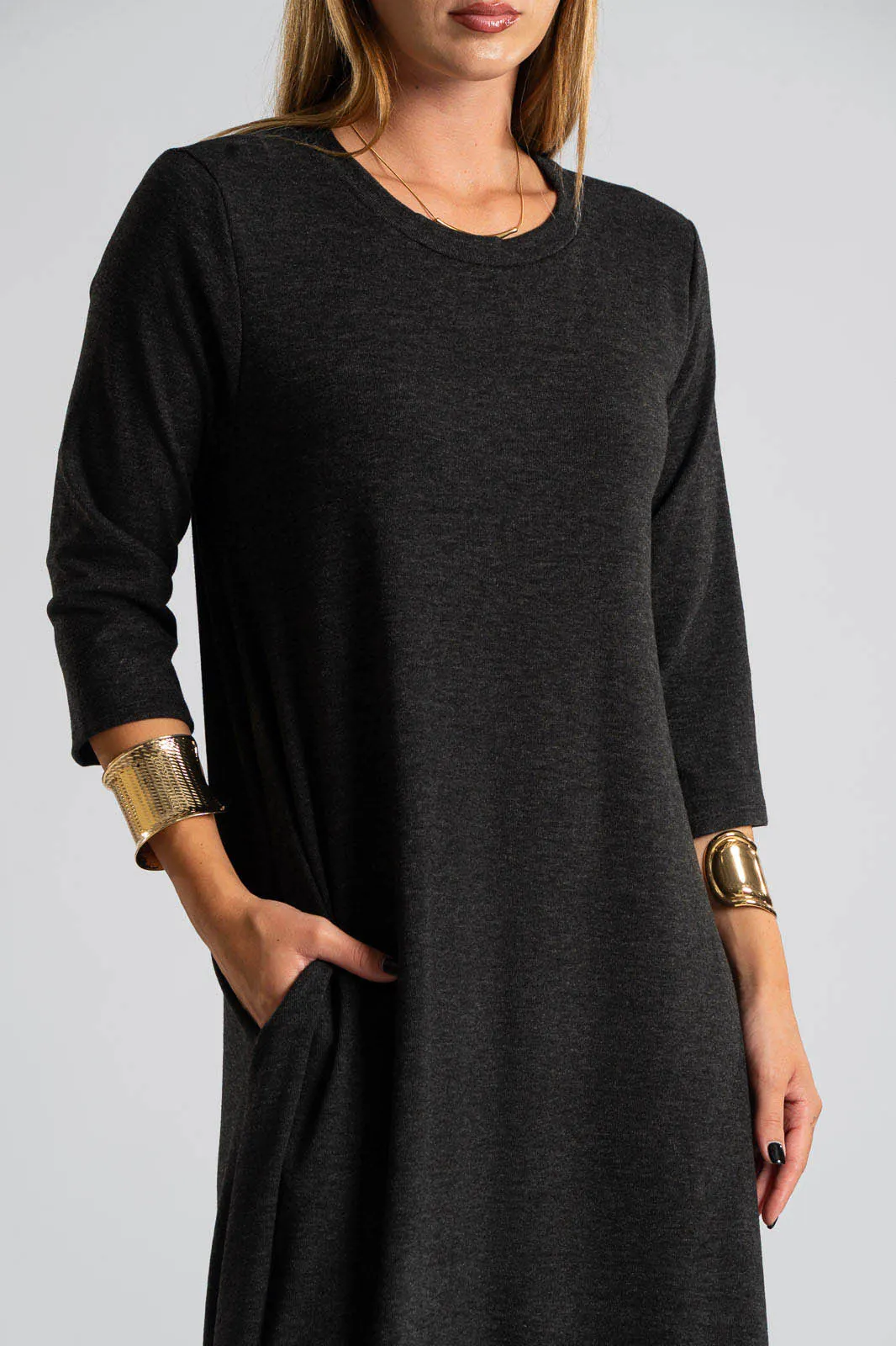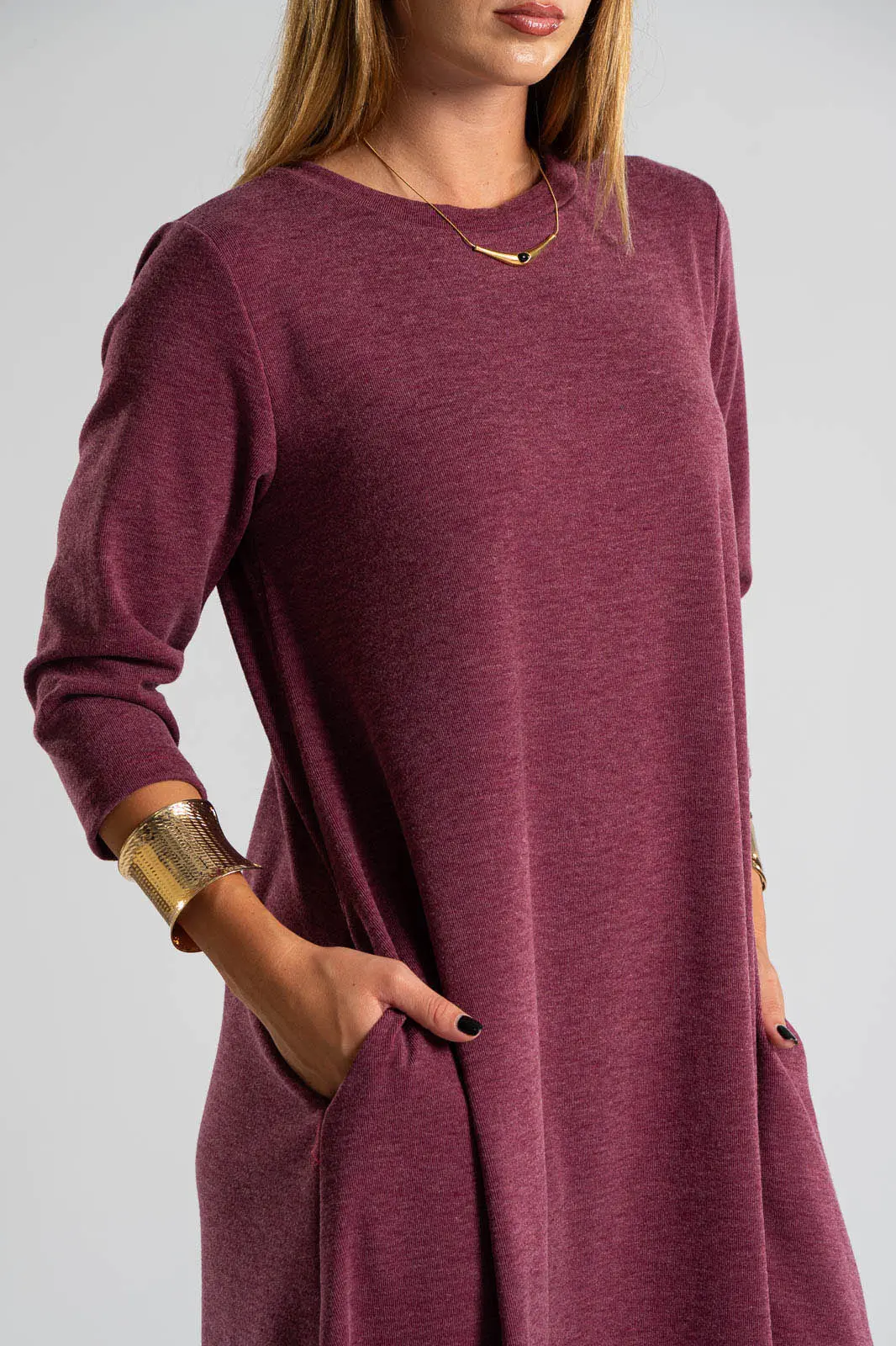 Φόρεμα με στρογγυλή λαιμόκοψη. Τα μανίκια είναι 3/4 και είναι σε Α γραμμή. Στα πλαινά διαθέτει τσέπες. Το ύφασμα του είναι πολύ μαλακό. Οι μετρήσεις του πίνακα είναι αντιπροσωπευτικές για κάθε κωδικό. 69% polyester, 28%viscose, 3% elastan.