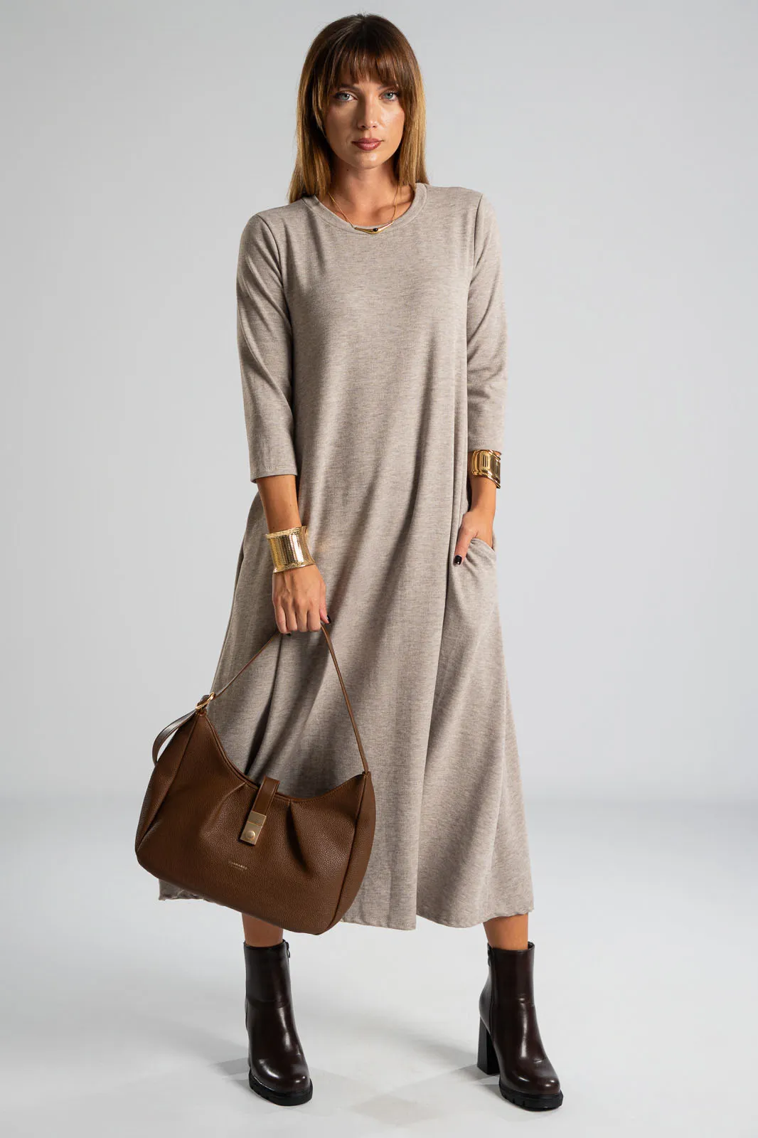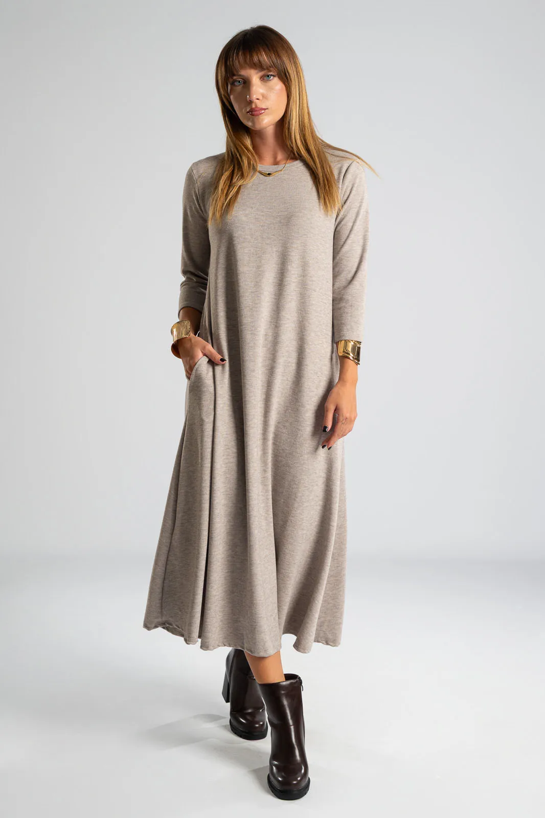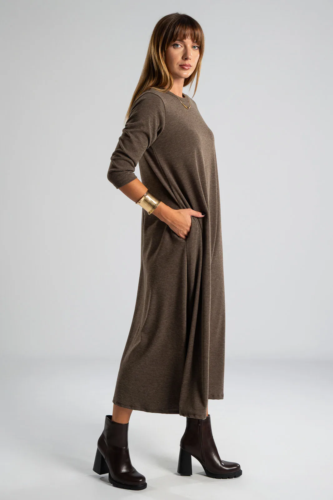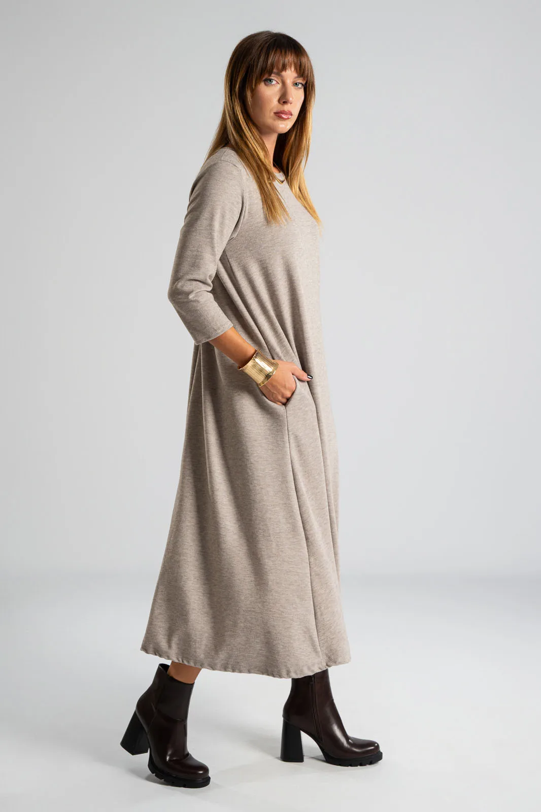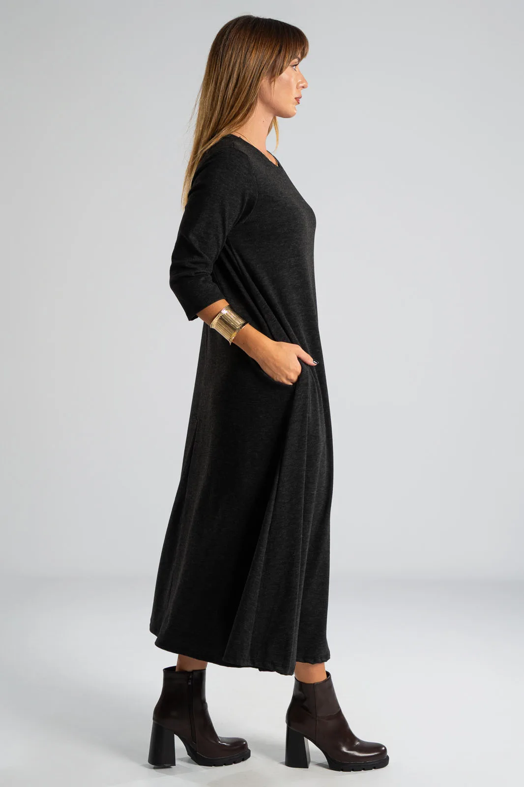 Φόρεμα με στρογγυλή λαιμόκοψη. Τα μανίκια είναι 3/4 και είναι σε Α γραμμή. Στα πλαινά διαθέτει τσέπες. Το ύφασμα του είναι πολύ μαλακό. Οι μετρήσεις του πίνακα είναι αντιπροσωπευτικές για κάθε κωδικό. 69% polyester, 28%viscose, 3% elastan.