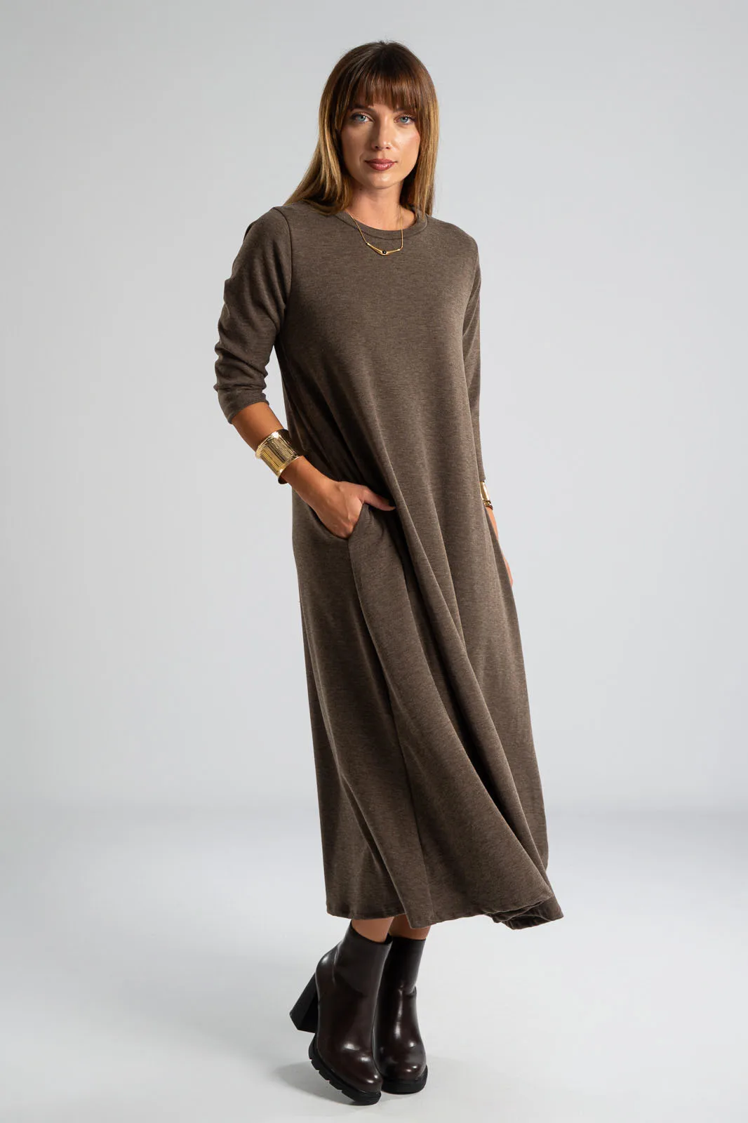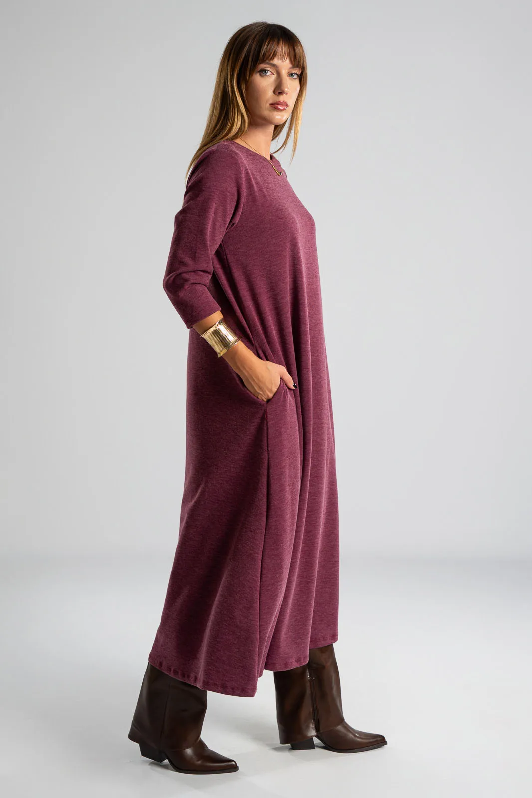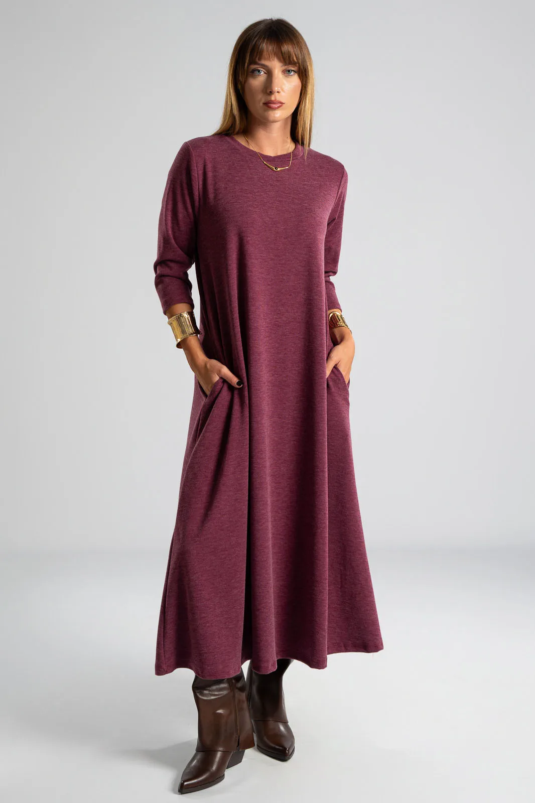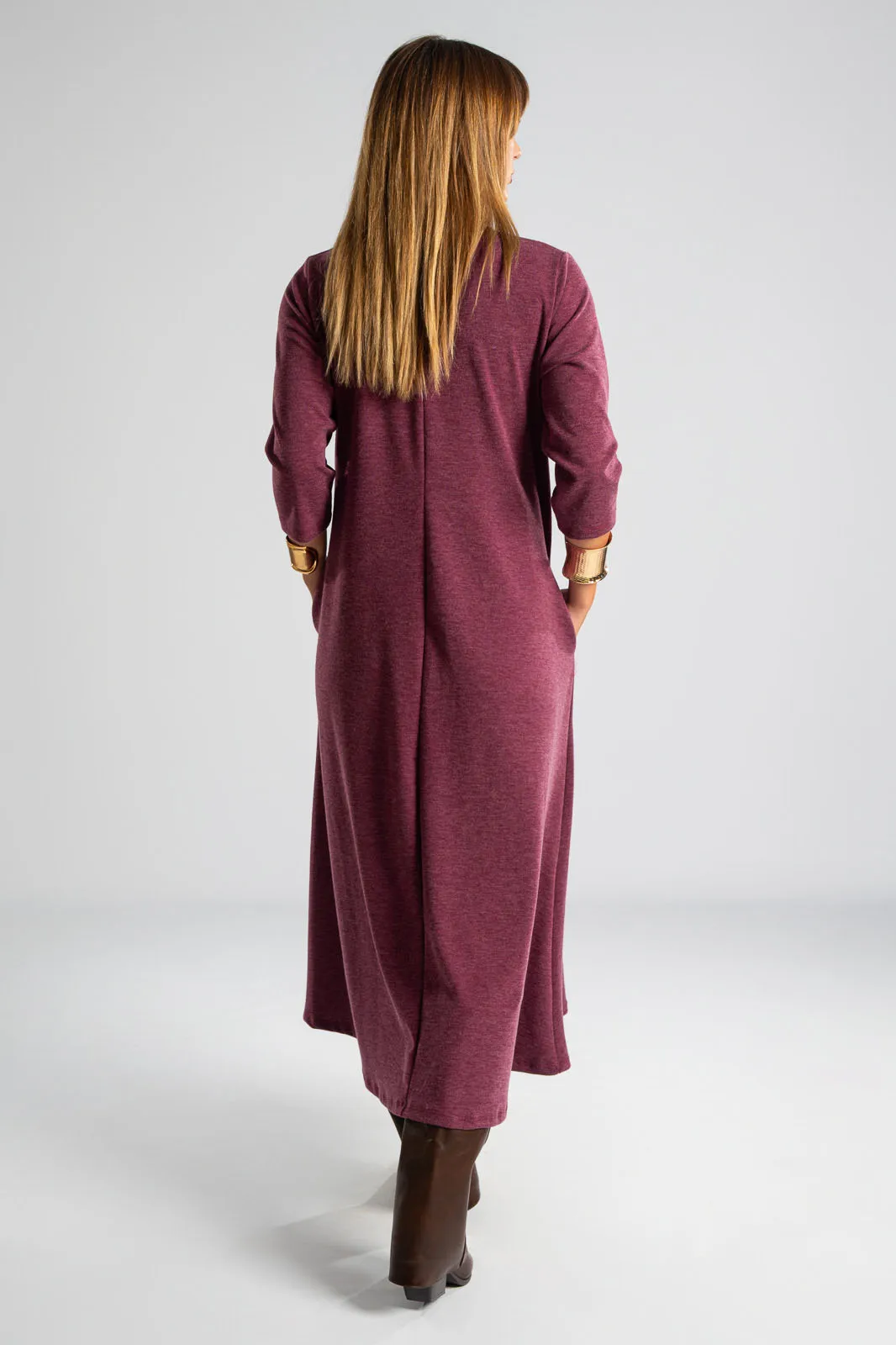 Φόρεμα με στρογγυλή λαιμόκοψη. Τα μανίκια είναι 3/4 και είναι σε Α γραμμή. Στα πλαινά διαθέτει τσέπες. Το ύφασμα του είναι πολύ μαλακό. Οι μετρήσεις του πίνακα είναι αντιπροσωπευτικές για κάθε κωδικό. 69% polyester, 28%viscose, 3% elastan.