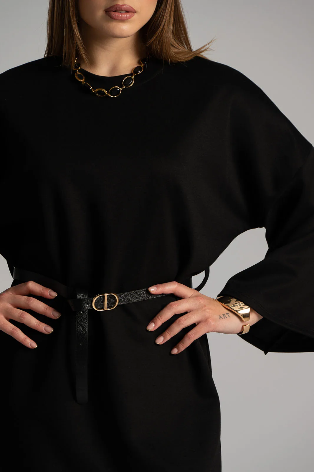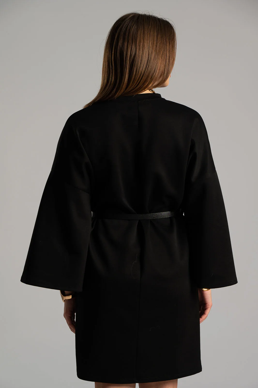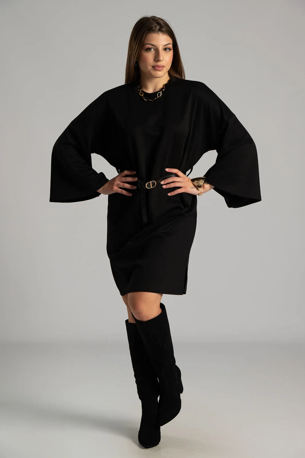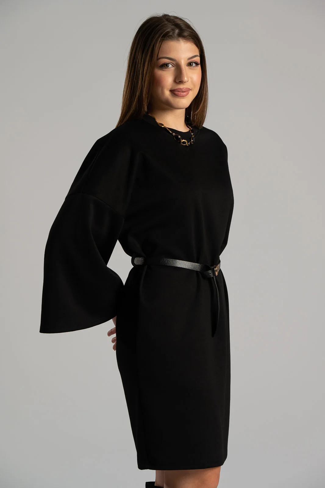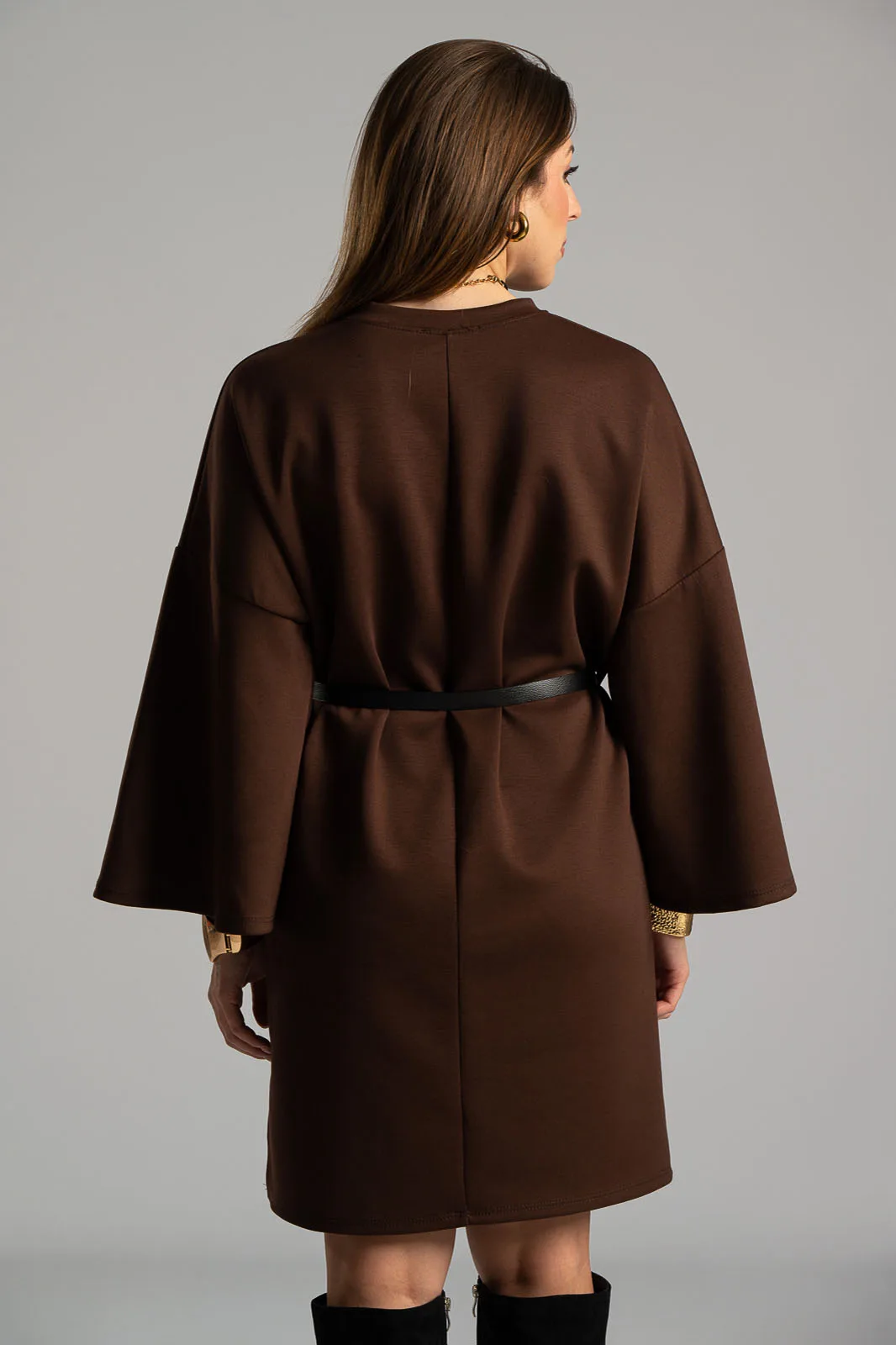 Φόρεμα με στρογγυλή λαιμόκοψη. Διαθέτει 3/4 μανίκια και είναι mini. Έχει δική του ζώνη για καλύτερη εφαρμογή. Στο κάτω πλαινό μέρος έχει μικρό άνοιγμα. Οι μετρήσεις του πίνακα είναι αντιπροσωπευτικές για κάθε προϊόν. 45% viscose,  50% polyester, 5% elastan.