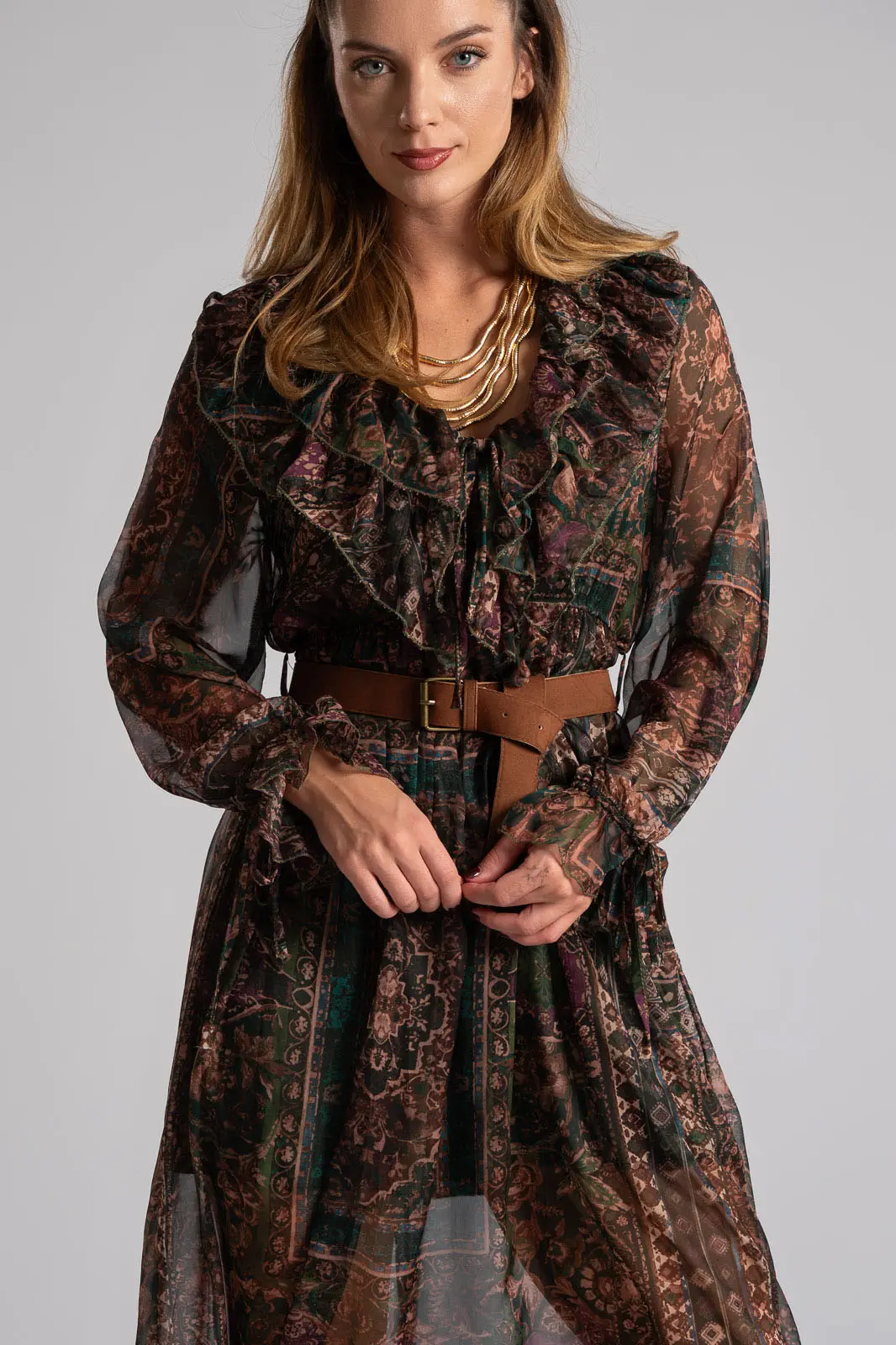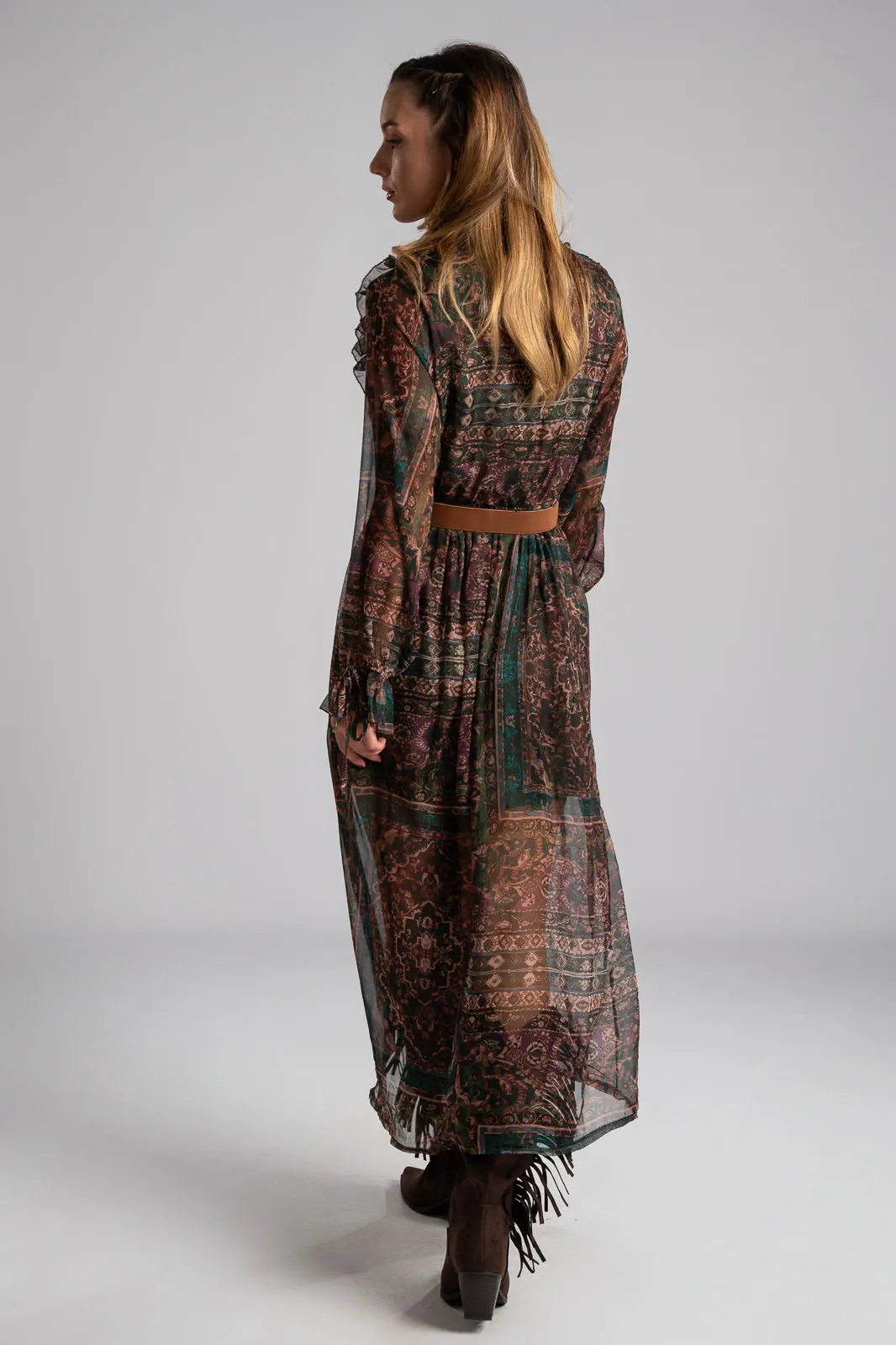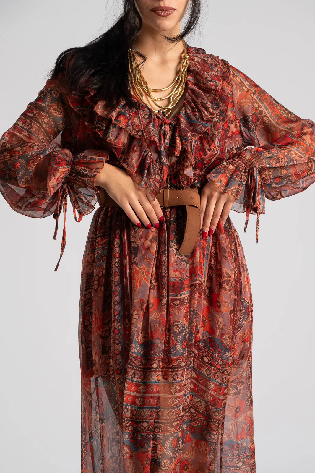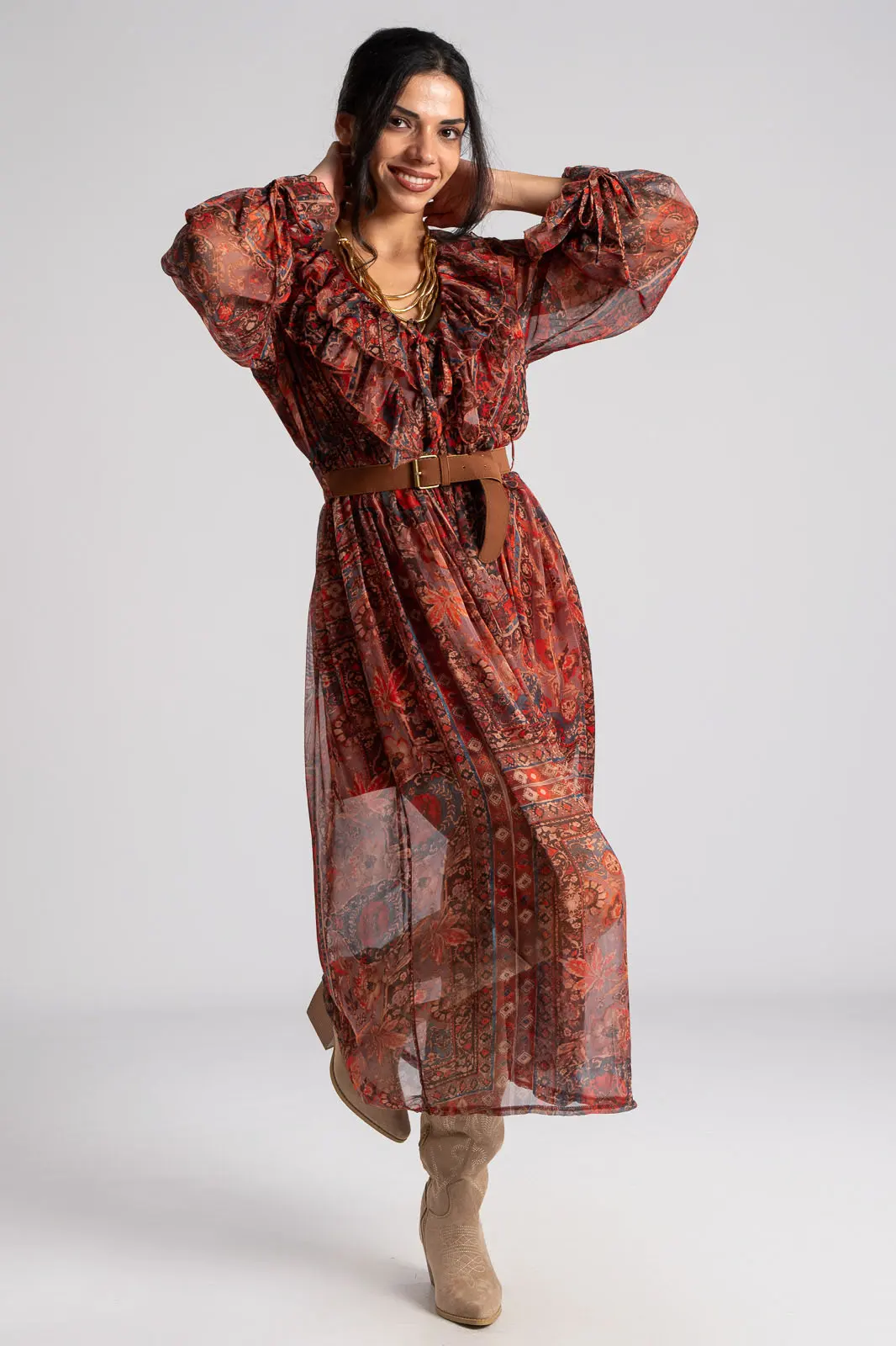Φόρεμα με V άνοιγμα στη λαιμόκοψη και διακοσμητικά βολάν περιμετρικά. Σε όλη την επιφάνεια έχει τούλινη όψη. Διαθέτει λάστιχο στη μέση για καλύτερη εφαρμογή. Έχει δική του ζώνη. Εσωτερικά είναι φοδραρισμένο. Οι μετρήσεις του πίνακα είναι αντιπροσωπευτικές για κάθε προϊόν. 100% polyester.