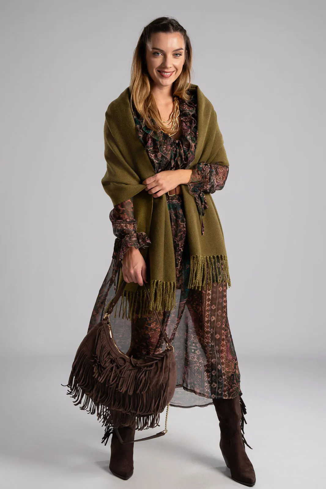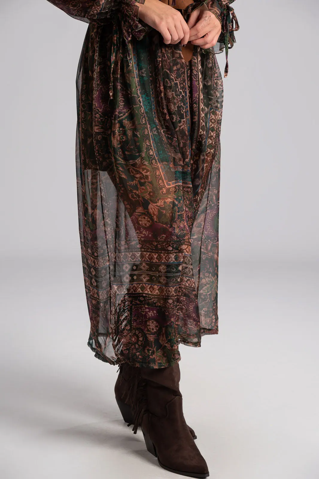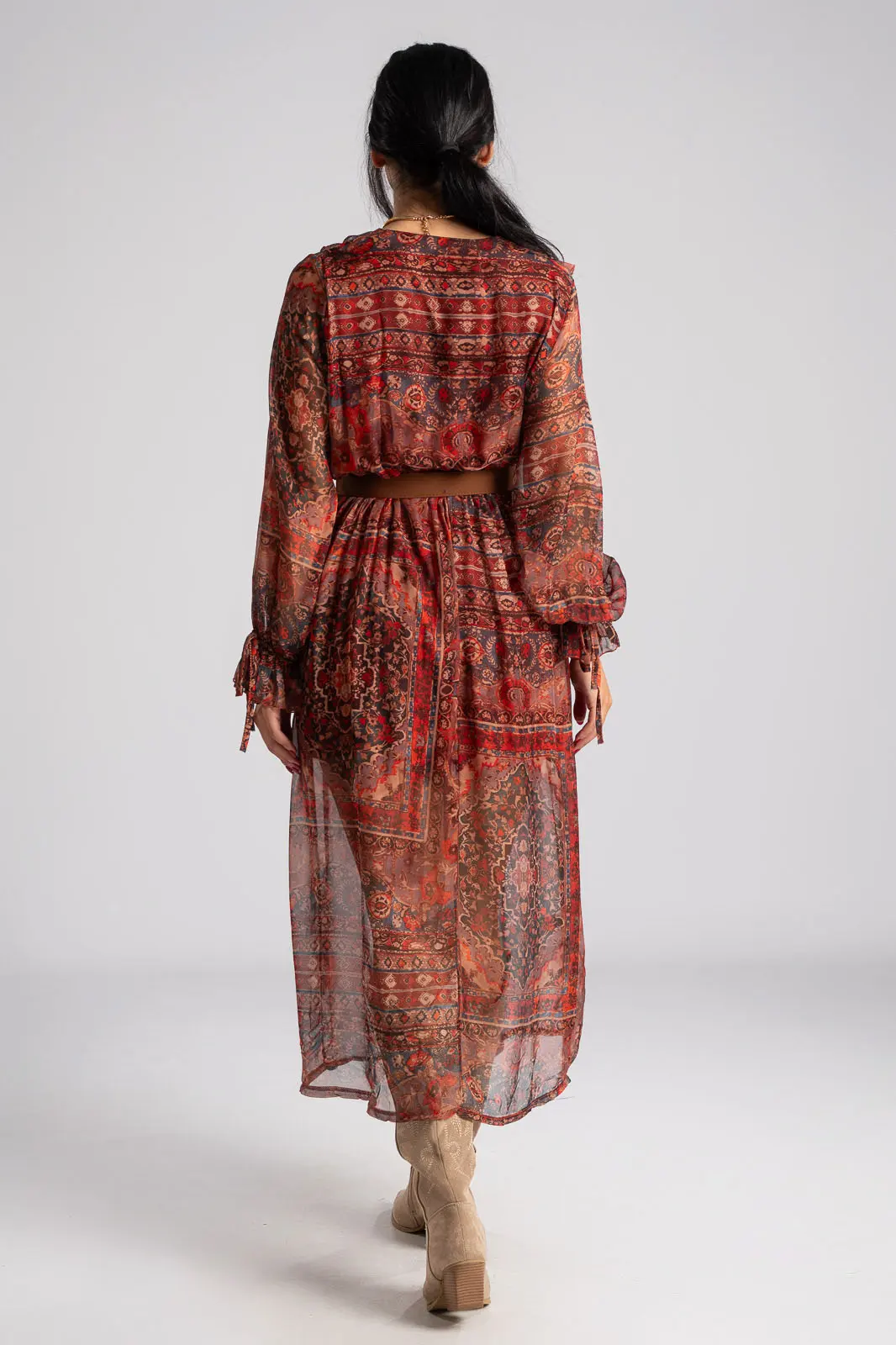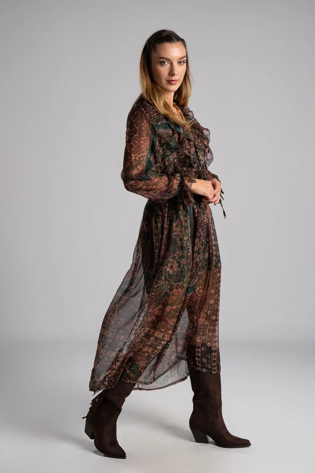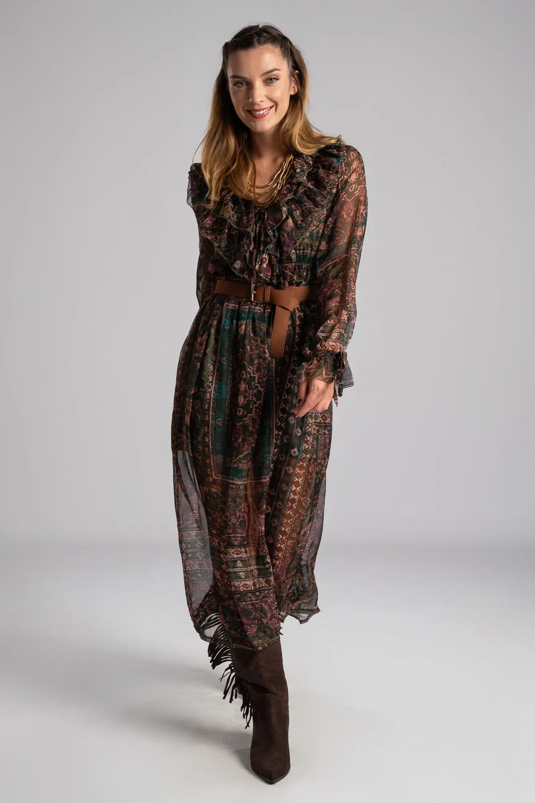 Φόρεμα με V άνοιγμα στη λαιμόκοψη και διακοσμητικά βολάν περιμετρικά. Σε όλη την επιφάνεια έχει τούλινη όψη. Διαθέτει λάστιχο στη μέση για καλύτερη εφαρμογή. Έχει δική του ζώνη. Εσωτερικά είναι φοδραρισμένο. Οι μετρήσεις του πίνακα είναι αντιπροσωπευτικές για κάθε προϊόν. 100% polyester.
