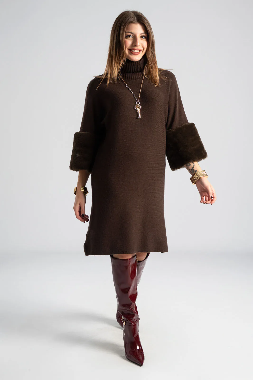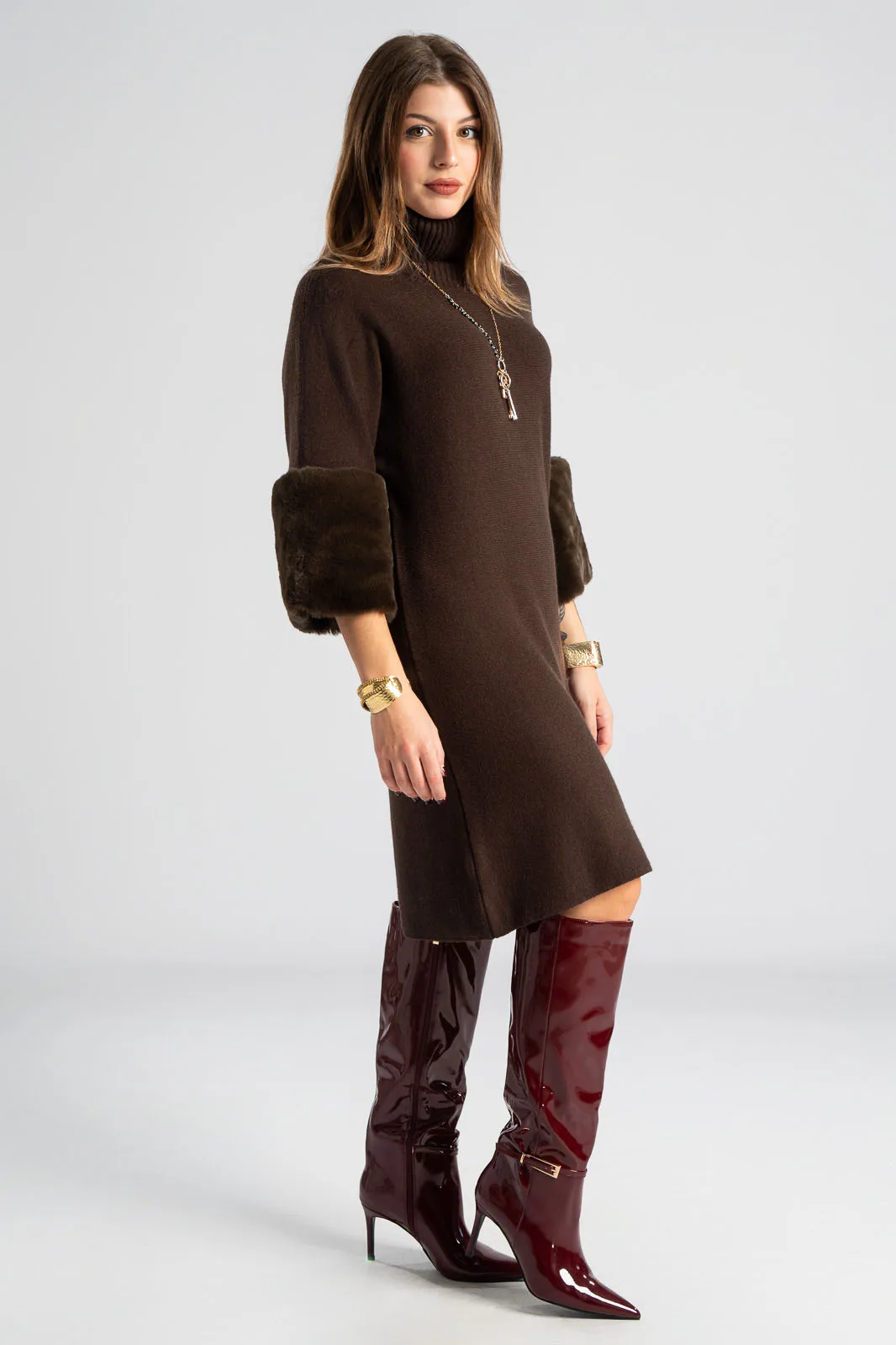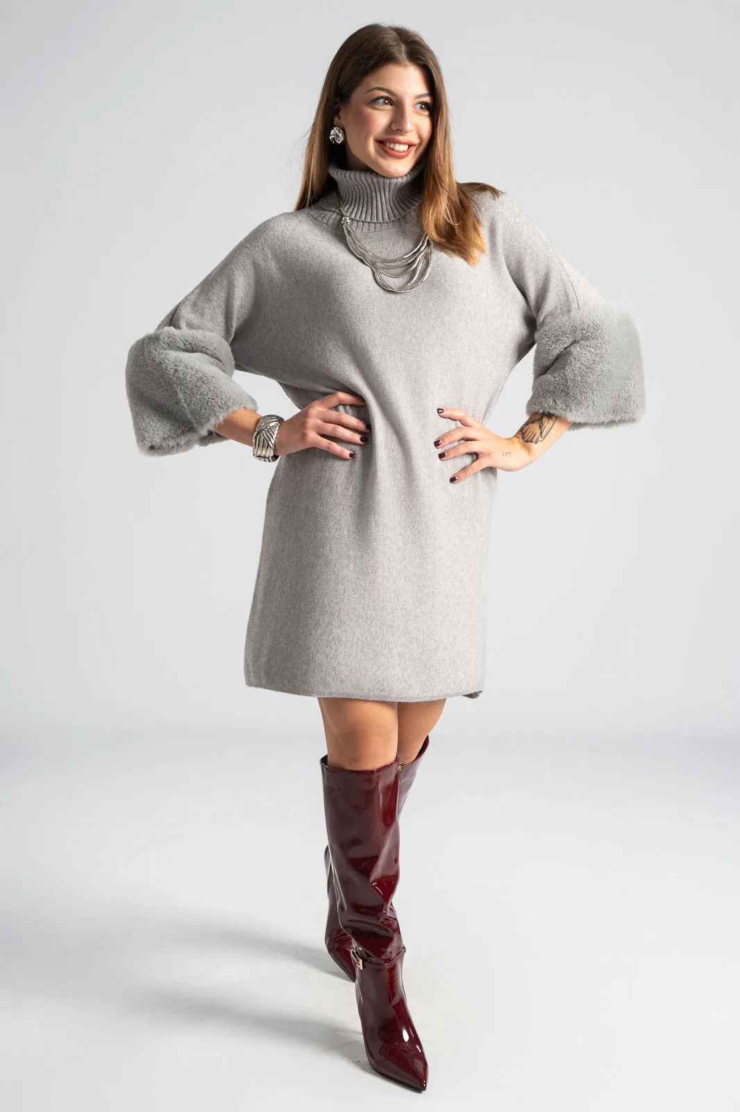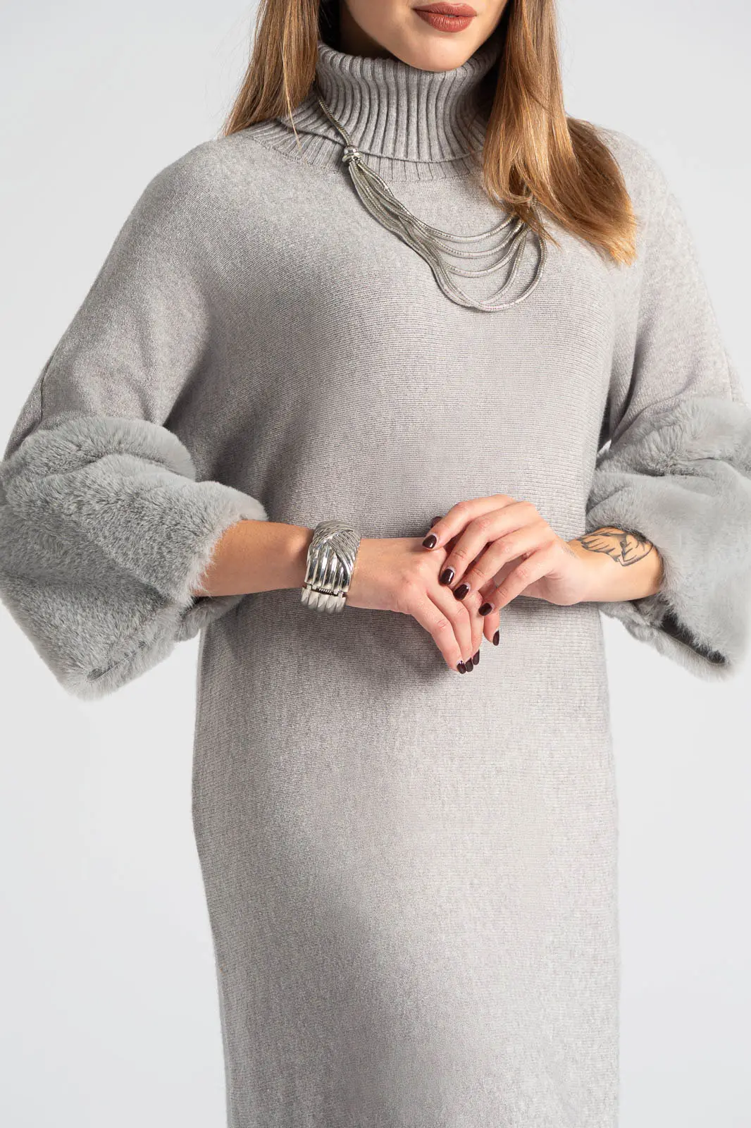 Φόρεμα νημάτινο με ζιβάγκο. Έχει 3/4 μανίκια που καταλήγουν σε έντονη συνθετική γούνα στην ίδια απόχρωση. Οι μετρήσεις του πίνακα είναι αντιπροσωπευτικές για κάθε προϊόν. 28% polyester, 50% viscose, 22% polyamide.